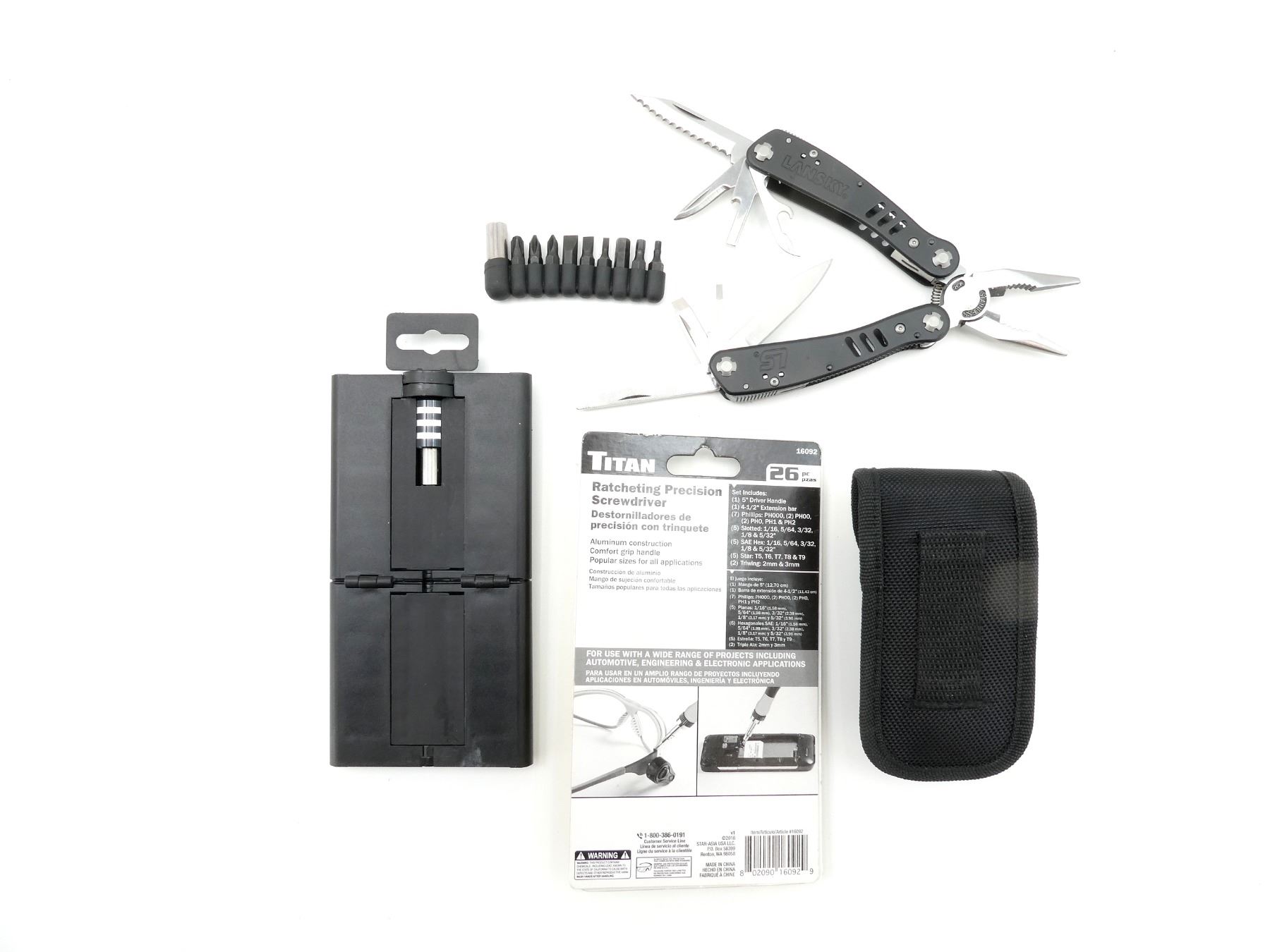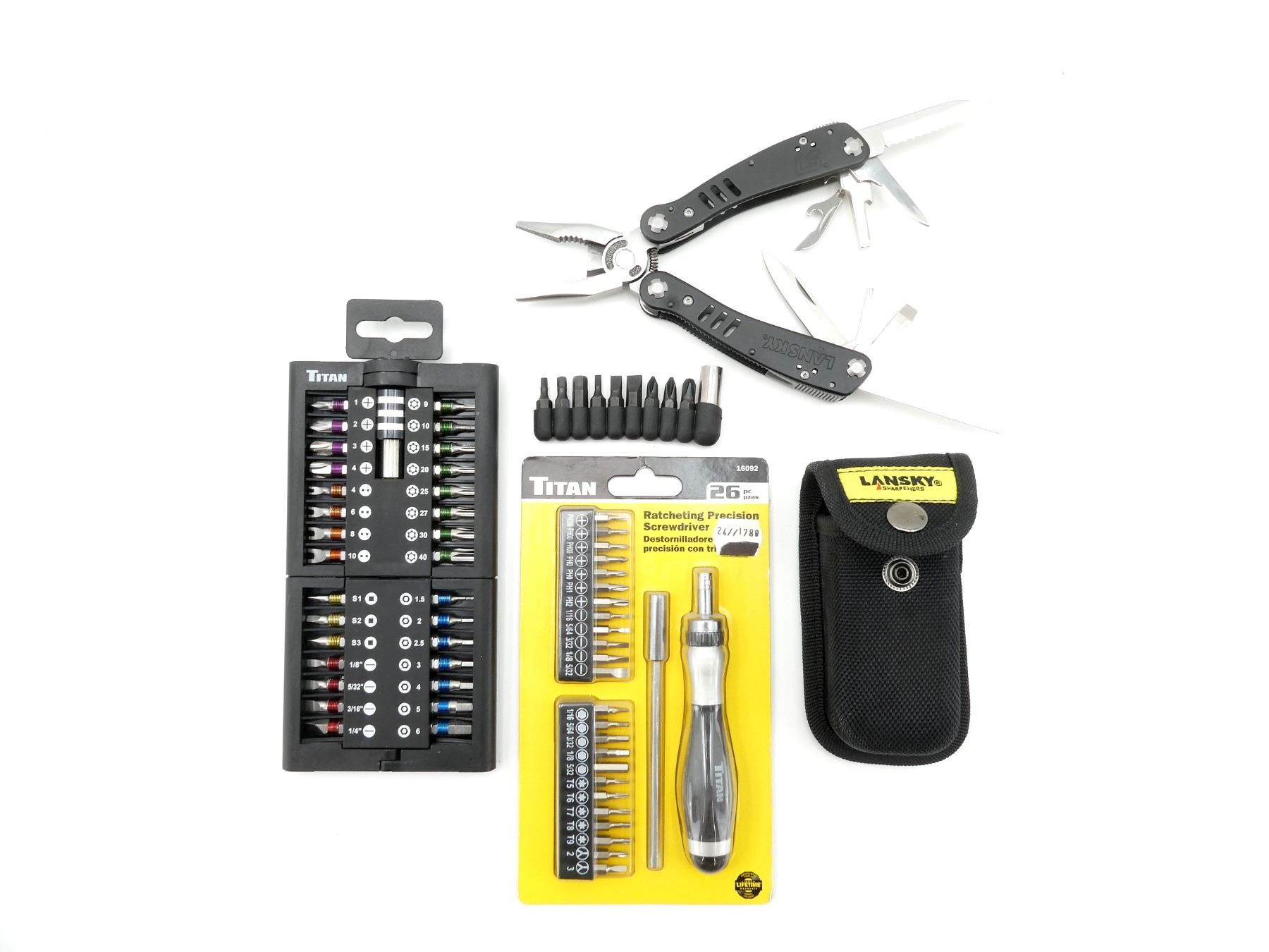 LOT INCLUDES; (1) TITAN RATCHETING PRECISION SCREWDRIVER, 26-PIECE SET, MODEL #: 16092, INCLUDES; DRIVER HANDLE, EXTENSION BAR, VARIOUS BITS FOR PHILLIPS / SLOTTED / HEX, ETC., NEW OLD STOCK, SEALED IN ORIGINAL PACKAGING, (1) TITAN SCREWDRIVER BIT SET, VARIOUS FASTENER TYPES, WITH COLOUR-CODED BITS & COMPACT FOLDABLE CASE, NEW OLD STOCK & (1) LANSKY SHARPENERS MULTI-TOOL SWITCHPLIER, INCLUDES; PLIERS, BLADES, FILE, ETC., WITH SCREWDRIVER BITS & BLACK NYLON CARRY CASE, APPEARS NEW OLD STOCK. SEE PHOTOS.