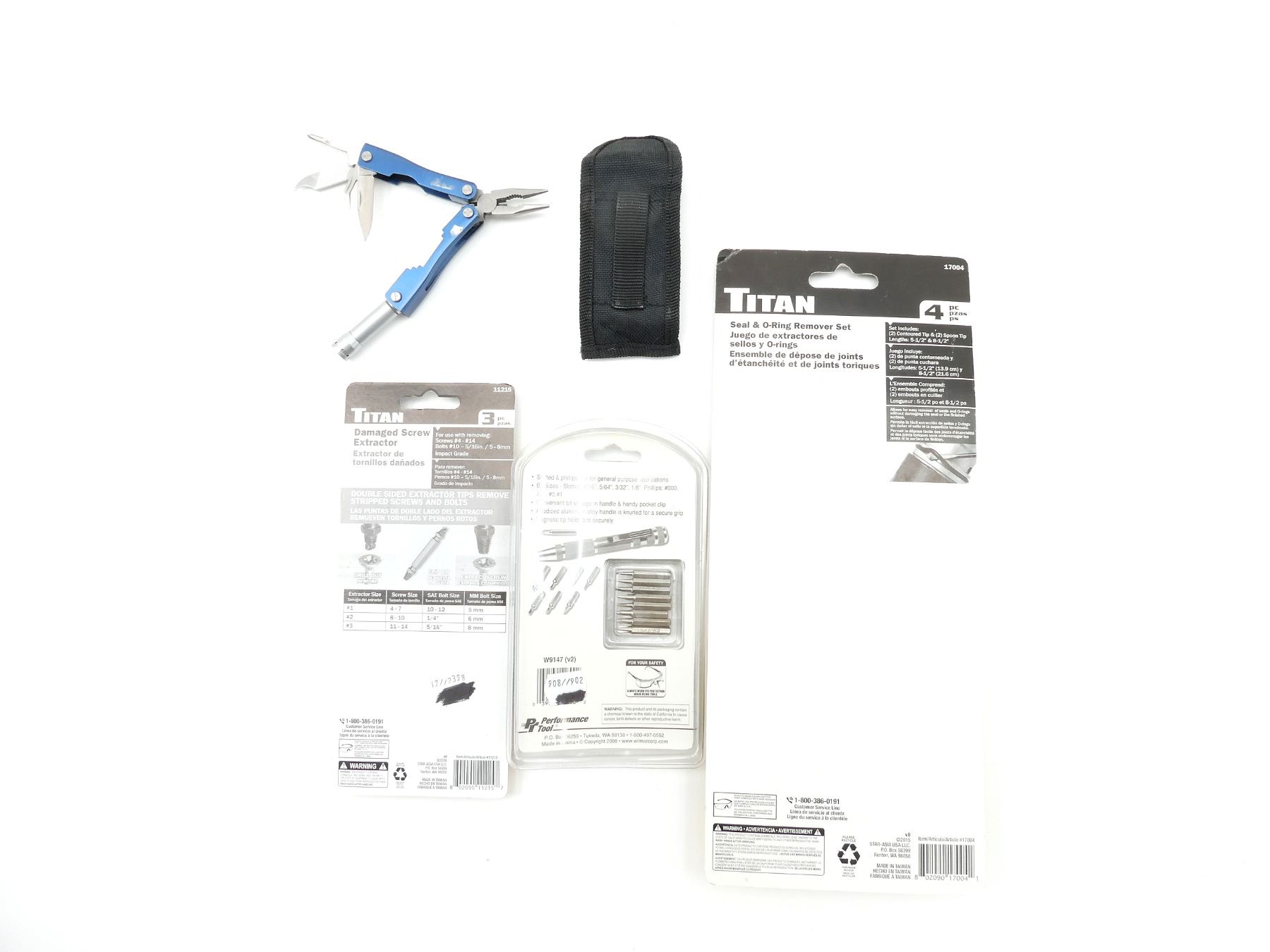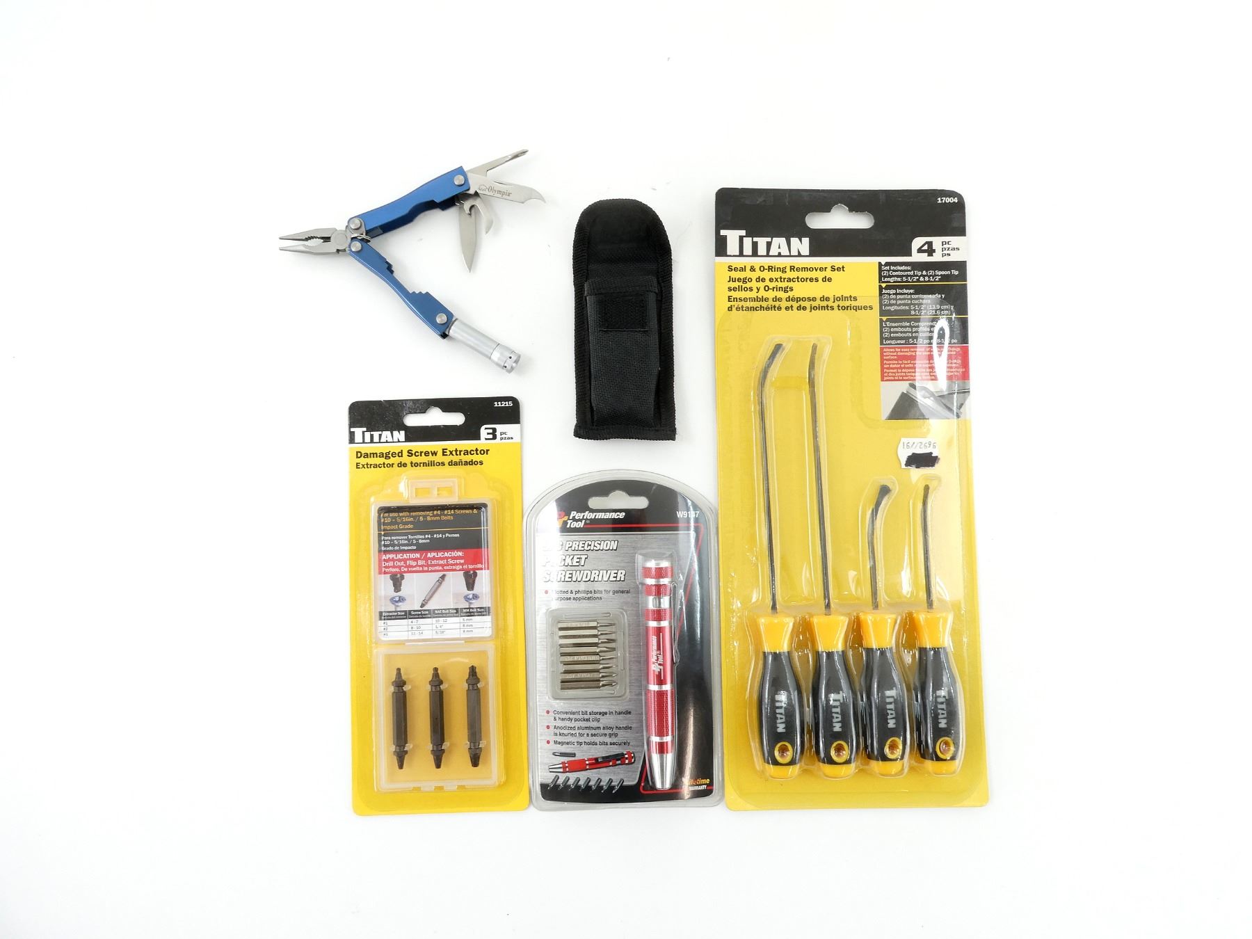 LOT INCLUDES; (1) PERFORMANCE TOOL 9-PIECE PRECISION POCKET SCREWDRIVER, WITH SLOTTED / PHILLIPS BITS, MODEL #: W9147, NEW OLD STOCK, SEALED IN ORIGINAL PACKAGING, (1) TITAN DAMAGED SCREW EXTRACTOR, 3-PIECE SET, MODEL #: 11215, NEW OLD STOCK, SEALED IN ORIGINAL PACKAGING & (1) TITAN SEAL & O-RING REMOVER SET, 4-PIECE SET, MODEL #: 17004, INCLUDES CONTOURED & SPOON TIPS, NEW OLD STOCK, SEALED IN ORIGINAL PACKAGING, ETC. SEE PHOTOS.