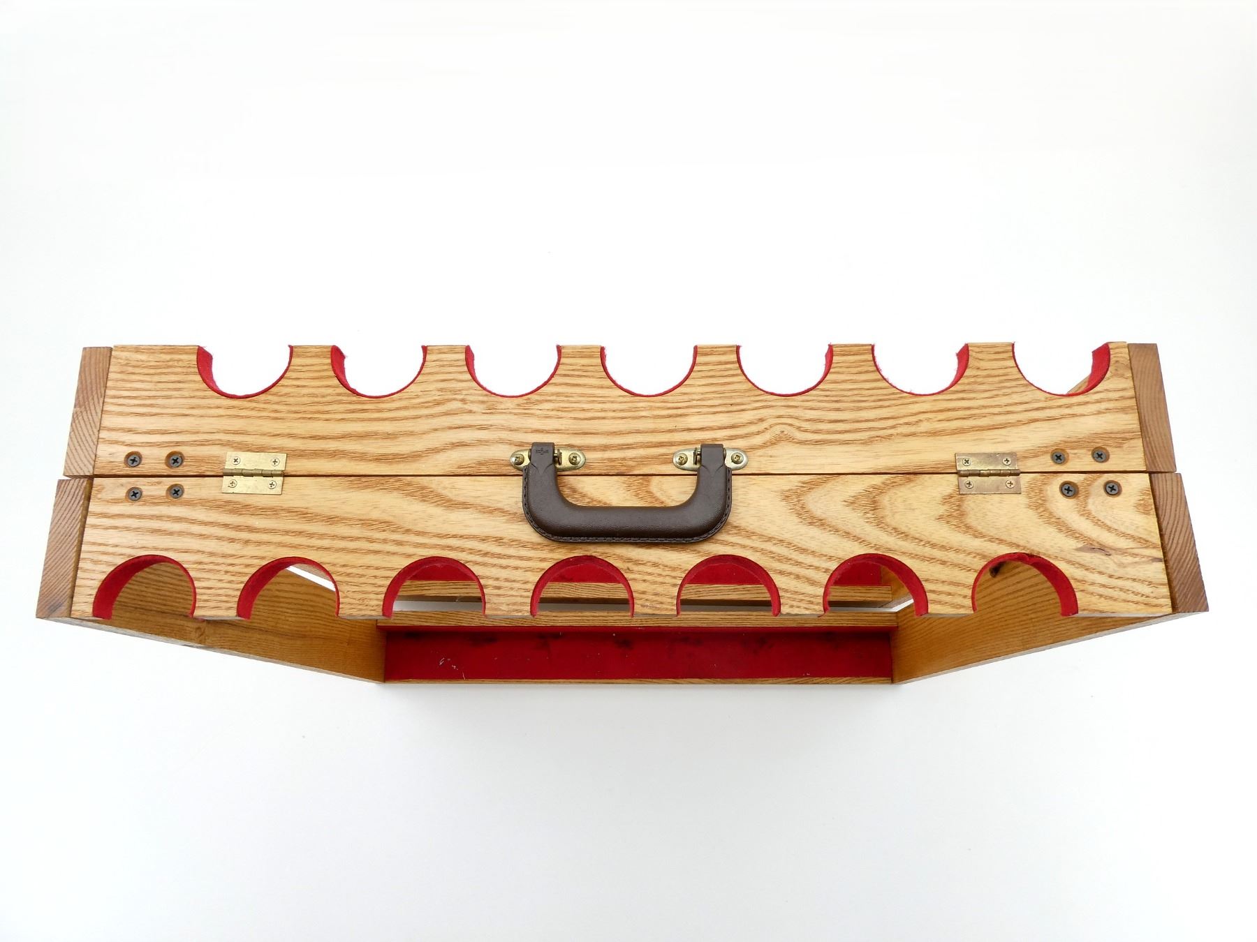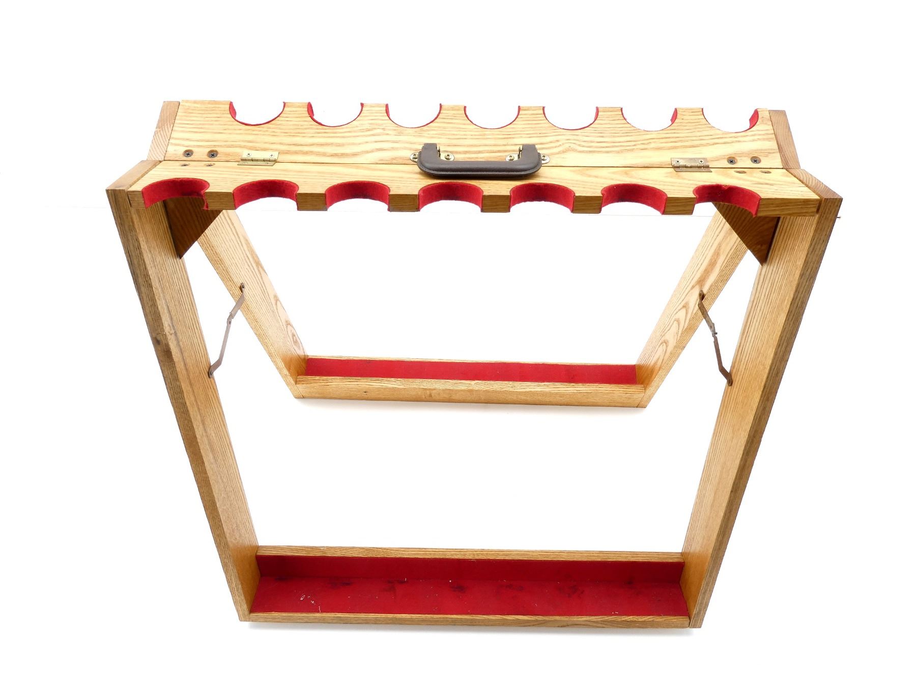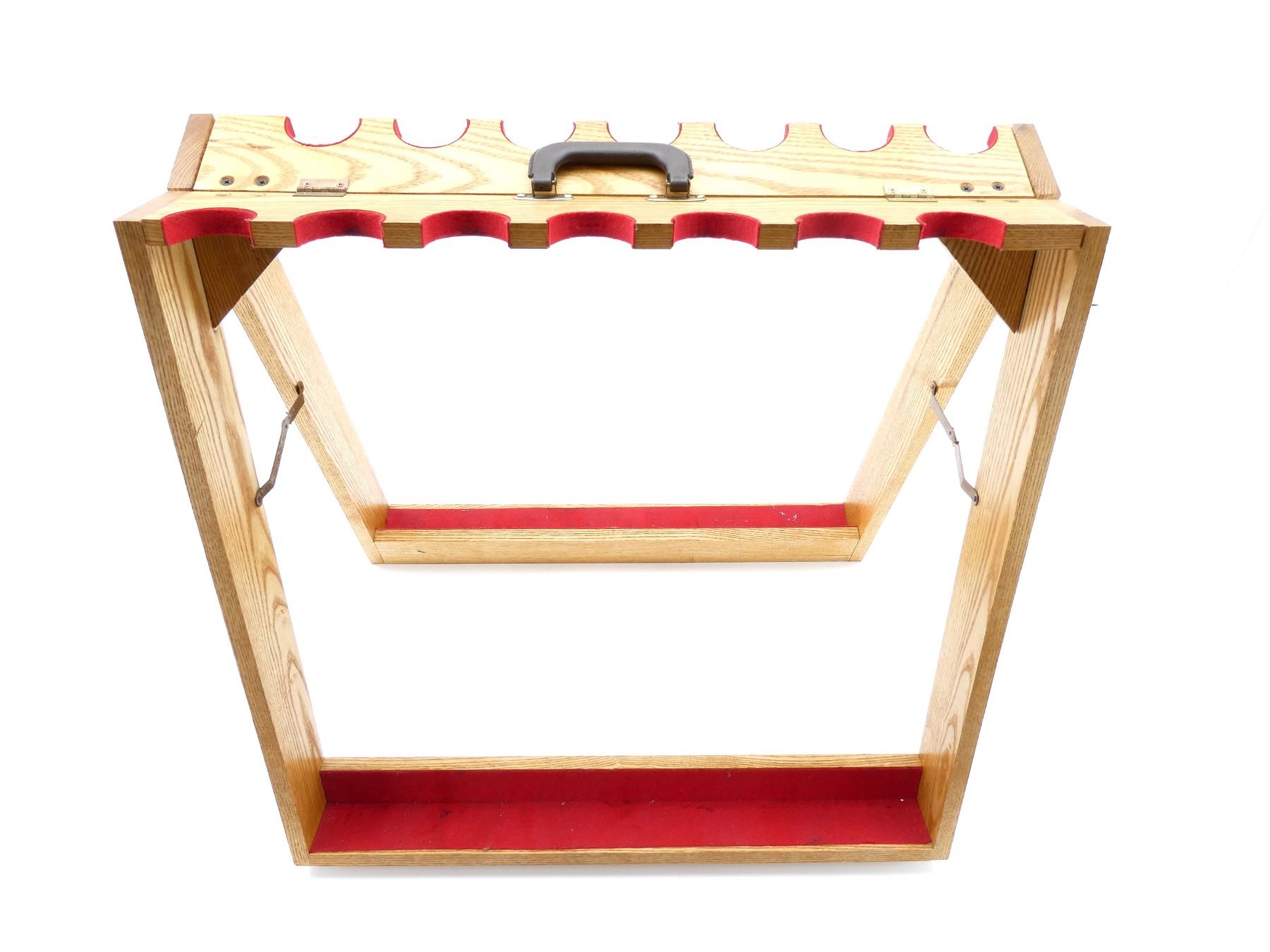(1) 14-RIFLE TABLE-TOP GUN RACK, WOOD CONSTRUCTION WITH RED FELT, FOLDING WITH CARRYING HANDLE, APPROX. 28" X 7" X 27.25". SEE PHOTOS. *MAY REQUIRE ADDITIONAL SHIPPING CHARGES*