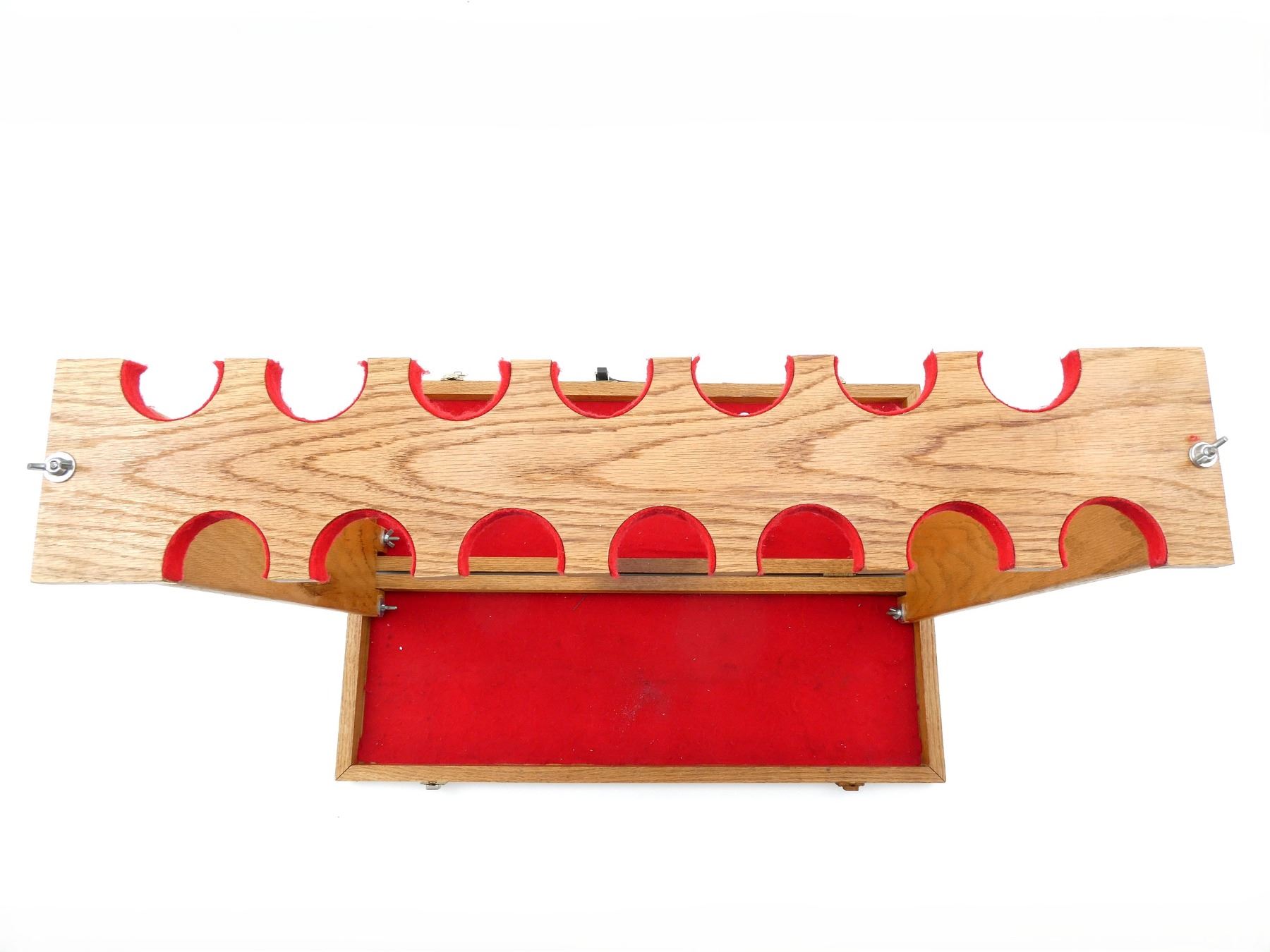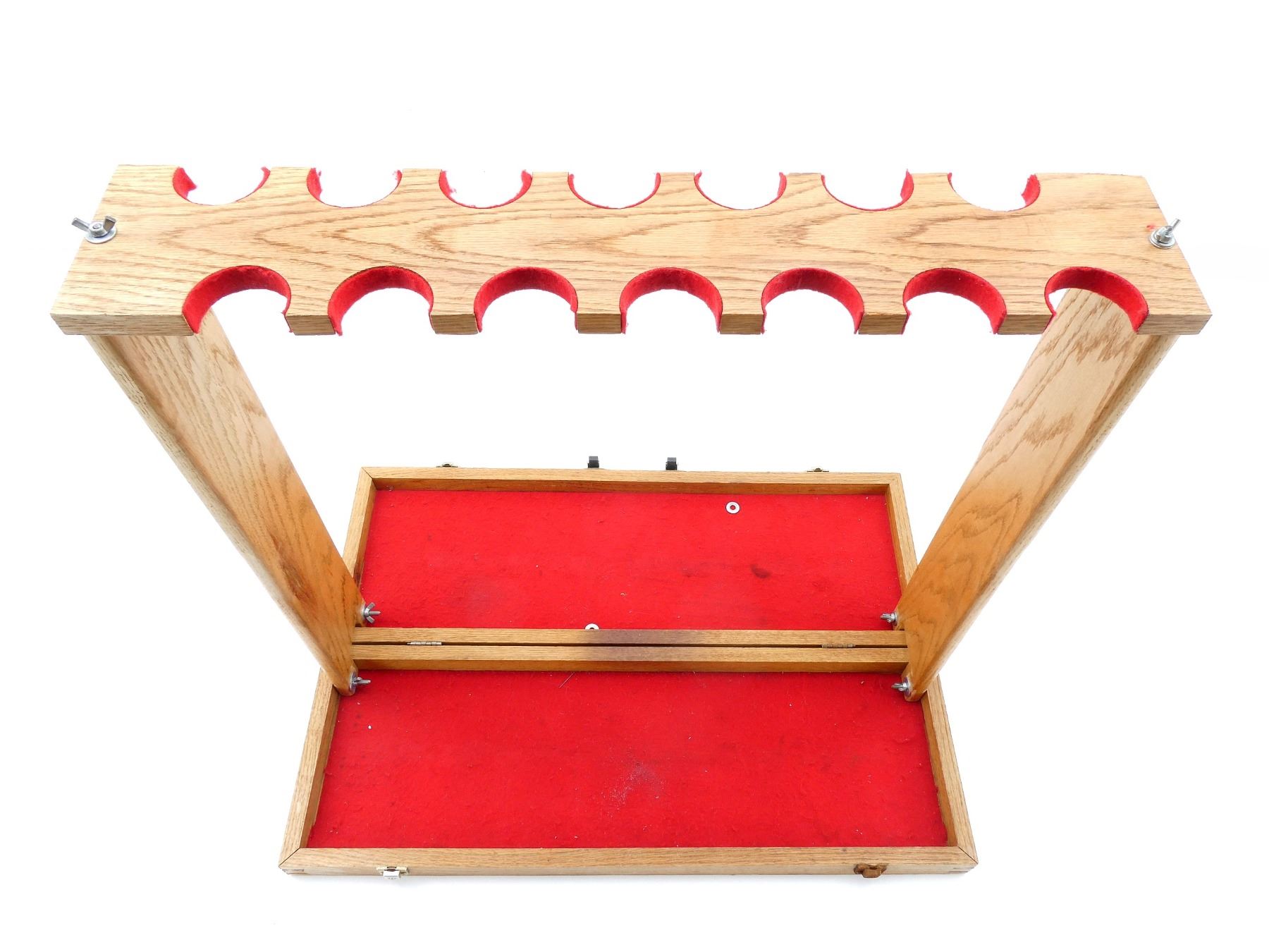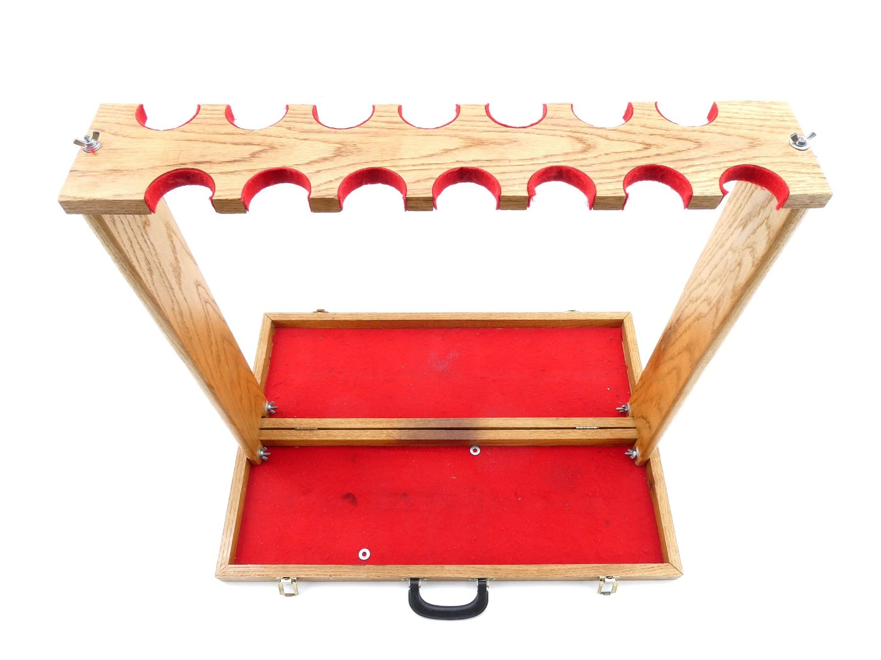 (1) 14-RIFLE TABLE-TOP GUN RACK, WOOD CONSTRUCTION WITH RED FELT, FOLDING WITH CARRYING HANDLE, MISSING WEDGES, OPENED APPROX. 30.25" X 20.75" X 27.75" / FOLDED APPROX. 30.25" X 10.25" X 3.25". SEE PHOTOS.