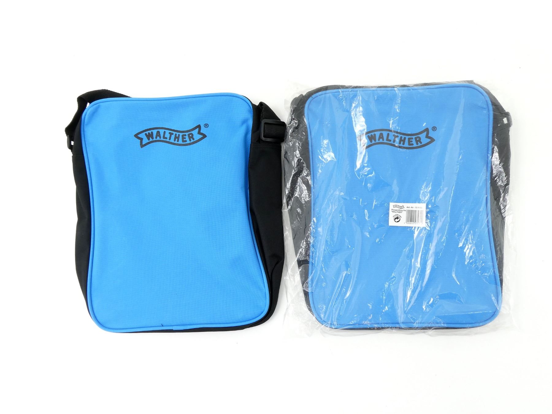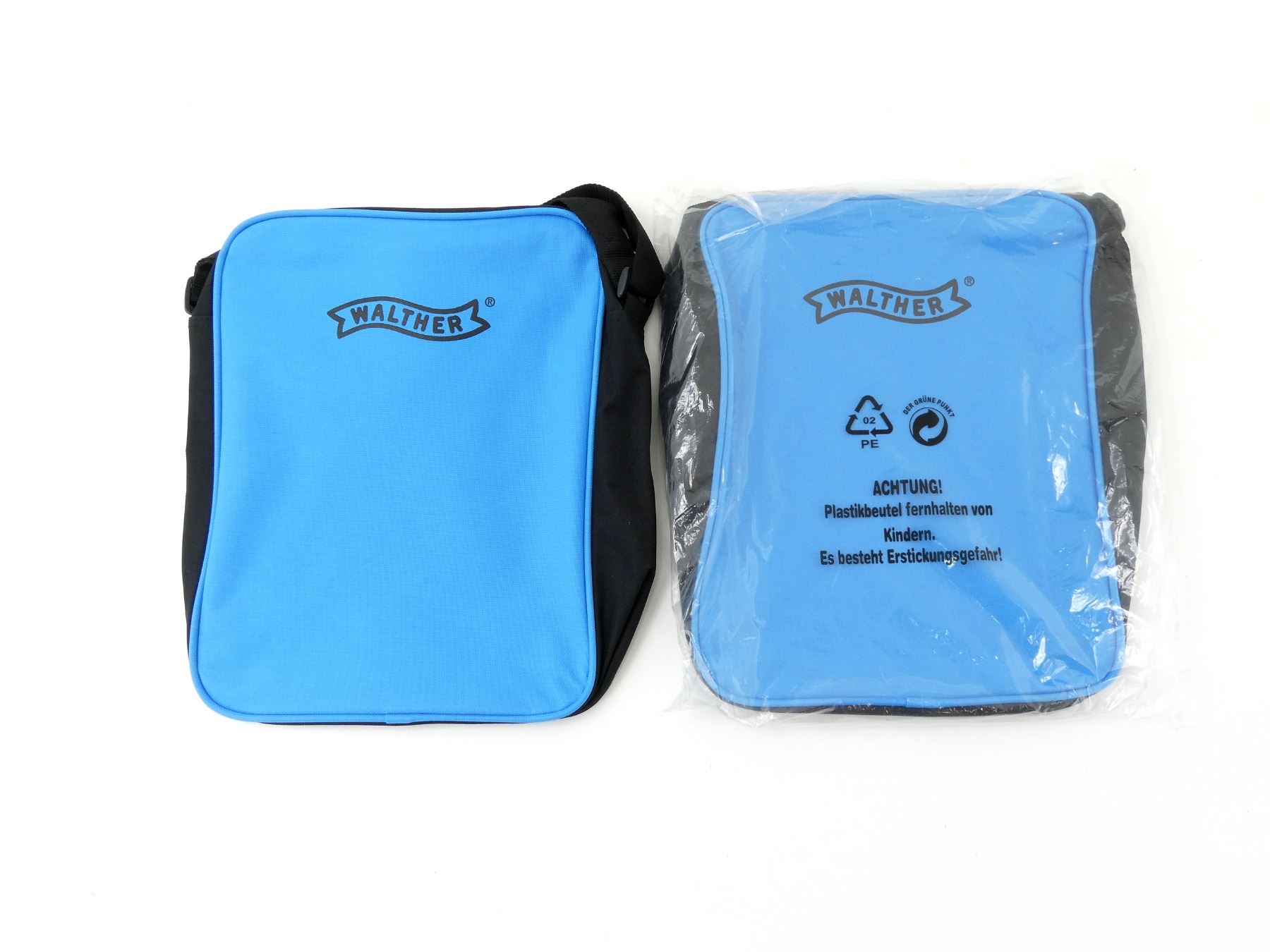 LOT INCLUDES; (2) CARRY BAGS, BLUE & BLACK WITH SHOULDER STRAP, MARKED: "WALTHER", APPEARS NEW OLD STOCK, APPROX. 10 7/8" X 3 1/8" X 14". SEE PHOTOS.
