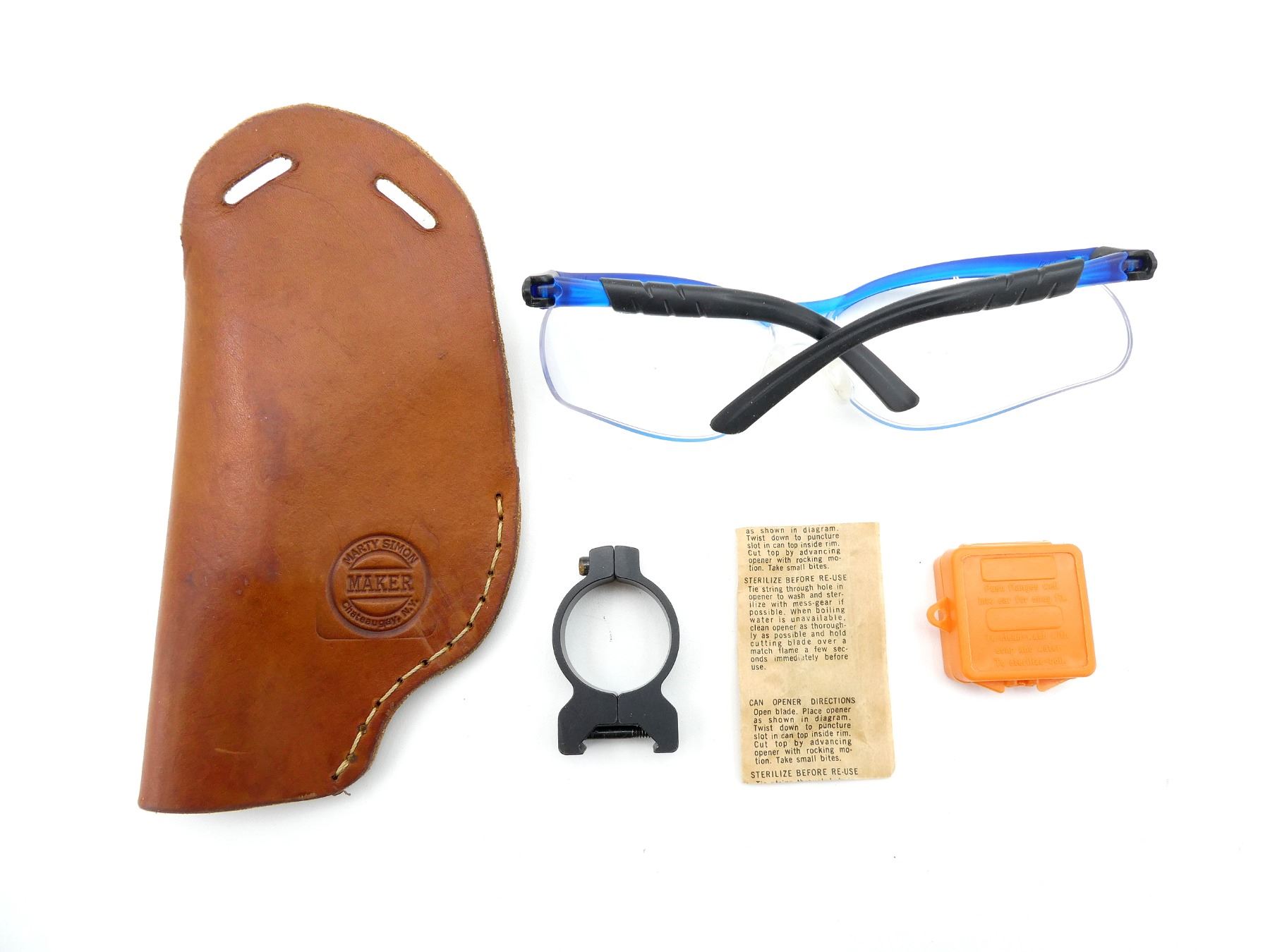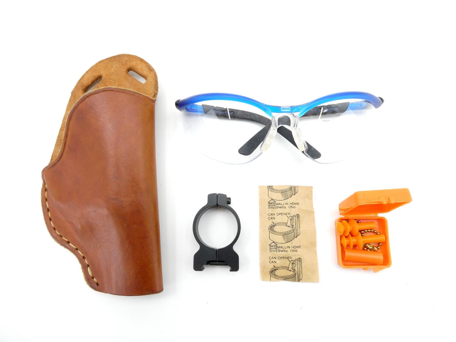 LOT INCLUDES; (1) BROWN LEATHER RIGHT HAND HOLSTER, FITS SMALL FRAME TYPE REVOLVERS / ETC., MARKED: "MARTY SIMON", ETC., (1) PAIR OF SAFETY GLASSES, (1) SET OF COM-FIT EAR PLUGS WITH CARRYING CASE, (1) UNKNOWN 30MM SCOPE RING, UNMARKED, (1) MALLIN HDWE CAN OPENER, APPEARS NEW OLD STOCK IN ORIGINAL SEALED PACKAGING. SEE PHOTOS.