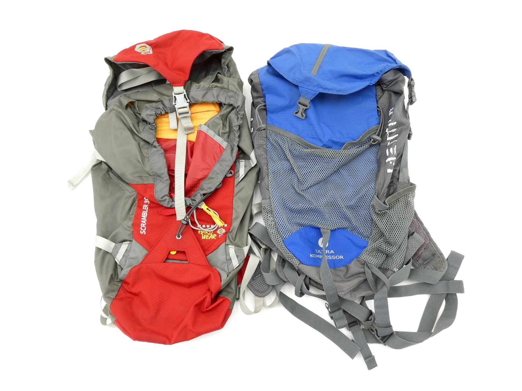 LOT INCLUDES; (1) MOUNTAIN HARD WEAR SCRAMBLER 30 BACK PACK, RED & GREY, APPROX. 8.5" X 6" X 19.5" & (1) MOUNTAIN ULTRA KOMRESSOR BACK PACK, BLUE & GREY, APPROX. 9" X 5" X 17.5". SEE PHOTOS.