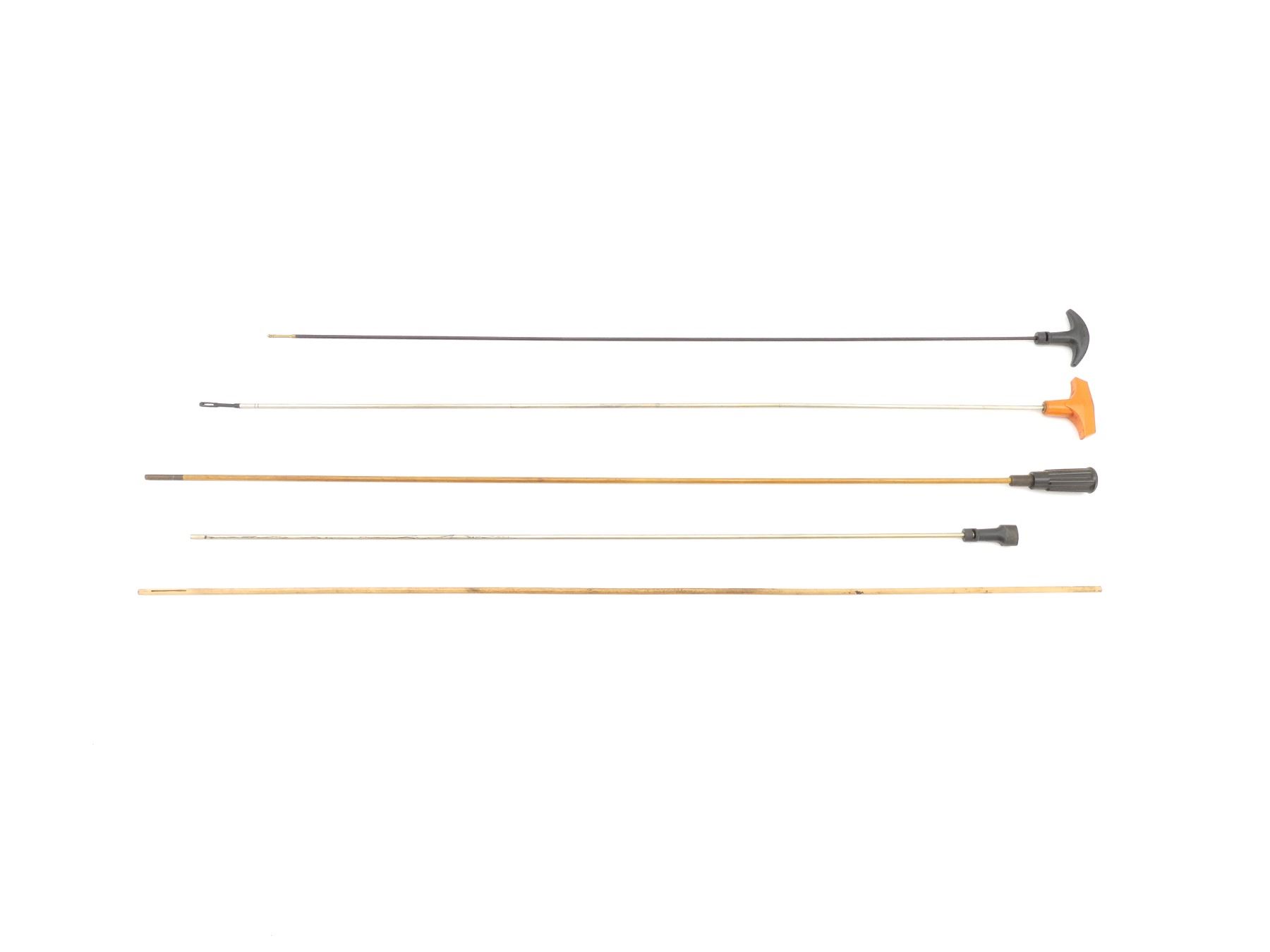 LOT INCLUDES; (5) ASSORTED CLEANING RODS, METAL / WOOD CONSTRUCTION WITH POLYMER HANDLES (ONE MISSING HANDLE), RODS HAVE VARIOUS THICKNESS', OVERALL LENGTH'S APPROX. 32.75" TO 37.75", SOME MAY NOT BE COMPLETE. SEE PHOTOS.