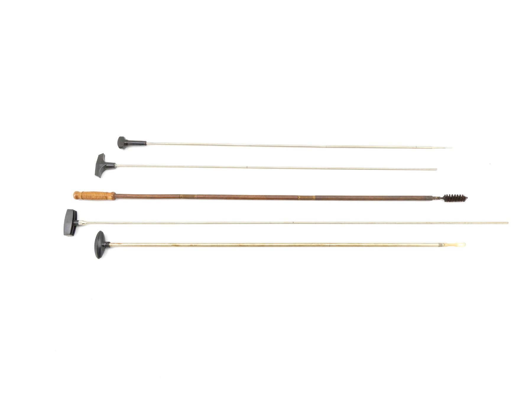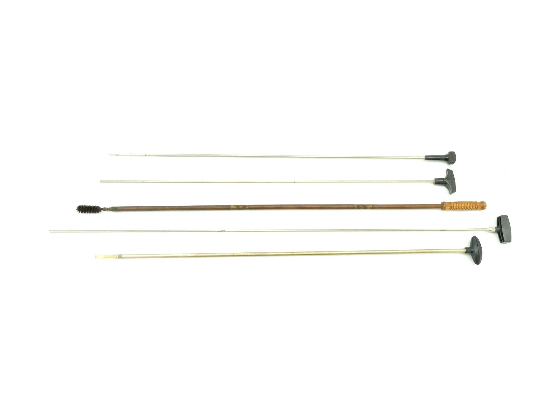 LOT INCLUDES; (5) ASSORTED CLEANING RODS, METAL / WOOD CONSTRUCTION WITH POLYMER / WOOD HANDLES, RODS HAVE VARIOUS THICKNESS', OVERALL LENGTH'S APPROX. 34" TO 43.25", SOME MAY NOT BE COMPLETE. SEE PHOTOS.