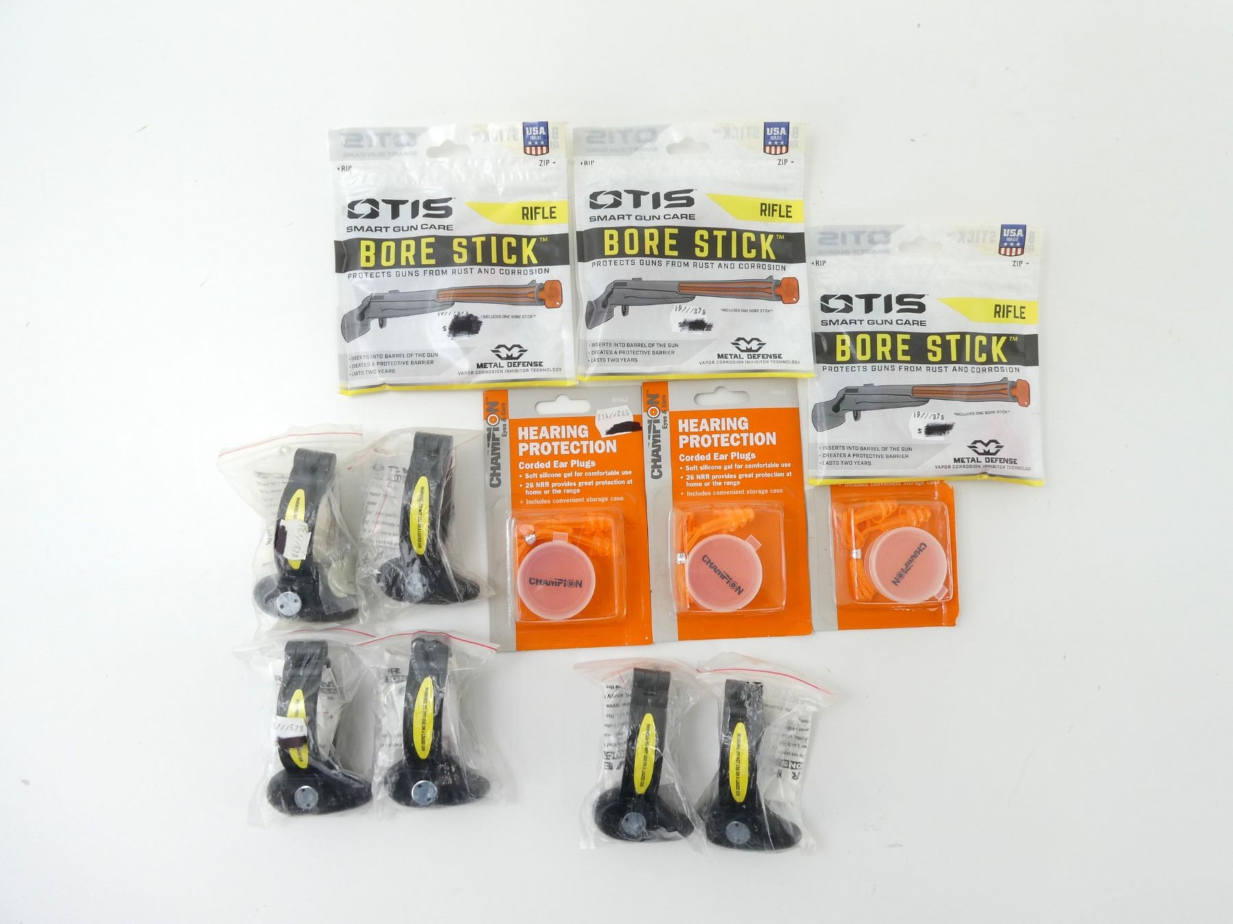 LOT INCLUDES; (6) LEVER HAMMER LOCKS, APPEARS NEW OLD STOCK, IN ORIGINAL PACKAGING WITH INSTRUCTIONS, (3) OTIS RIFLE BORE STICK, PROTECTS GUNS FROM RUST & CORROSION, NEW OLD STOCK, SEALED IN ORIGINAL PACKAGING & (3) CHAMPION CORDED EAR PLUGS, NEW OLD STOCK, SEALED IN ORIGINAL PACKAGING. SEE PHOTOS.