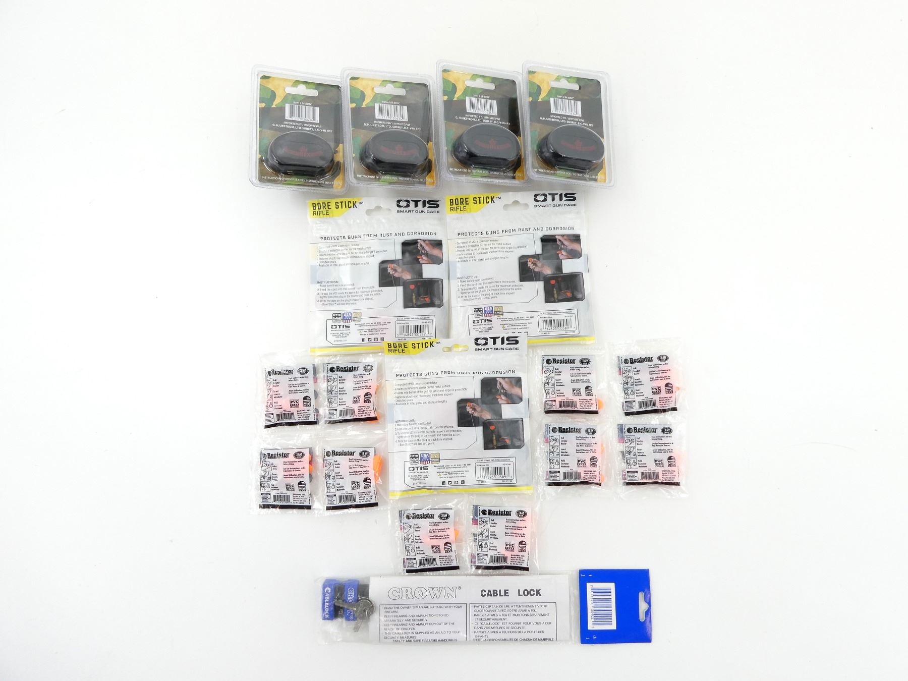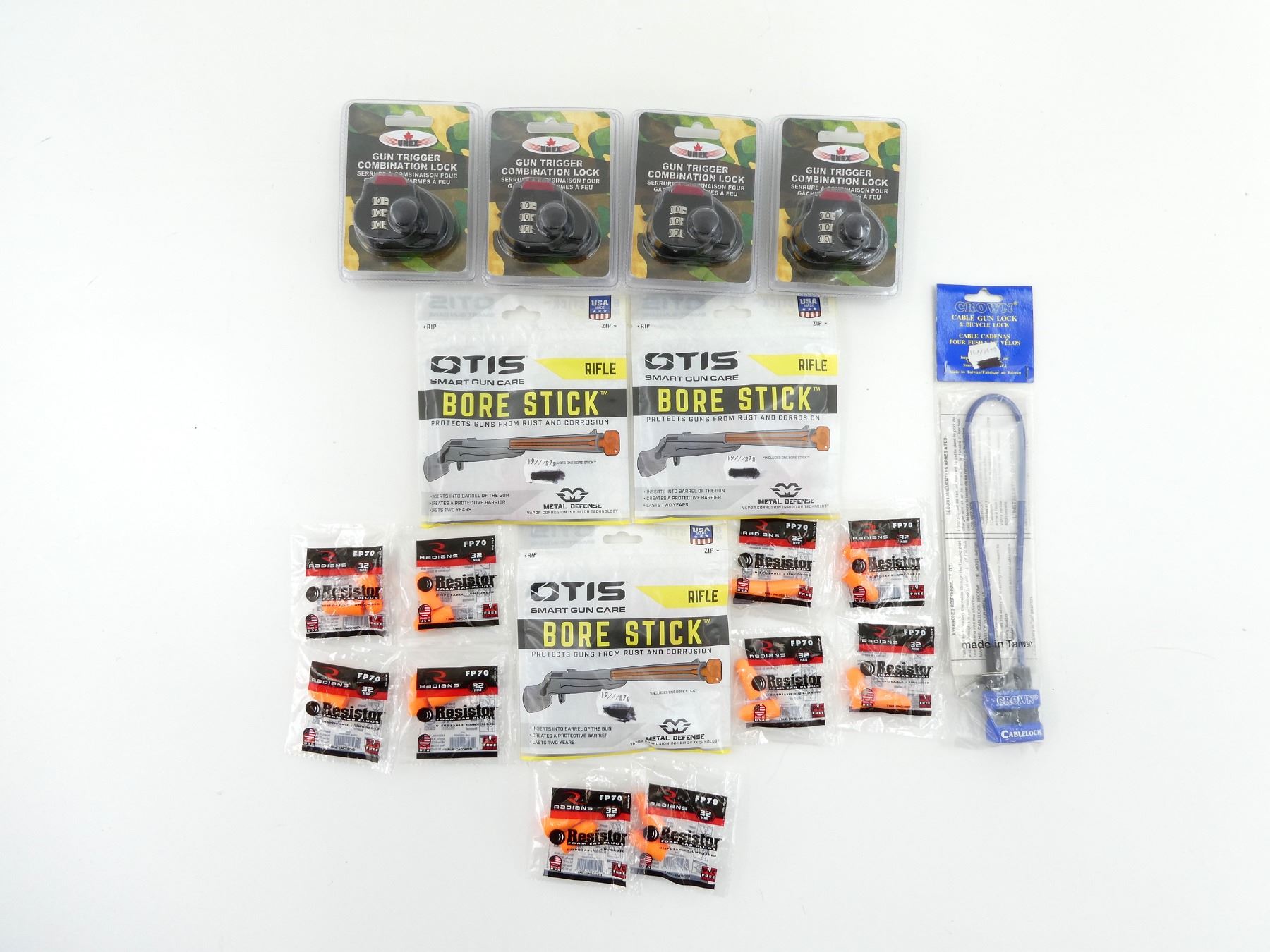 LOT INCLUDES; (4) UNEX GUN TRIGGER COMBINATION LOCK, ITEM #: M-802C, NEW OLD STOCK, SEALED IN ORIGINAL PACKAGING, (1) CROWN CABLE LOCK, NEW OLD STOCK, SEALED IN ORIGINAL PACKAGING, (3) OTIS RIFLE BORE STICK, PROTECTS GUNS FROM RUST & CORROSION, NEW OLD STOCK, SEALED IN ORIGINAL PACKAGING & (10) RADIANS RESISTOR FOAM EAR PLUGS, 32NRR, NEW OLD STOCK, SEALED IN ORIGINAL PACKAGING. SEE PHOTOS.