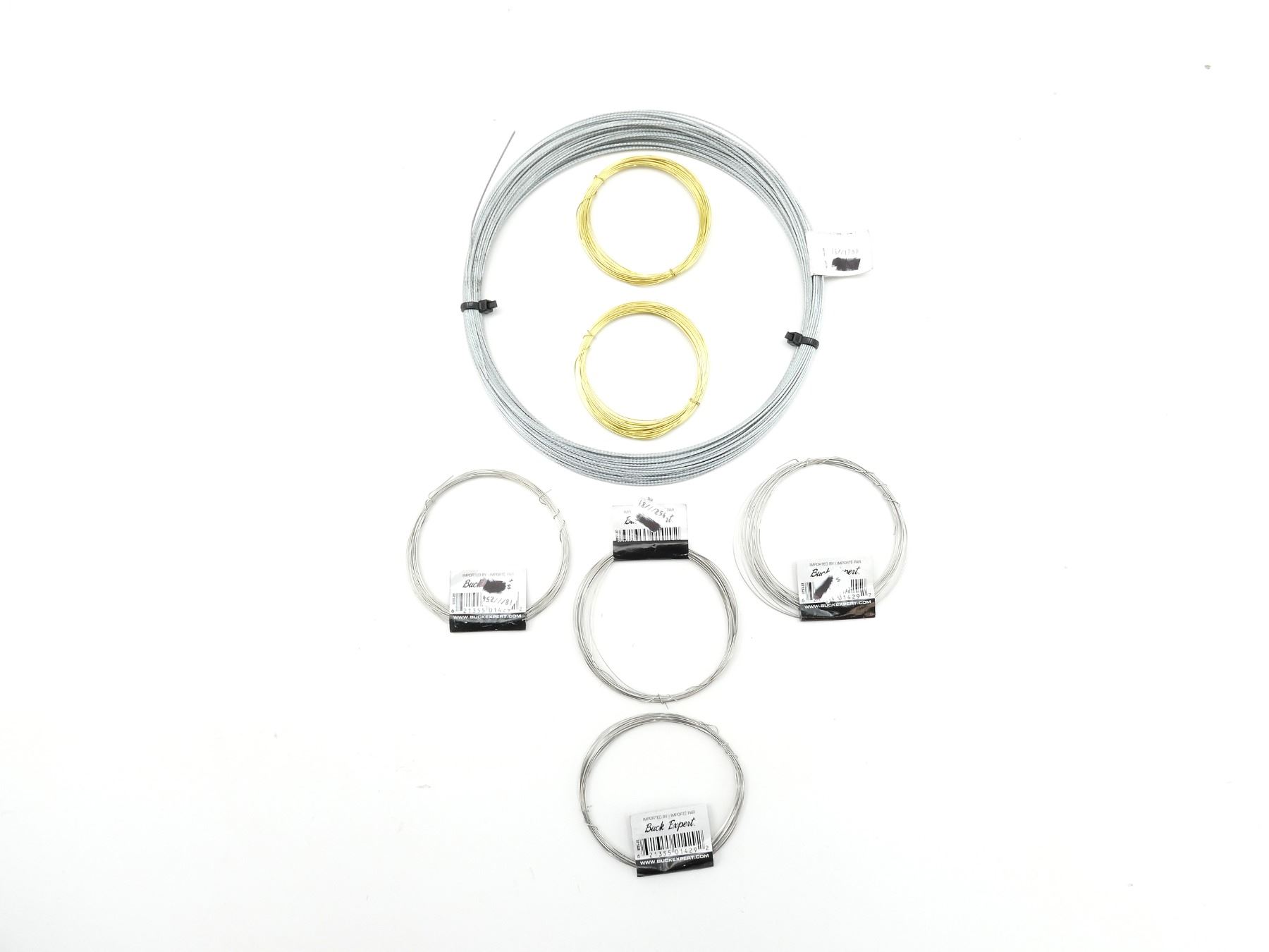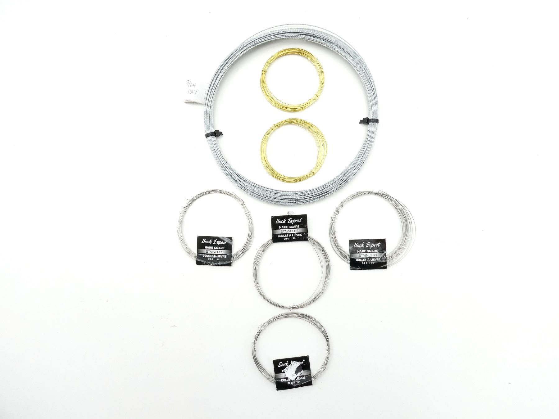 LOT INCLUDES; (4) BUCK EXPERT HARE SNARE WIRE, STAINLESS, 22G, 20', (2) UNKNOWN BRASS SNARE WIRE & (1) UNKNOWN BRAIDED WIRE. SEE PHOTOS.