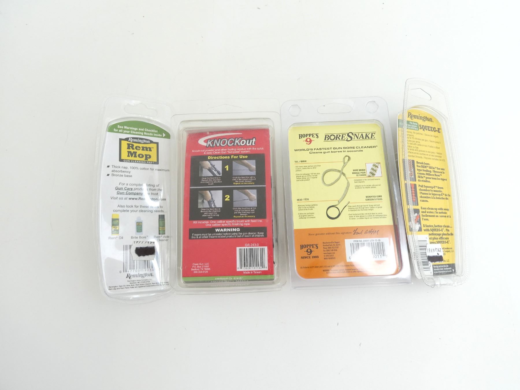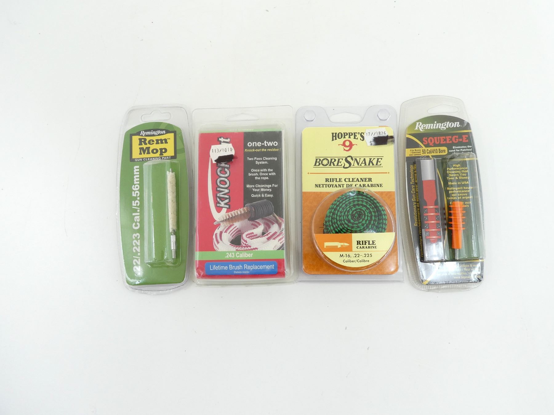 LOT INCLUDES; (1) HOPPE'S BORE SNAKE RIFLE CLEANER, M-16, .22-.225 CAL., ITEM #: 24011, APPEARS NEW OLD STOCK, IN ORIGINAL PACKAGING, (1) KNOCKOUT GUN CLEANER, .243 CAL., ITEM #: GR-243-3, APPEARS NEW OLD STOCK, IN ORIGINAL PACKAGING, (1) REMINGTON SQUEEG-E, FITS 50 CAL. / 410 BORE, ITEM #: 17458, NEW OLD STOCK, SEALED IN ORIGINAL PACKAGING & (1) REMINGTON REM MOP, .22 / .223 CAL., 5.56MM, NEW OLD STOCK, SEALED IN ORIGINAL PACKAGING. SEE PHOTOS.
