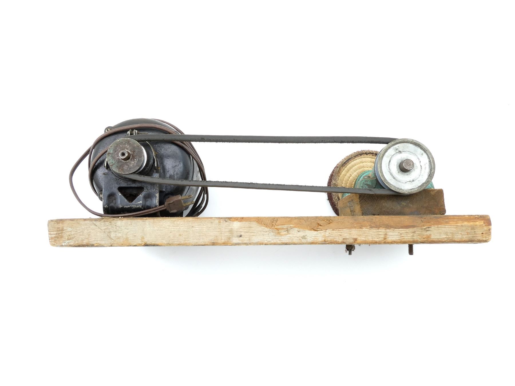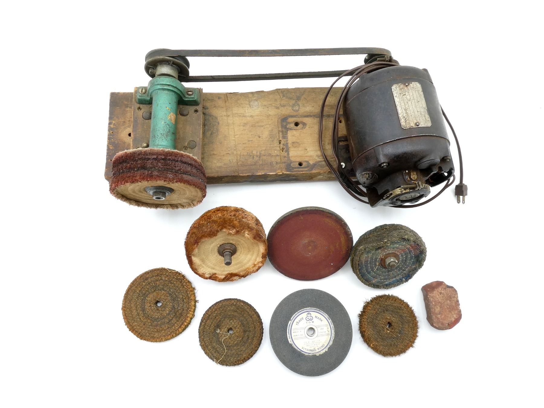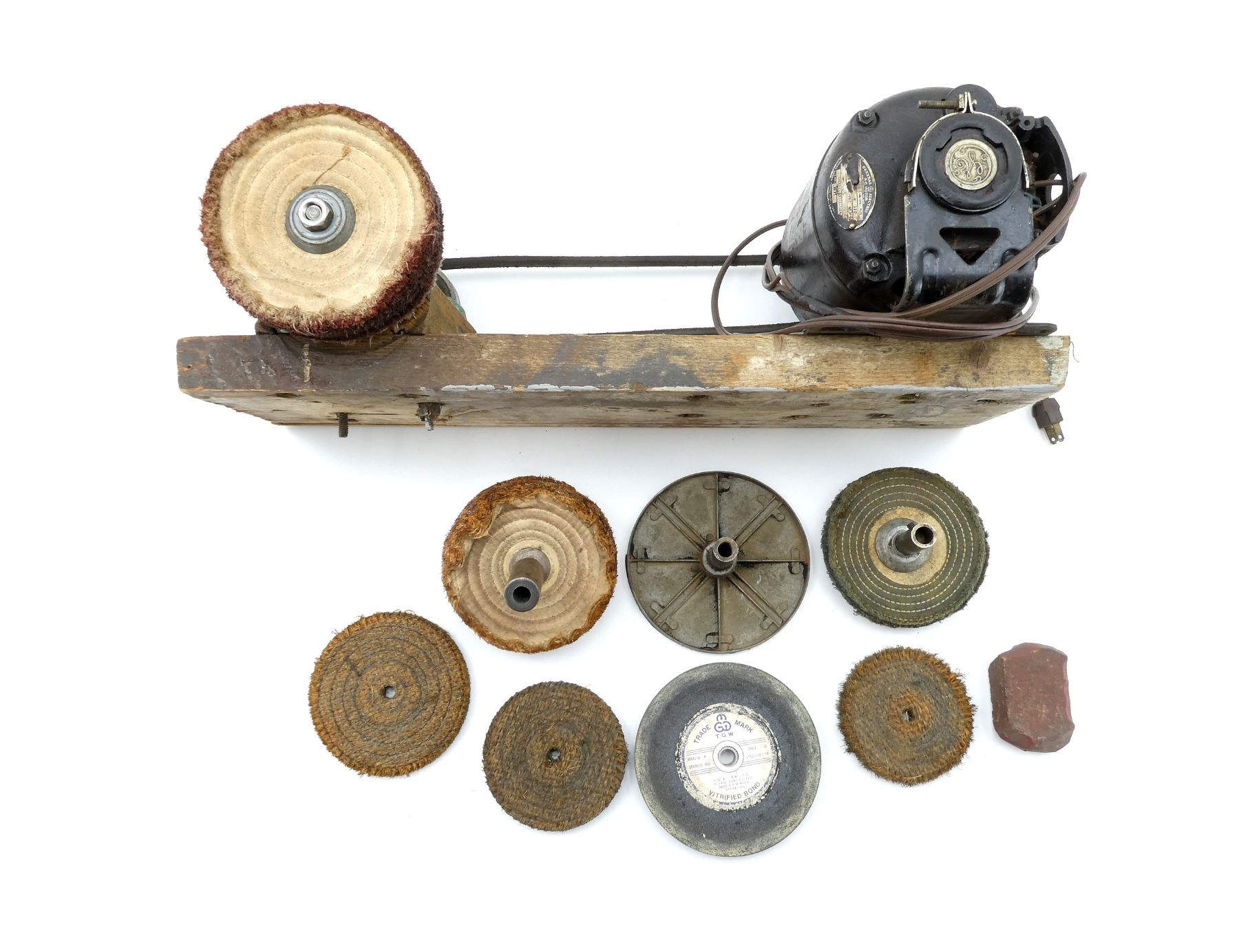 LOT INCLUDES; (1) MOTORIZED BUFFER, WOODEN & METAL CONSTRUCTION, BELT DRIVE CONNECTED TO GRINDING / POLISHING WHEEL, ORIGINAL MFR C.G.E, 110 VOLTS, 5.0 AMPS, MODEL 191R122, WORKING CONDITION, NOT FULLY TESTED, (1) TRADE MARK GRINDING STONE, (1) SANDING ATTACHMENT & (5) POLISHING ATTACHMENTS, VARIOUS TEXTURES, ETC., OVERALL LENGTH APPROX. 23.25" X 7.25". SEE PHOTOS. *MAY REQUIRE ADDITIONAL SHIPPING.