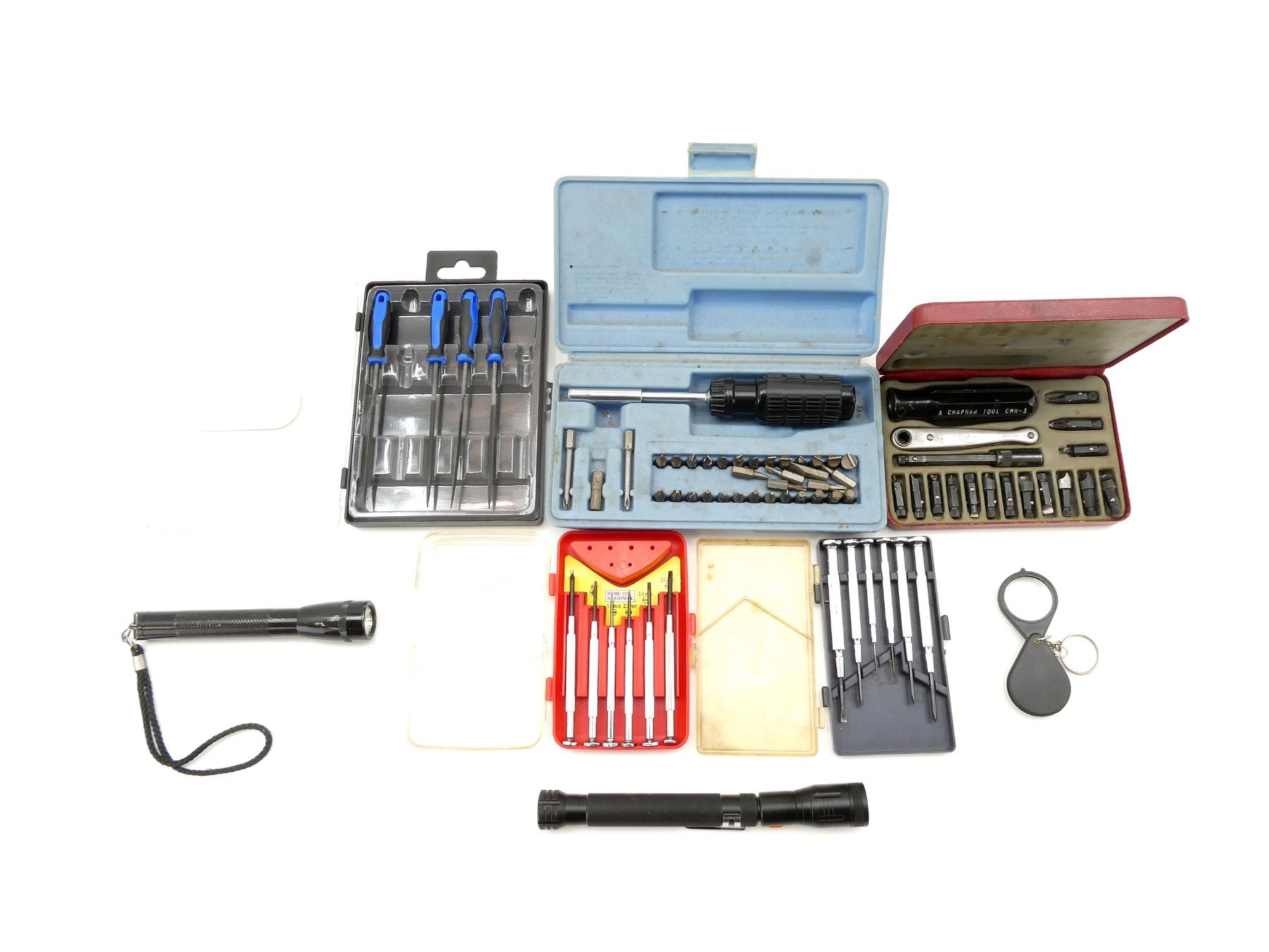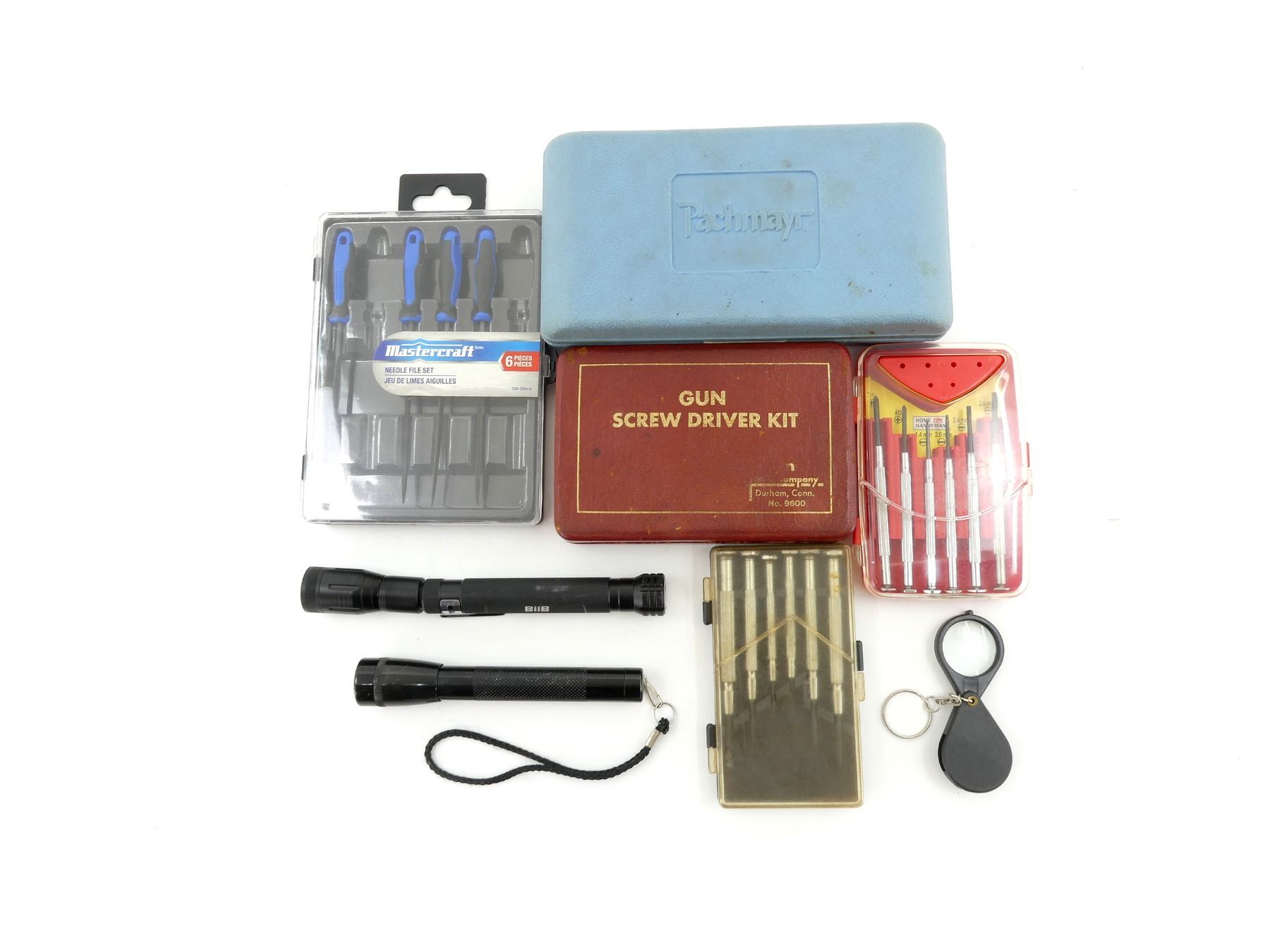 LOT INCLUDES; GUN SCREW DRIVER KIT, "A CHAPMAN TOOL" SCREWDRIVER, VARIOUS BITS, (1) PACHMAYR SCREWDRIVER KIT, UNMARKED SCREWDRIVER, VARIOUS BITS, (1) MASTERCRAFT NEEDLE FILE SET, MAY NOT BE COMPLETE / PIECES MAY BE MISSING, (1) HOME HANDYMAN 6-PIECE PRECISION SCREWDRIVER SET, (1) UNKNOWN 6-PIECE PRECISION SCREWDRIVER SET, (1) COMPACT MAGNIFYING GLASS & (2) FLASHLIGHTS, WORKING CONDITION, ETC. SEE PHOTOS.