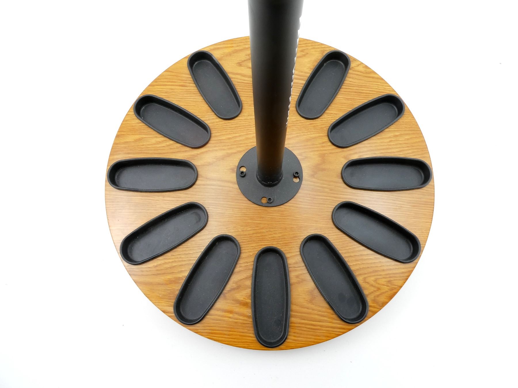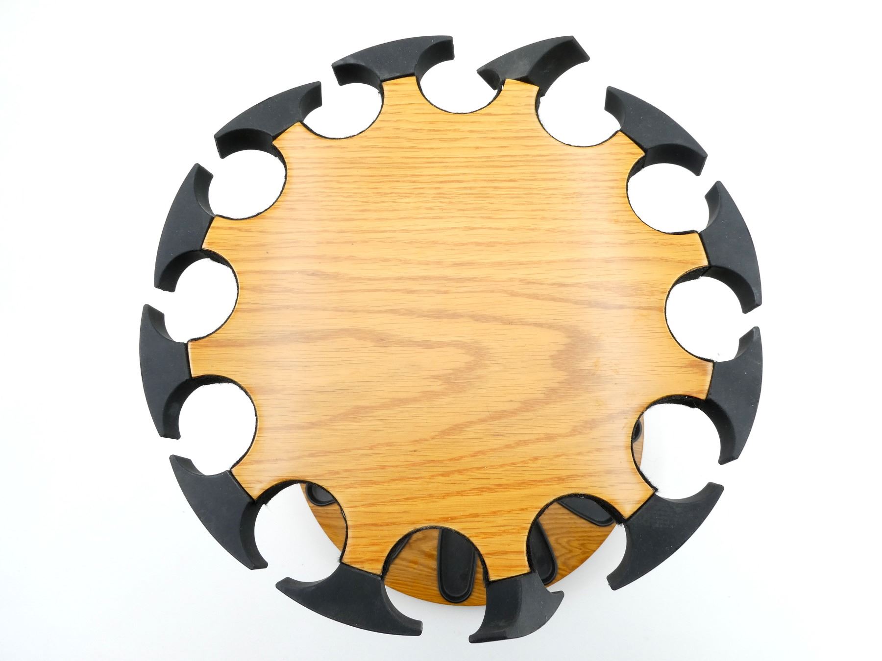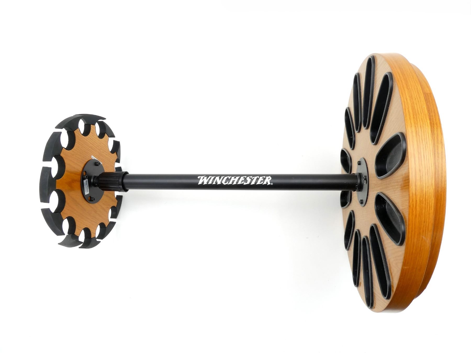 (1) 12-RIFLE FLOOR STAND GUN RACK, WOOD / METAL / POLYMER / RUBBER CONSTRUCTION, MARKED: "WINCHESTER", APPROX. 21.5" DIA. & OVERALL HEIGHT APPROX. 28.75". SEE PHOTOS. *MAY REQUIRE ADDITIONAL SHIPPING CHARGES*