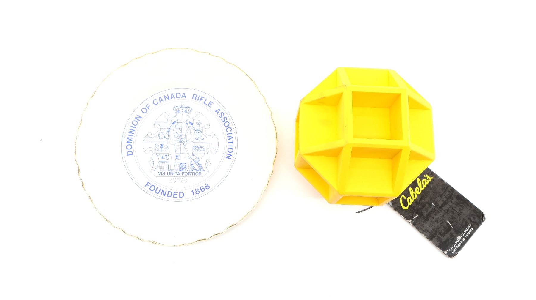 LOT INCLUDES; (1) DOMINION OF CANADA RIFLE ASSOCIATION CERAMIC PLATE, MARKED "DOMINION OF CANADA RIFLE ASSOCIATION FOUNDED 1868", OVERALL LENGTH APPROX. 9.5" & (1) CABELA'S GROUND POUNDER SELF-HEALING TARGET, SPHERE, FLY / BOUNCE / ROLL / RUN WHEN HIT, HANDLE 1,000+ RNDS. SEE PHOTOS.