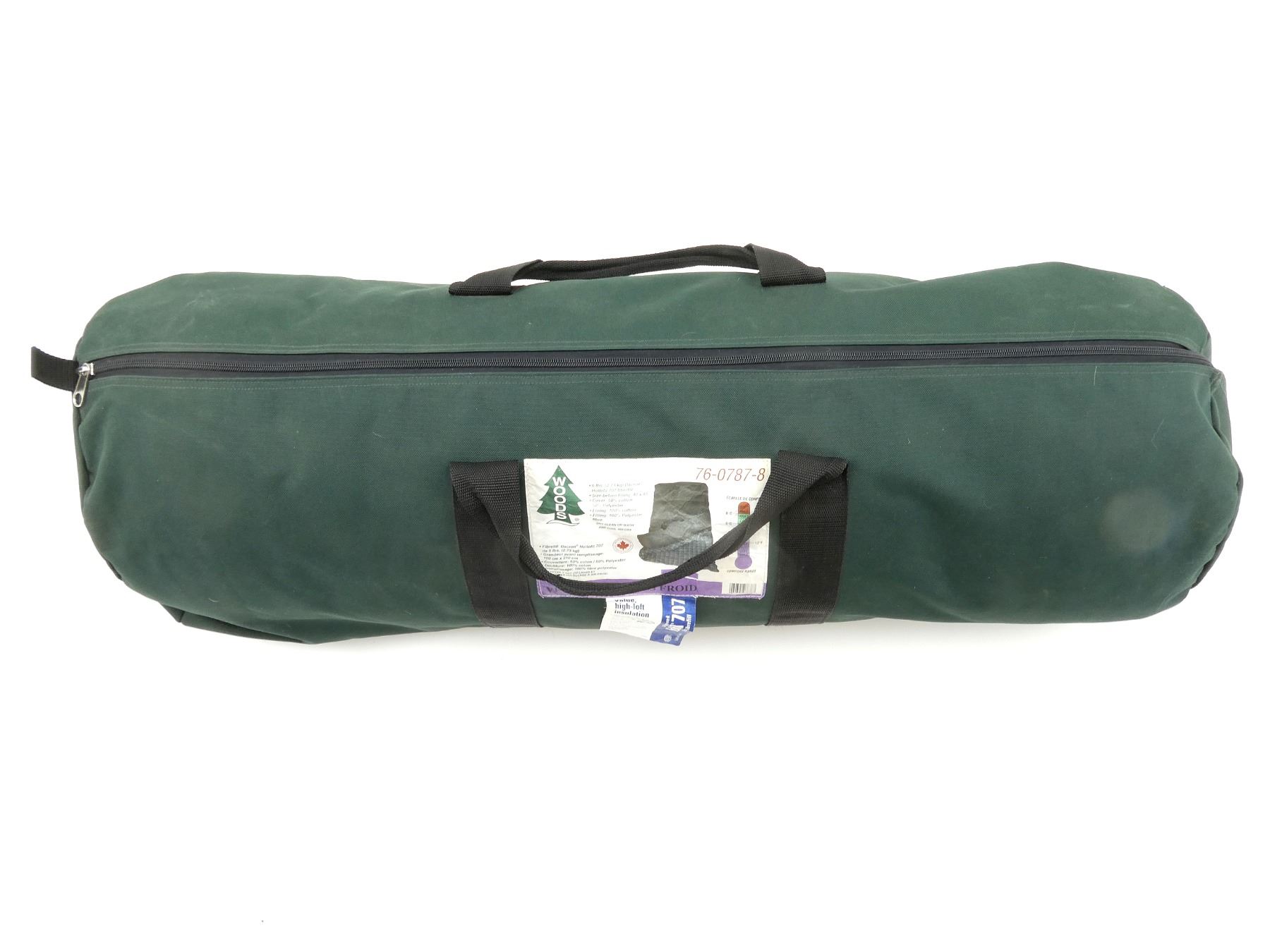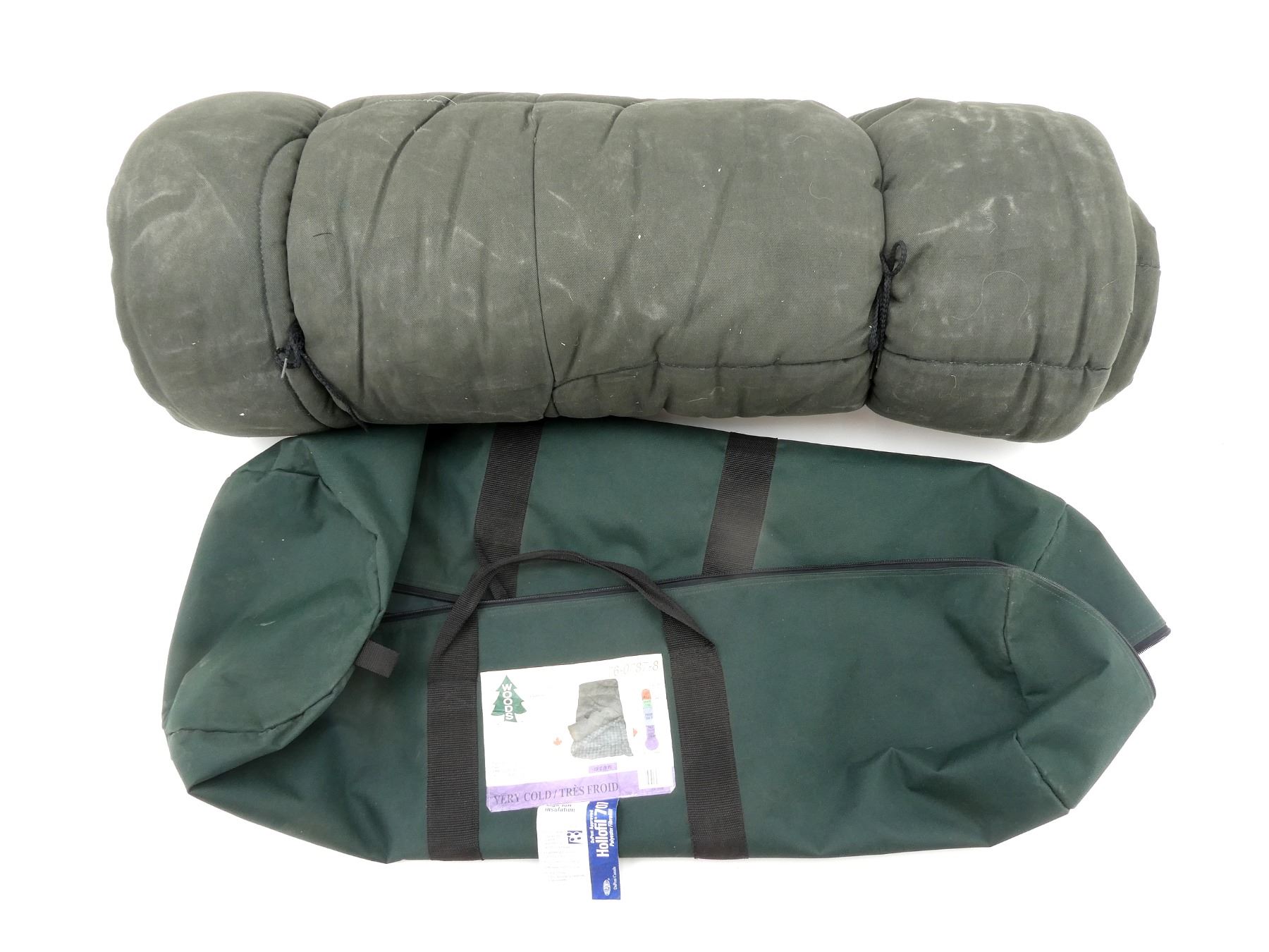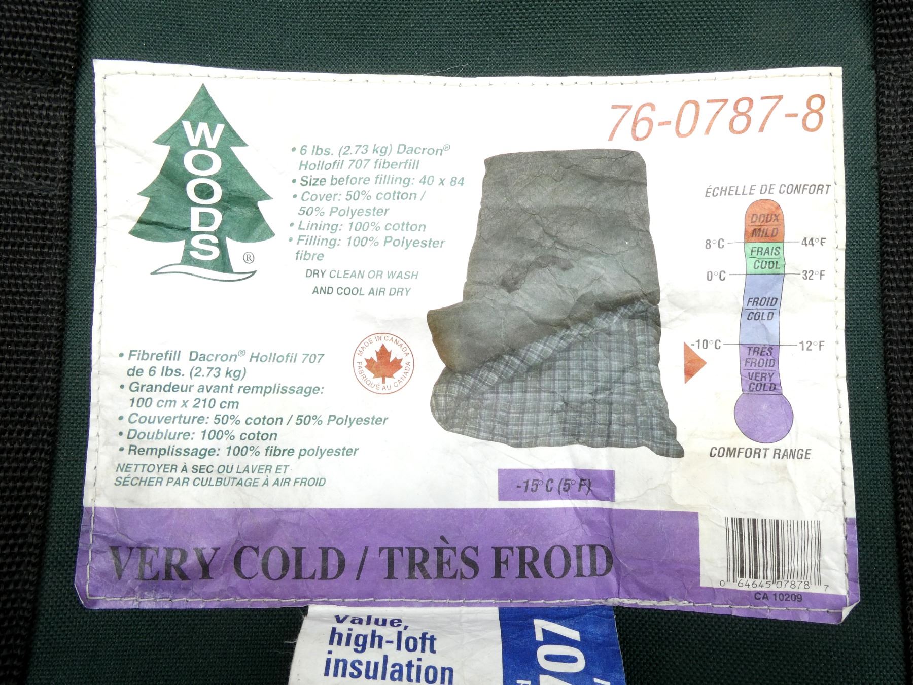 (1) COMFORT RANGE DESIGNED FOR VERY COLD TEMPERATURES, 6LBS DACRON HOLLOFIL 707 FIBREFILL, COVER: 50% COTTON / 50% POLYESTER, LINING: 100% COTTON, FILLING: 100% POLYESTER FIBRE, MODEL #: 76-0787-8, ZIPPER CLOSURE (WORKS), STRING FOR TYING WHEN ROLLED, CARRY CASE WITH ZIPPER CLOSURE (STIFF), OVERALL LENGTH APPROX. 40" X 84". SEE PHOTOS.