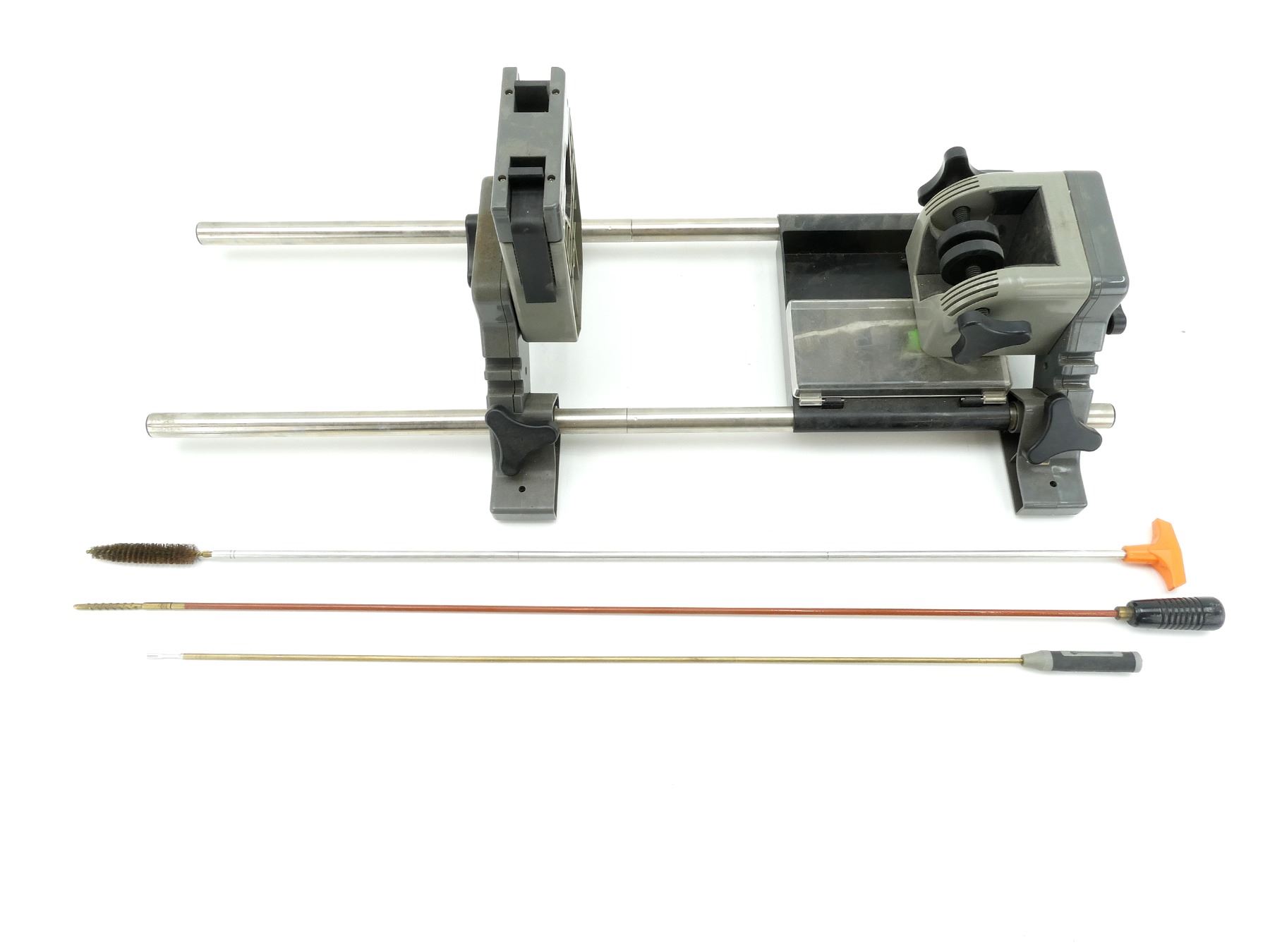 LOT INCLUDES; (1) POSSIBLE LYMAN REVOLUTION ROTATING GUN VISE, POLYMER & METAL CONSTRUCTION, WITH RUBBER PADDED RESTS, SHOWS WEAR & TEAR / USE MARKS, OVERALL LENGTH APPROX. 35 5/8" X 15.75" X 12", ETC. & (3) ASSORTED CLEANING RODS. SEE PHOTOS.