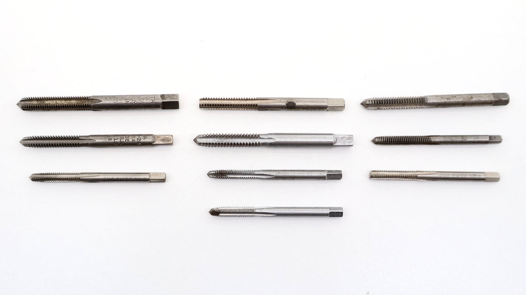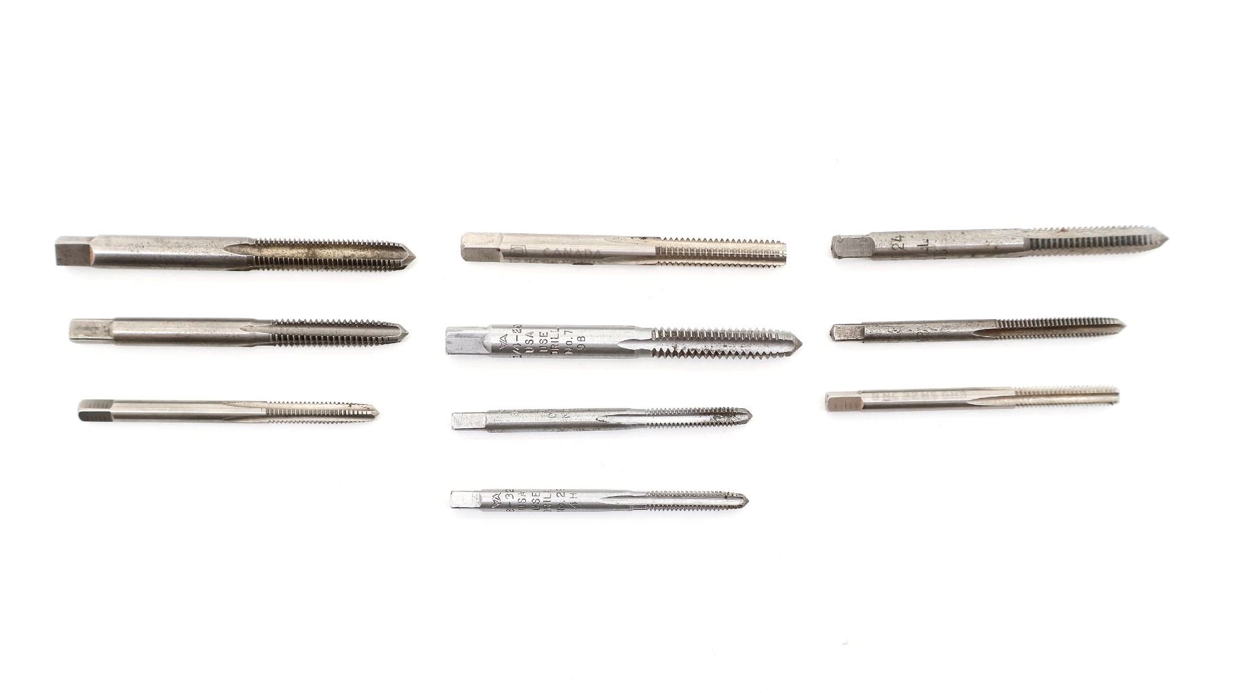 LOT INCLUDES; (10) GUNSMITHING TAPS, INCLUDES; NO. 3 1/4-28, NO. 7 1/4-20, NO. 16 12-24 & NO. 29 8-32, ETC. SEE PHOTOS.