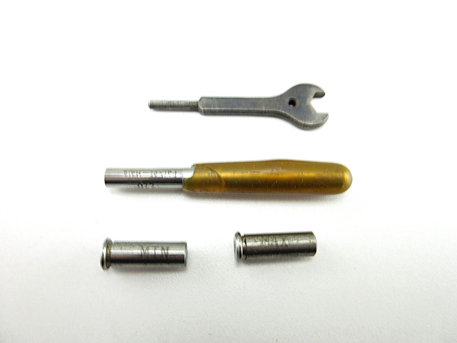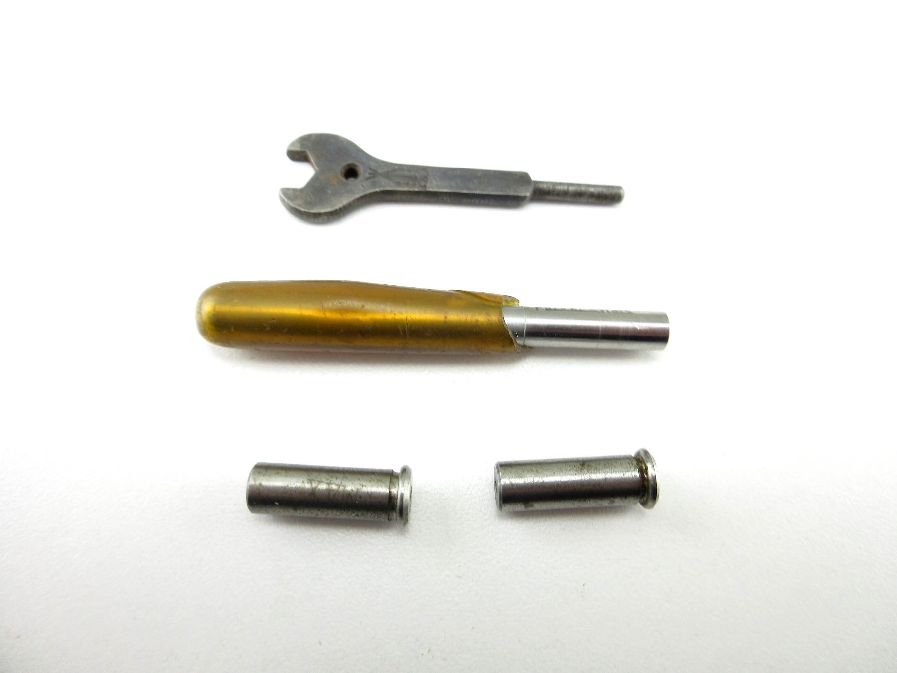 LOT INCLUDES; (1) PARKER HALE 0.220" BORE GAUGE, (2) UNKNOWN .22 LR MIN / MAX HEAD SPACE GAUGES & (1) WRENCH, BLUED STEEL, MARKED: "BSA". SEE PHOTOS/