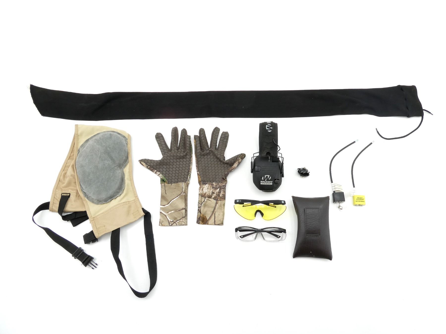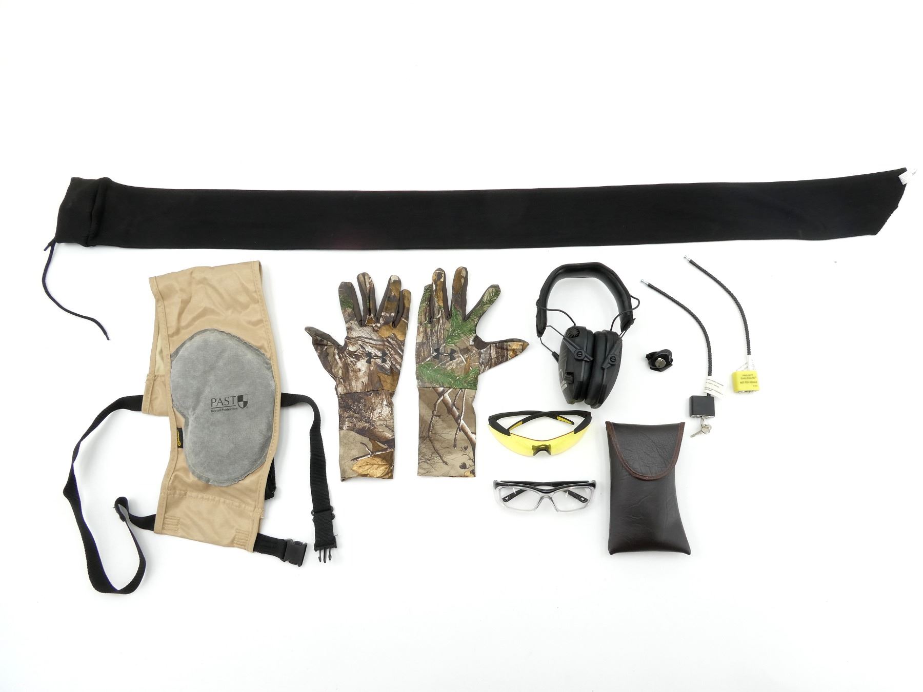 LOT INCLUDES; (2) SAFETY GLASSES, 1 IN PROTECTIVE CASE, (1) WALKER'S RAZOR ELECTRONIC EARMUFFS, UNTESTED, MAY NOT BE COMPLETE / PIECES MAY BE MISSING, (1) PAIR OF UNDER ARMOUR CAMO GLOVES, LINED WITH RUBBER FOR ADDITIONAL GRIP & (1) CALDWELL PAST RECOIL PROTECTION, OVERALL LENGTH APPROX. 26", ADJUSTABLE, ETC. SEE PHOTOS.