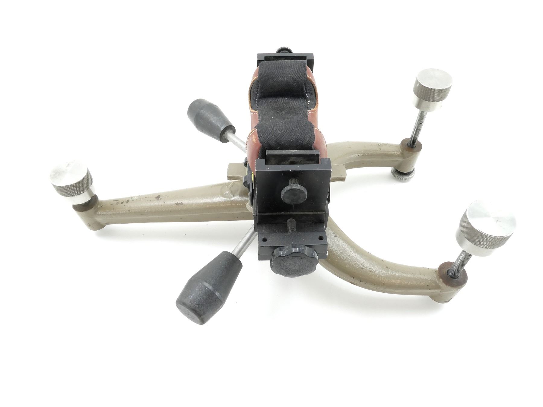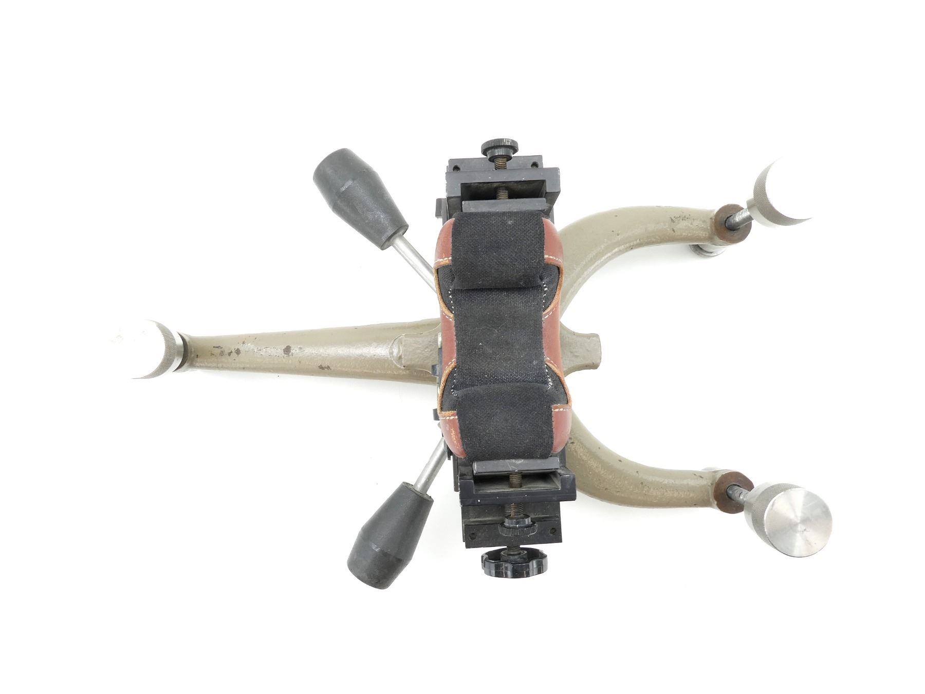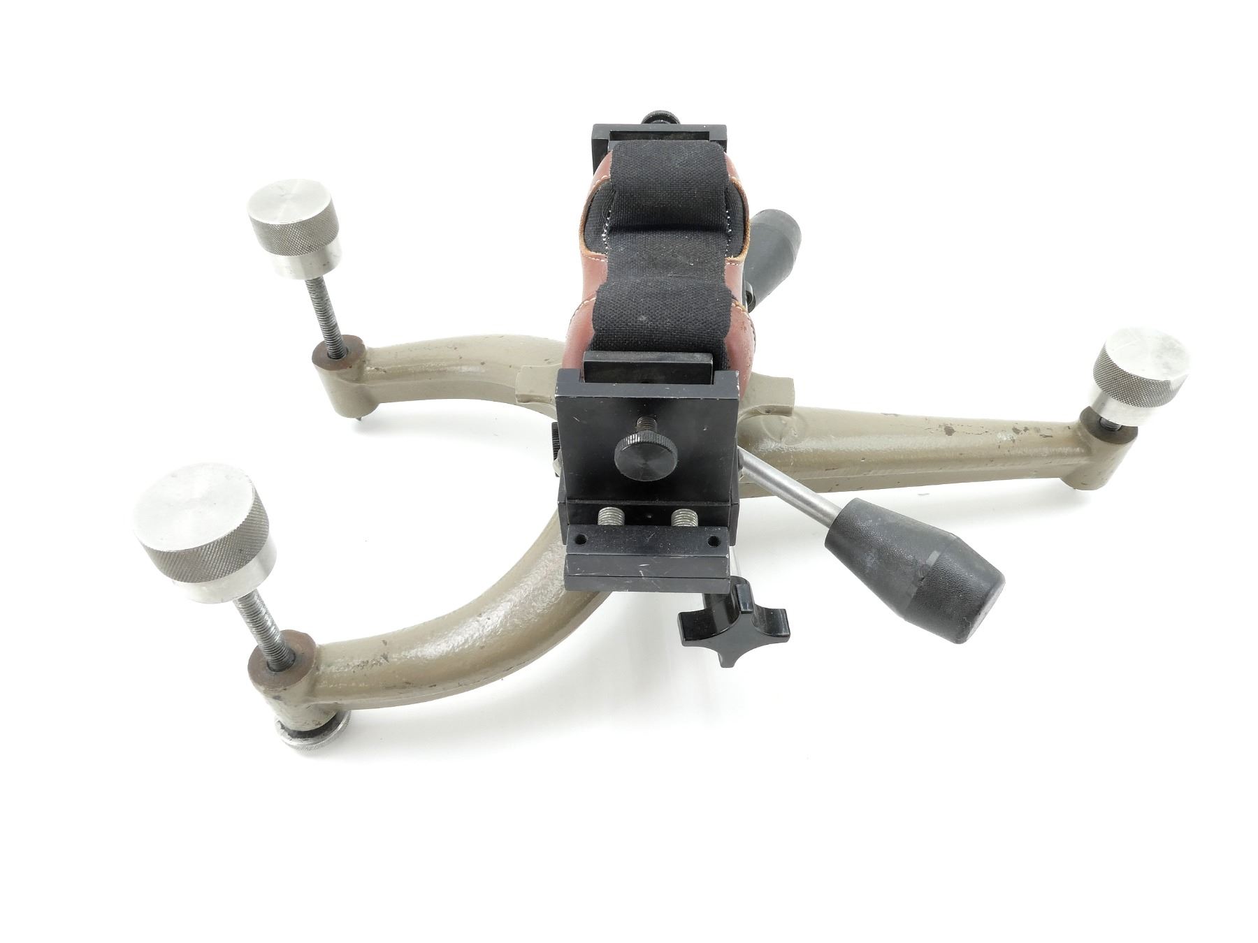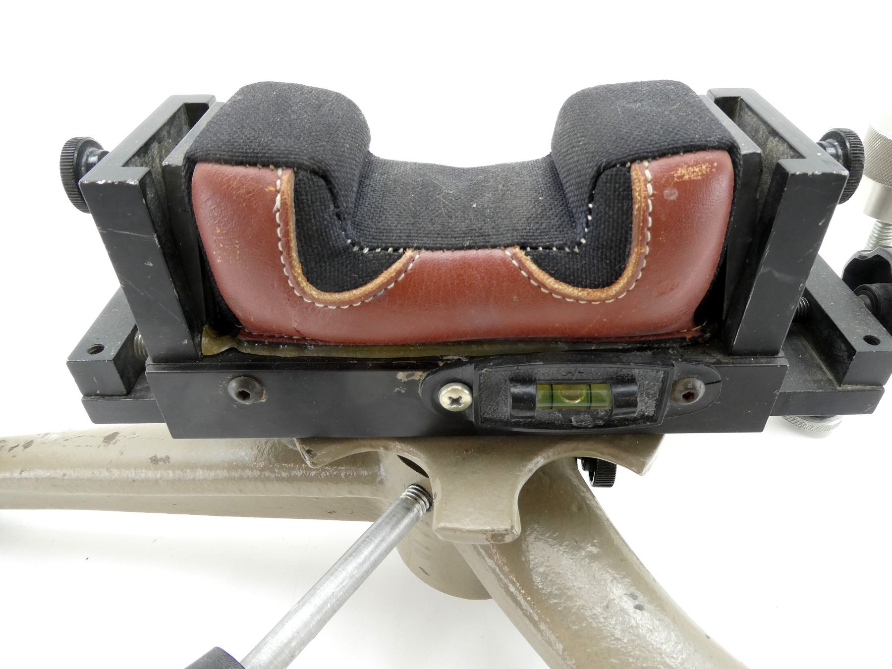 (1) CAST IRON CONSTRUCTION WITH PADDED REST, REST ROTATES 360 DEGREES, INCLUDES LEVELING SYSTEM, SHOWS WEAR & TEAR / USE MARKS, OVERALL LENGTH APPROX. 16" X 8.5". SEE PHOTOS.