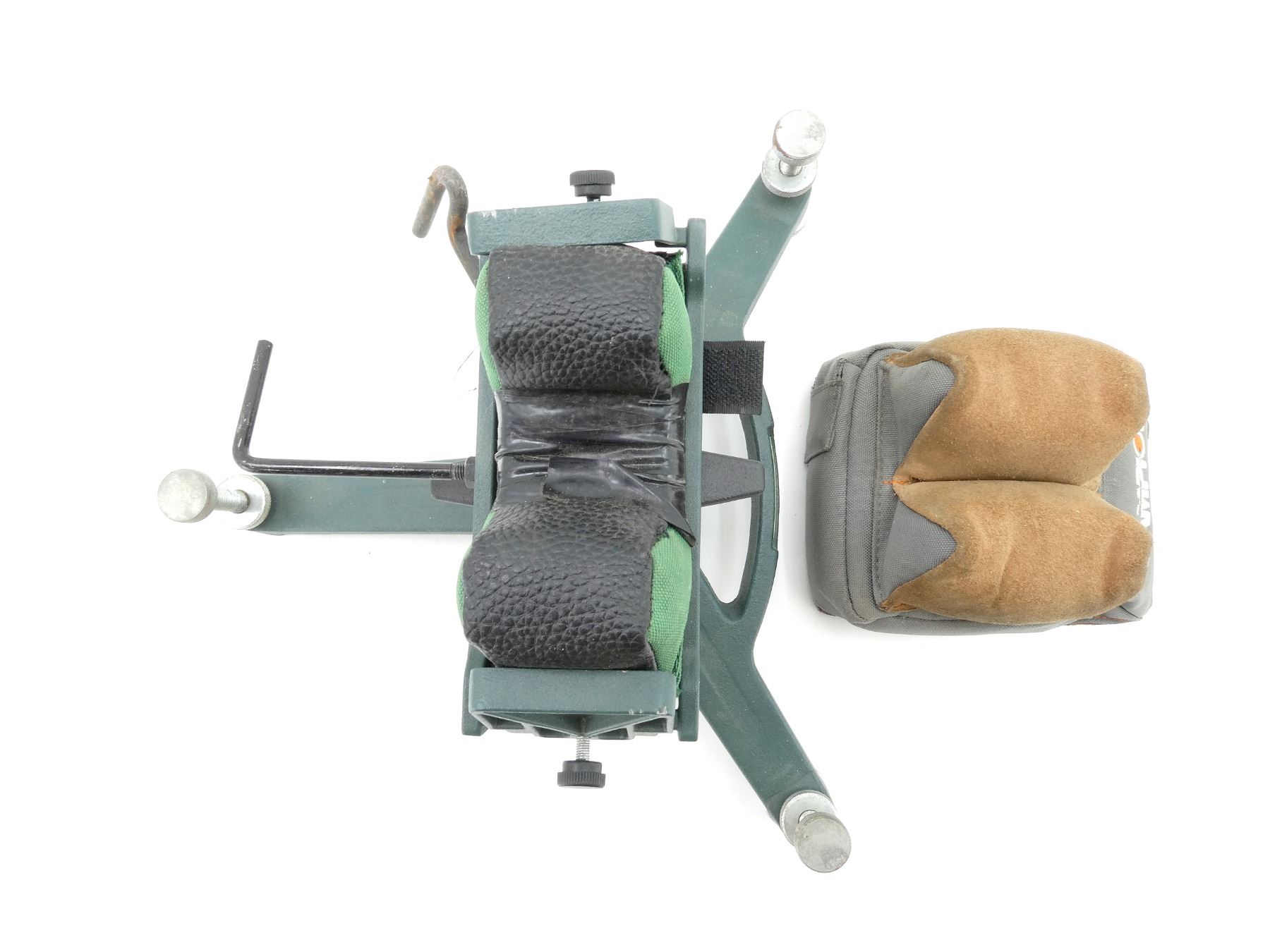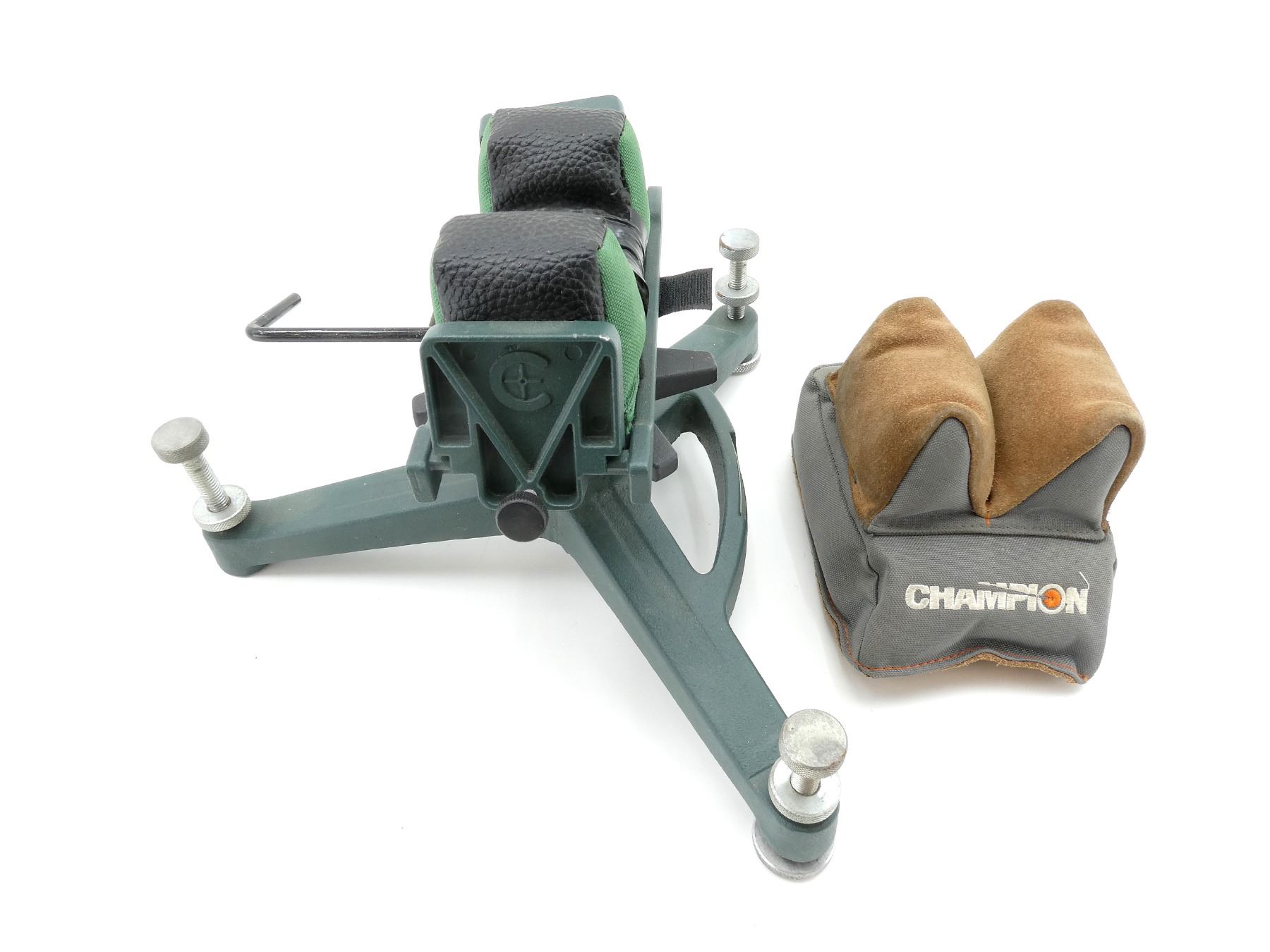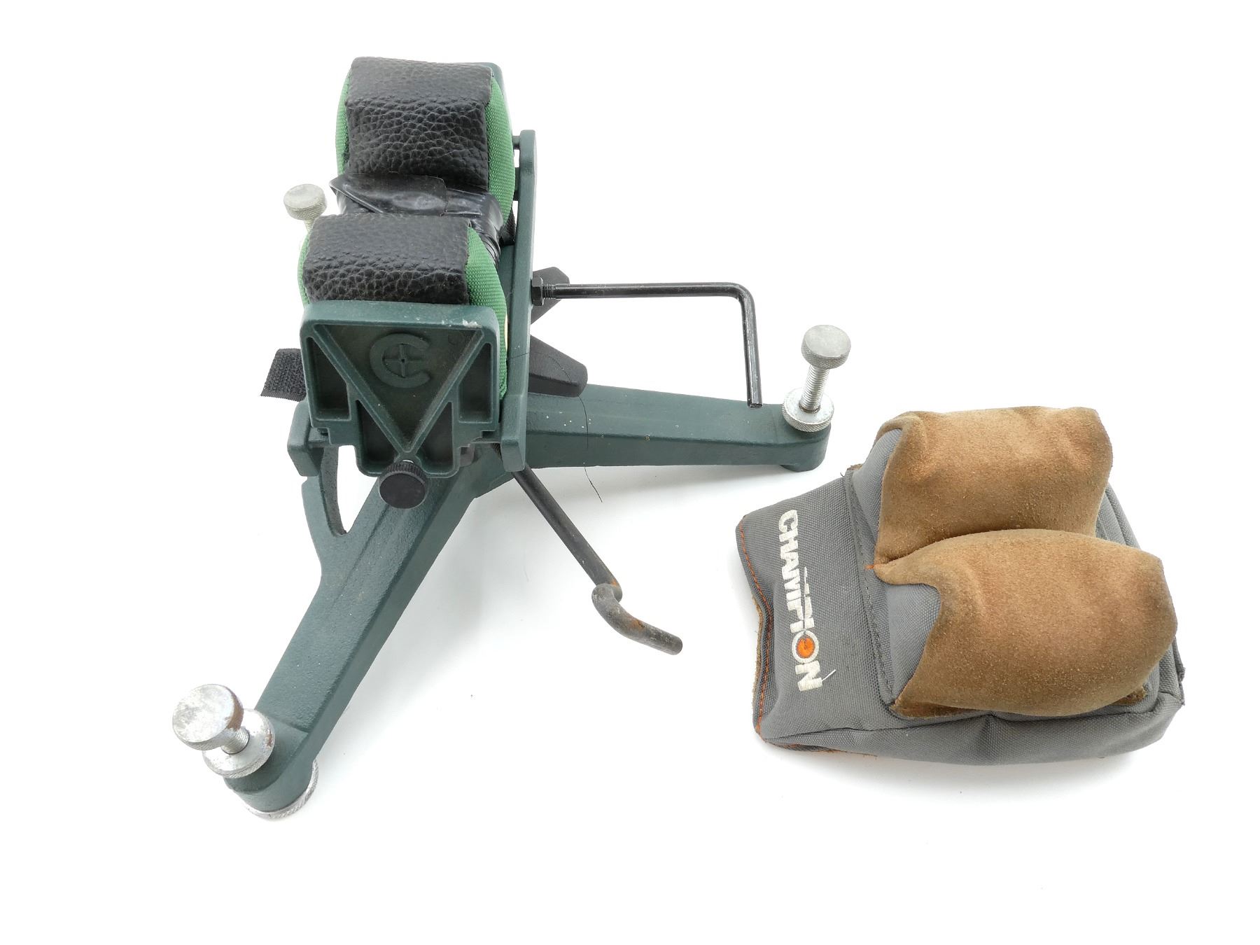 LOT INCLUDES; (1) CALDWELL SHOOTING REST, METAL CONSTRUCTION WITH PADDED REST, ADJUSTABLE TURRET POST, 3 LEVELING FEET, MISSING 1 FOOT FITTING, OVERALL LENGTH APPROX. 12.5" & (1) CHAMPION SHOOTING REST, SUEDE & NYLON CONSTRUCTION, OVERALL LENGTH APPROX. 6.25" X 4.75". SEE PHOTOS.