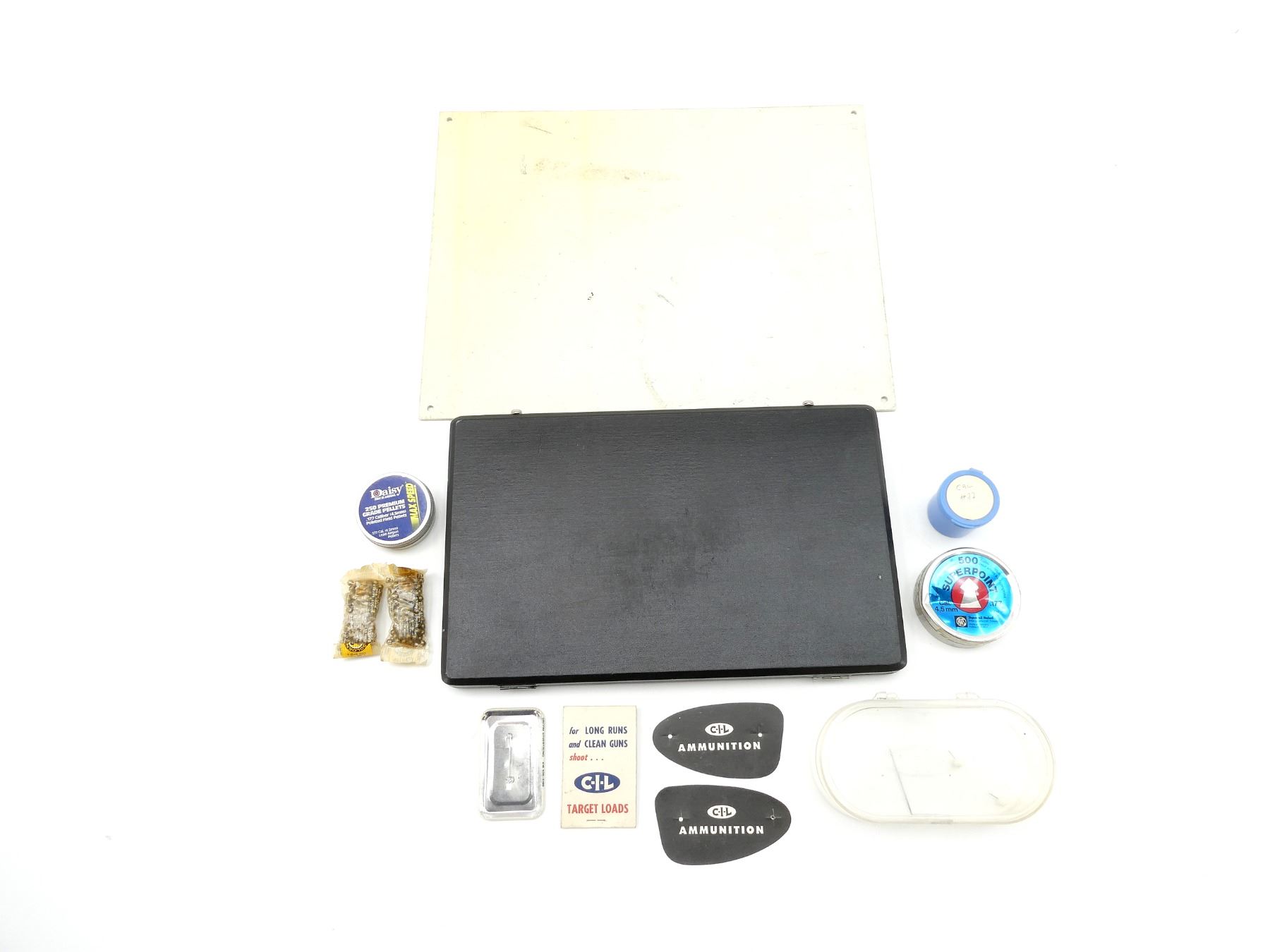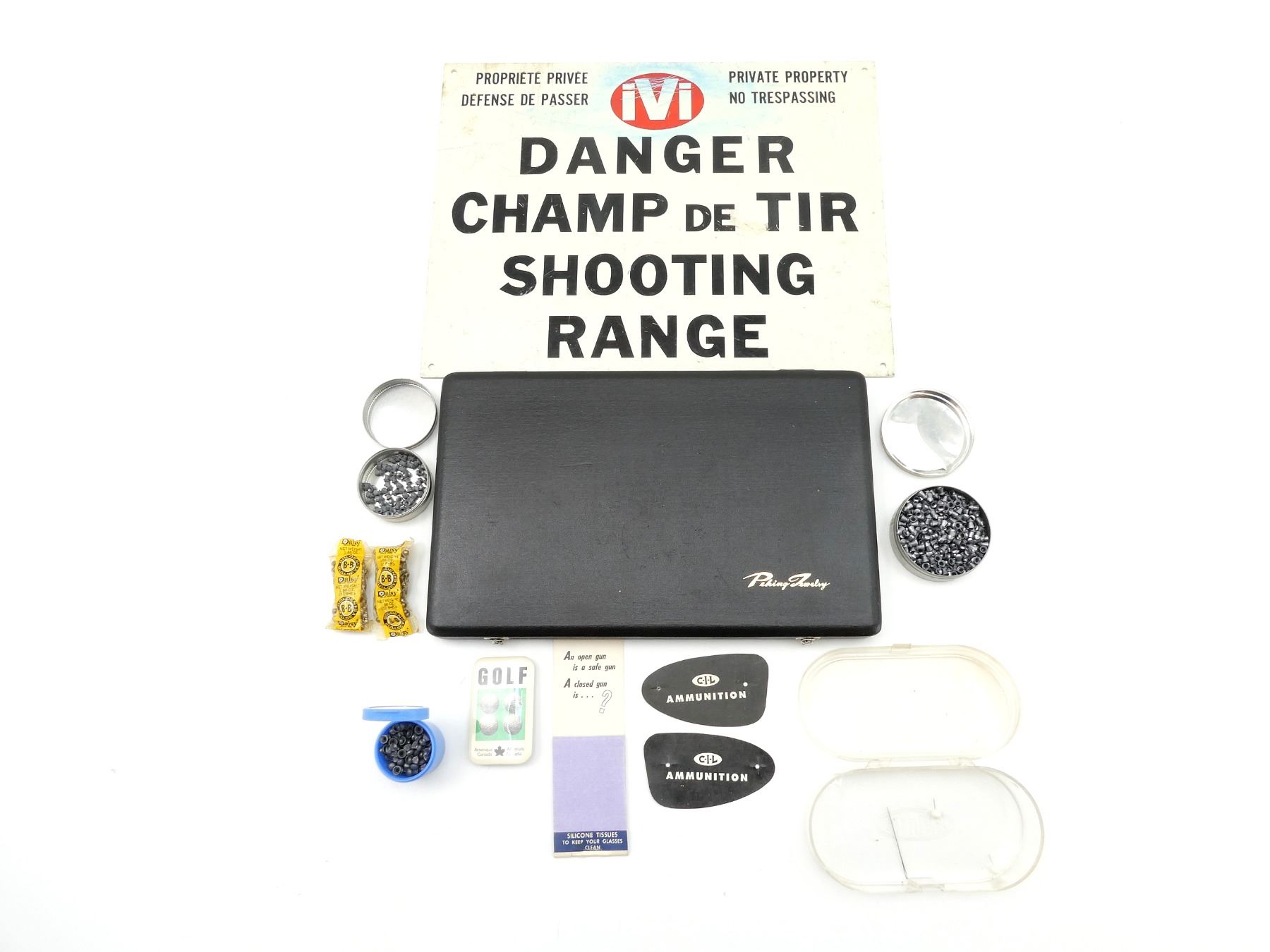 LOT INCLUDES; (1) PEKING JEWELRY DISPLAY CASE, WOODEN CONSTRUCTION, FOAM / FELT PADDED INSIDE, CLIP CLOSURE, OVERALL LENGTH APPROX. 12 1/8" X 7.5" X 1", (1) "DANGER SHOOTING RANGE" SIGN, POLYMER CONSTRUCTION, OVERALL LENGTH APPROX. 14" X 11", (1) DAISY 250 PREMIUM GRADE PELLETS, .177 CAL. (4.5MM), POINTED FIELD PELLETS, LEAD, MAY NOT BE COMPLETE / PIECES MAY BE MISSING, (1) DYNAMIT NOBEL 500 SUPERPOINT AIRGUN PELLETS, CONE POINTED, .177 CAL. (4.5MM), MAY NOT BE COMPLETE / PIECES MAY BE MISSING & (2) DAISY GOLDEN BULLSEYE BB, 1.88OZ, NEW OLD STOCK, SEALED IN ORIGINAL PACKAGING, ETC. SEE PHOTOS.