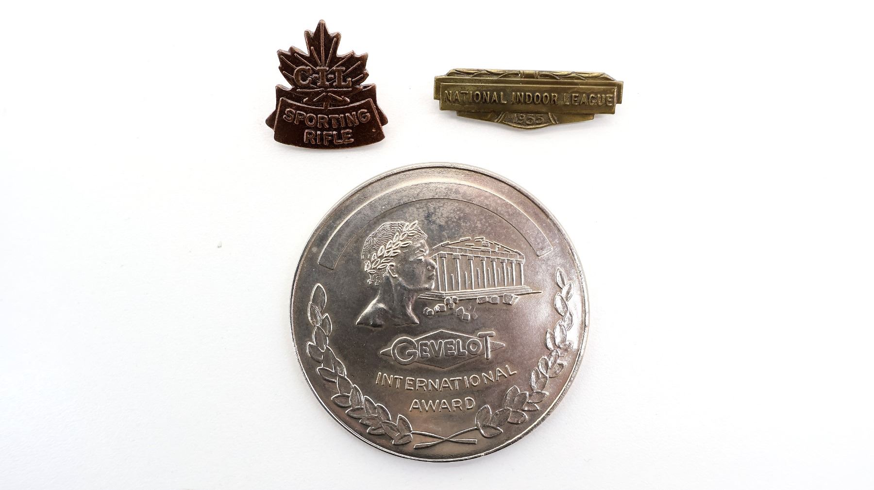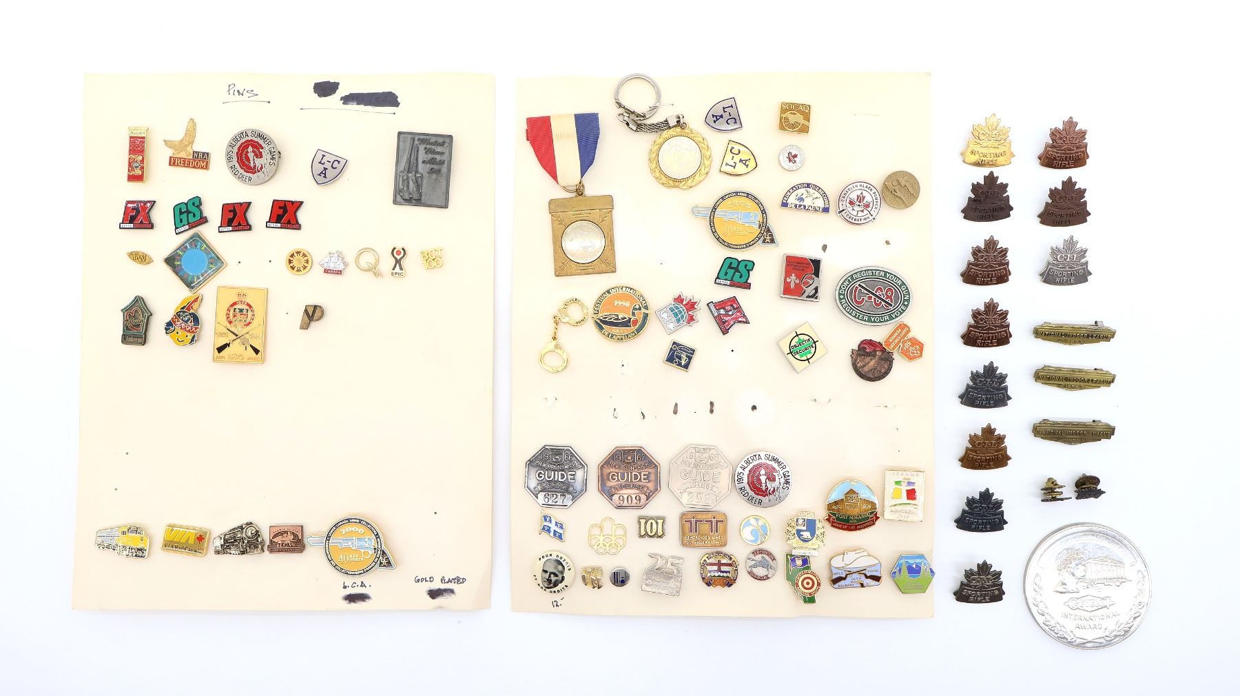 LOT INCLUDES; APPROX. (83) ASSORTED RIFLE CLUB / ASSOCIATION PINS, SOME INCLUDE; DOMINION MARKSMEN, NATIONAL INDOOR LEAGUE 1955-1957, C-I-L SPORTING RIFLE, PQRA (PROVINCE OF QUEBEC RIFLE ASSOCIATION) 125 YEARS, 1975 ALBERTA SUMMER GAMES RED DEER, NRA FREEDOM, LOWER CANADA ARMS COLLECTORS 2000 40 YEARS, ETC. SEE PHOTOS.