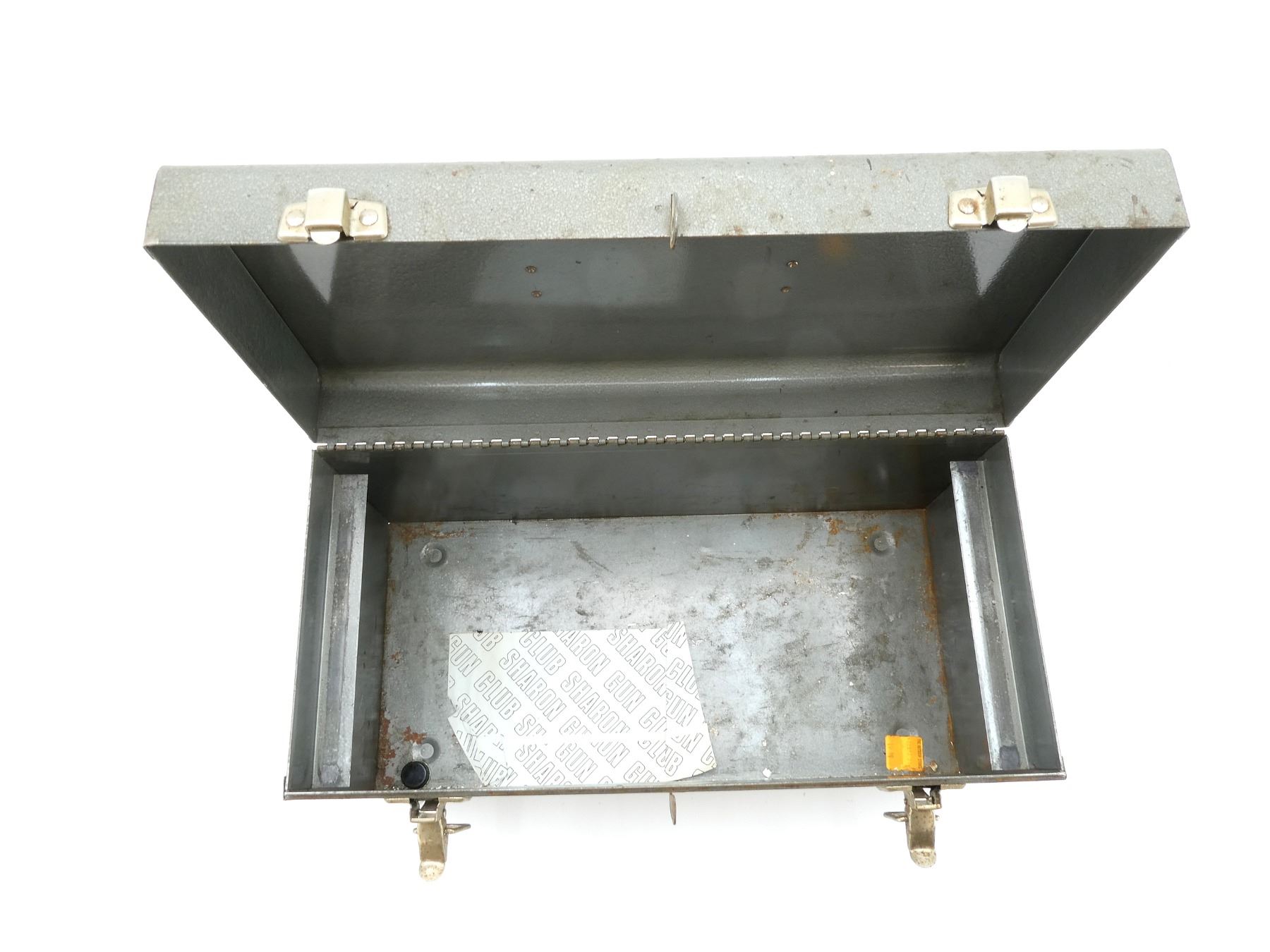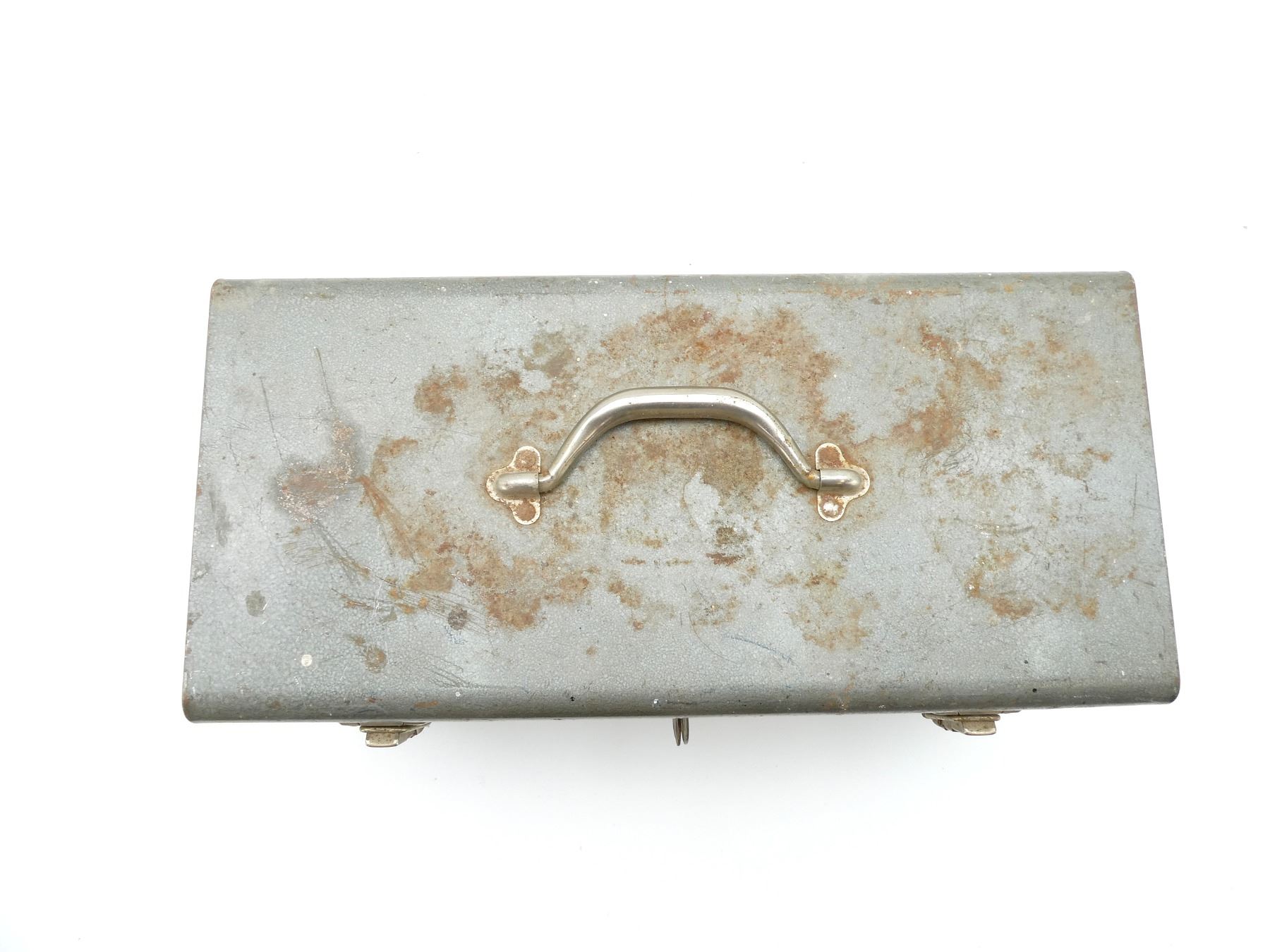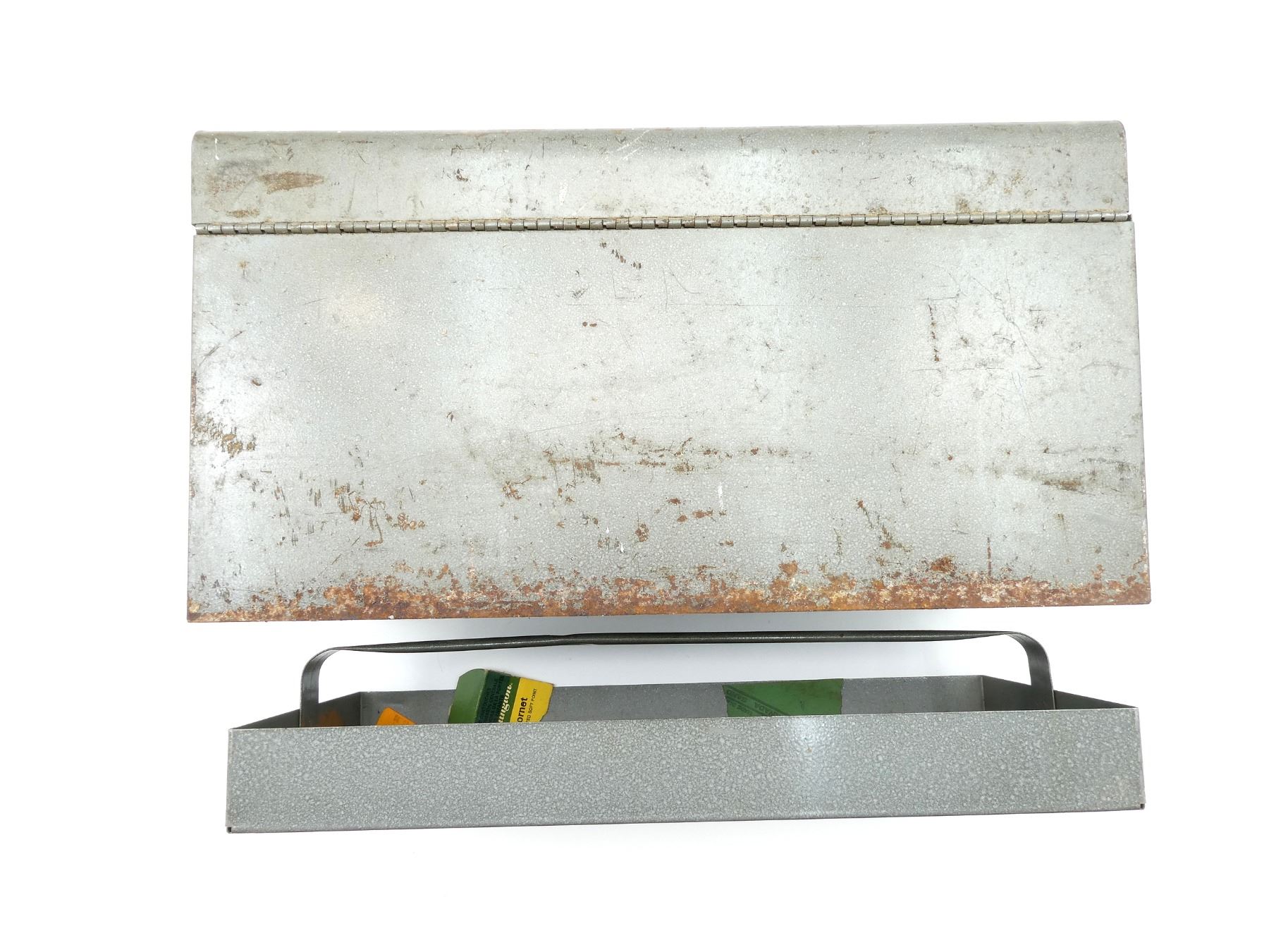 (1) GREY METAL TOOL BOX, PULL-OUT TRAY, LATCH CLOSURE & CARRY HANDLE, SHOWS WEAR & TEAR / USE MARKS, OVERALL LENGTH APPROX. 18" X 8.5" X 9.5". SEE PHOTOS.