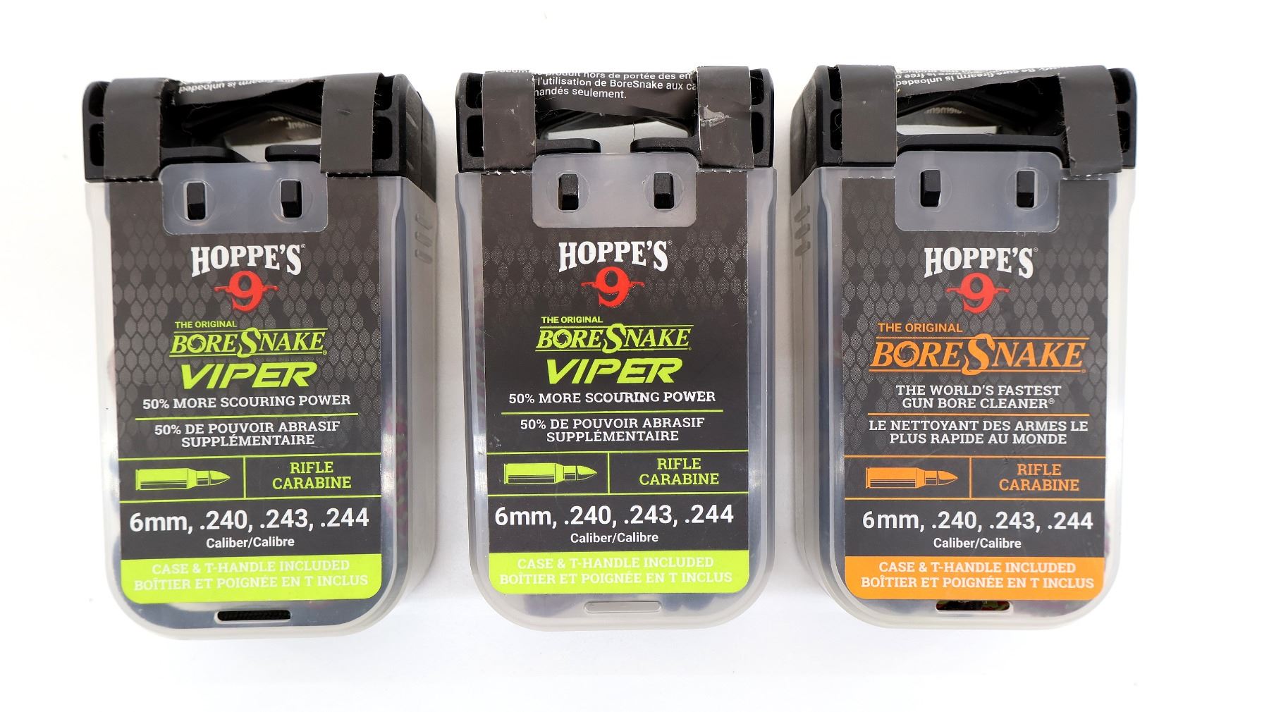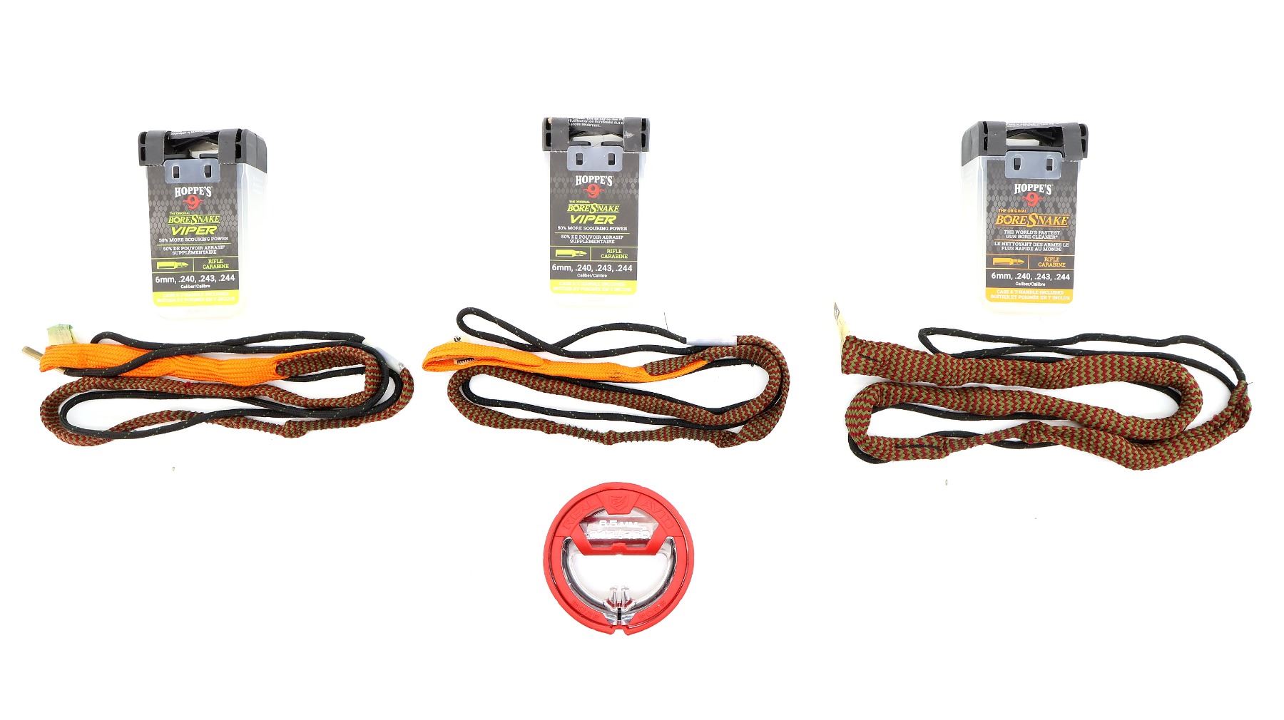 LOT INCLUDES; (3) HOPPE'S 9 BORE SNAKES, FITS 6MM / .240 / .243 / .244 CALIBERS & (1) UNKNOWN BORE SNAKES, FITS 6.5MM / .243 / .260 CALIBERS. SEE PHOTOS.