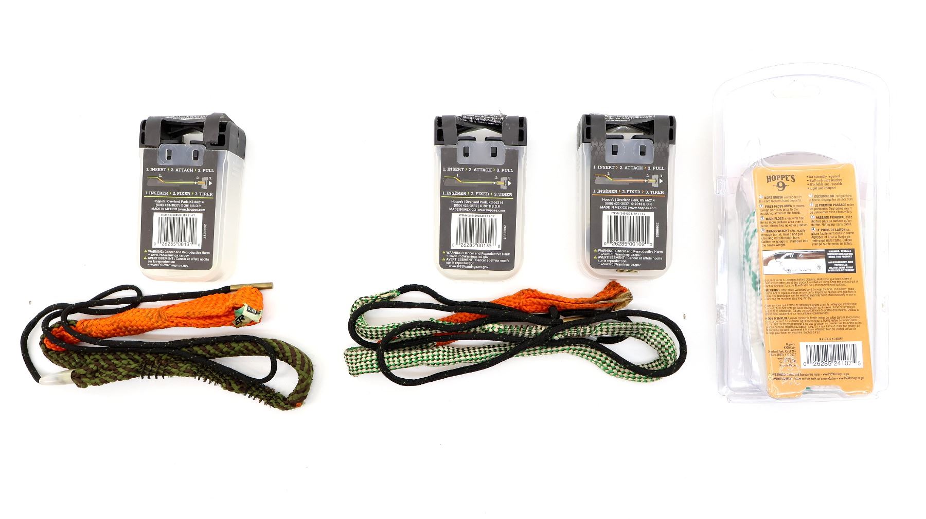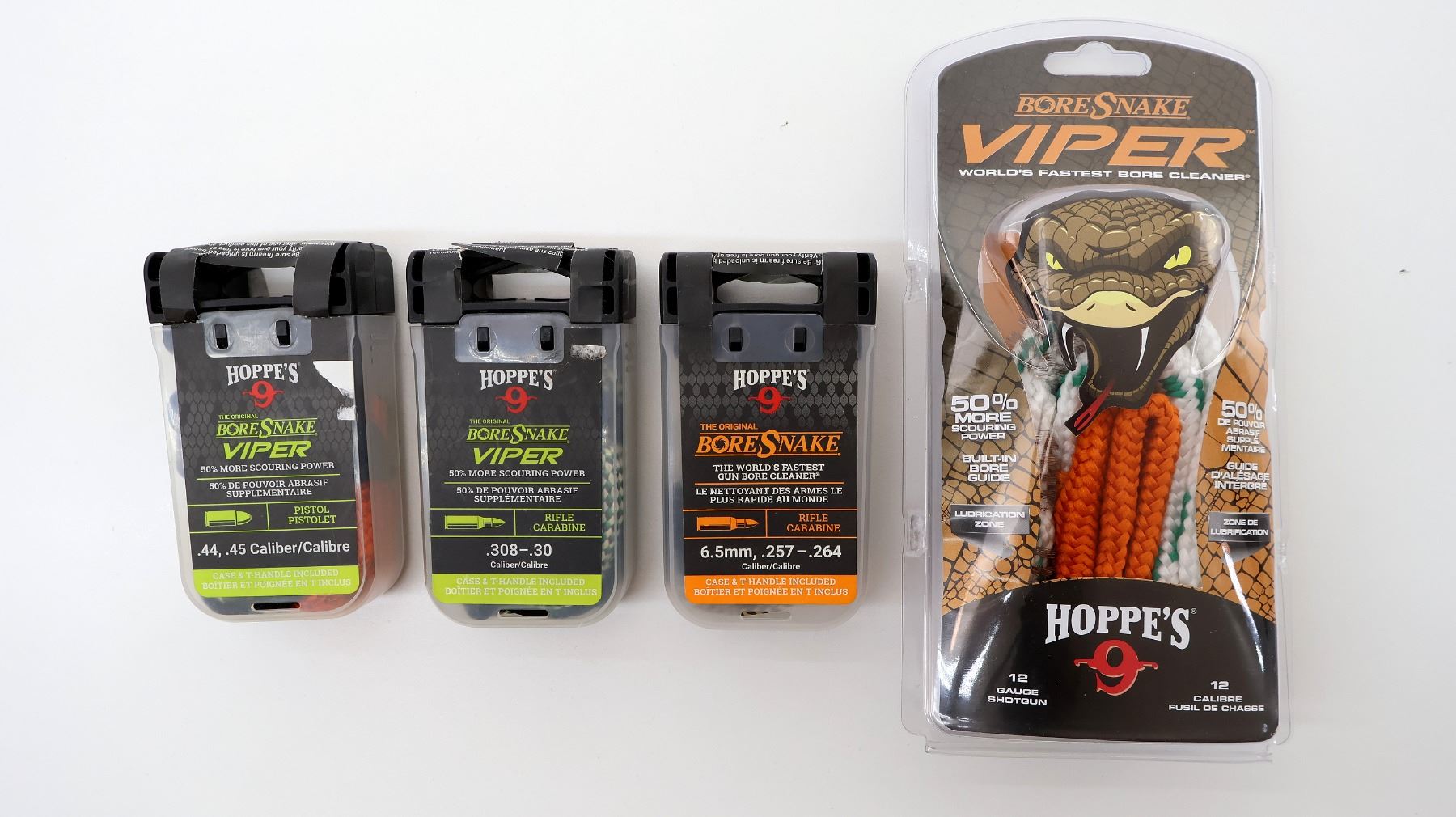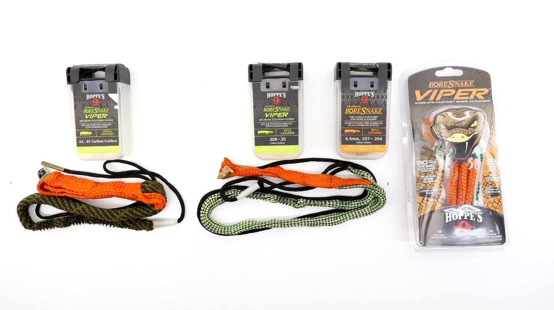 LOT INCLUDES; (1) HOPPE'S 9 BORE SNAKE, FITS 6.5MM / .257 - .264 CALIBERS, (1) HOPPE'S 9 BORE SNAKE, FITS .308 - .30 CALIBERS, (1) HOPPE'S 9 BORE SNAKE, FITS .44 / .45 CALIBERS & (1) HOPPE'S 9 BORE SNAKE VIPER, FITS 12 GAUGE. SEE PHOTOS.