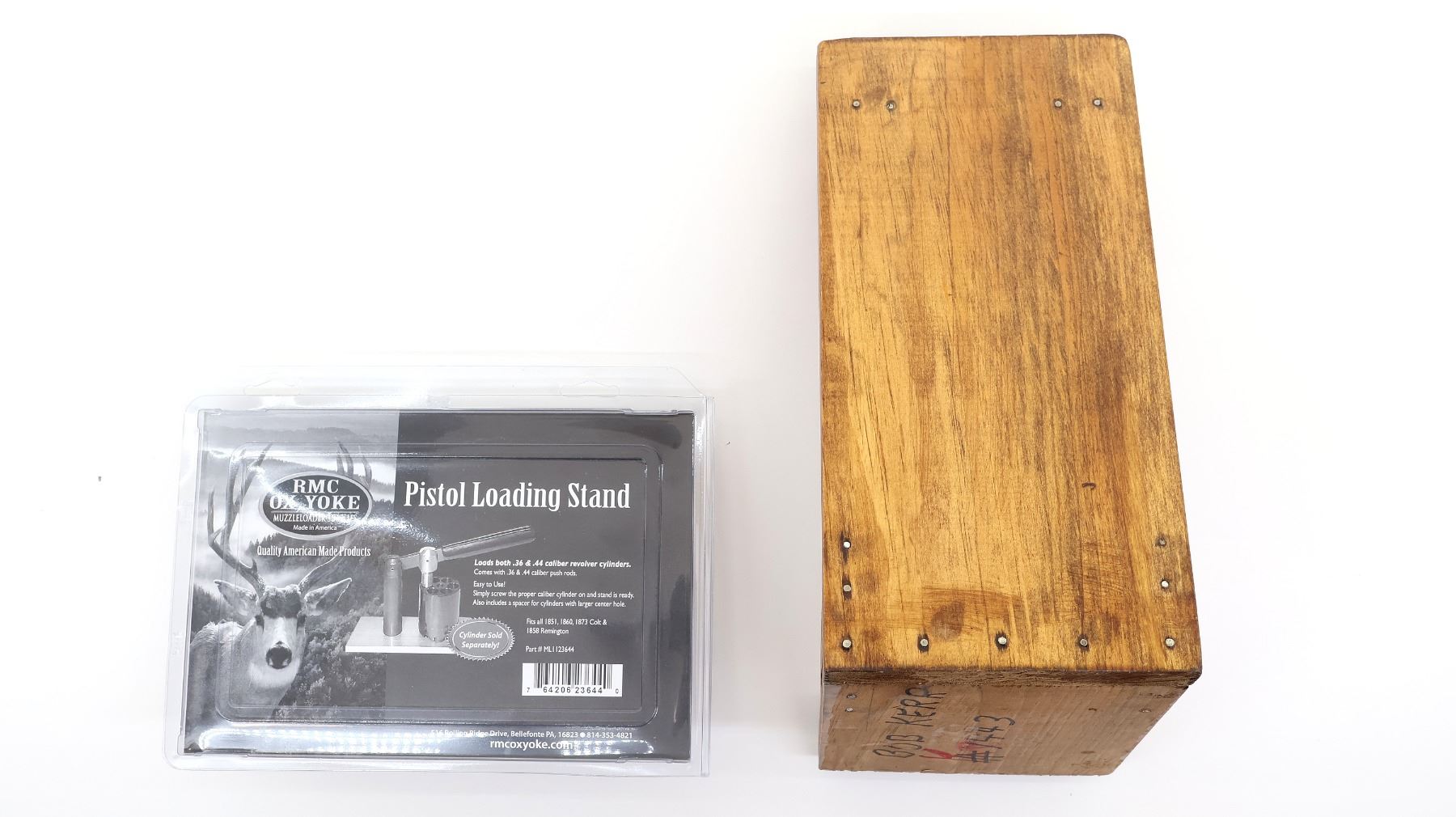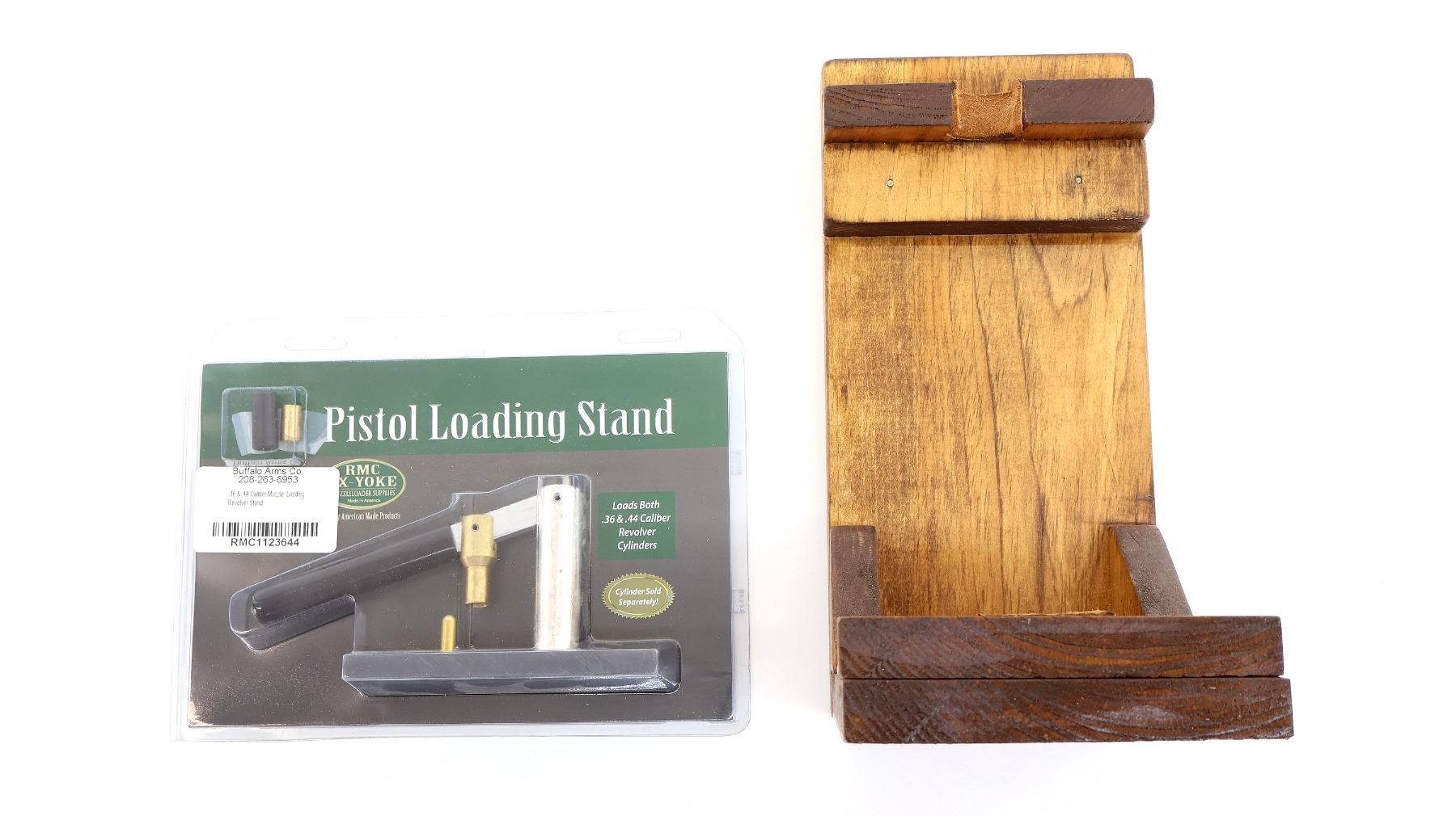 LOT INCLUDES; (1) BUFFALO ARMS CO. PISTOL LOADING STAND, LOADS .36 & .44 CAL. REVOLVER CYLINDERS, ITEM #: RMC1123644, IN ORIGINAL PACKAGING & (1) CUSTOM PISTOL LOADING STAND, WOODEN CONSTRUCTION, UNMARKED, OVERALL LENGTH APPROX. 11.5" X 5.5" X 7.25". SEE PHOTOS.