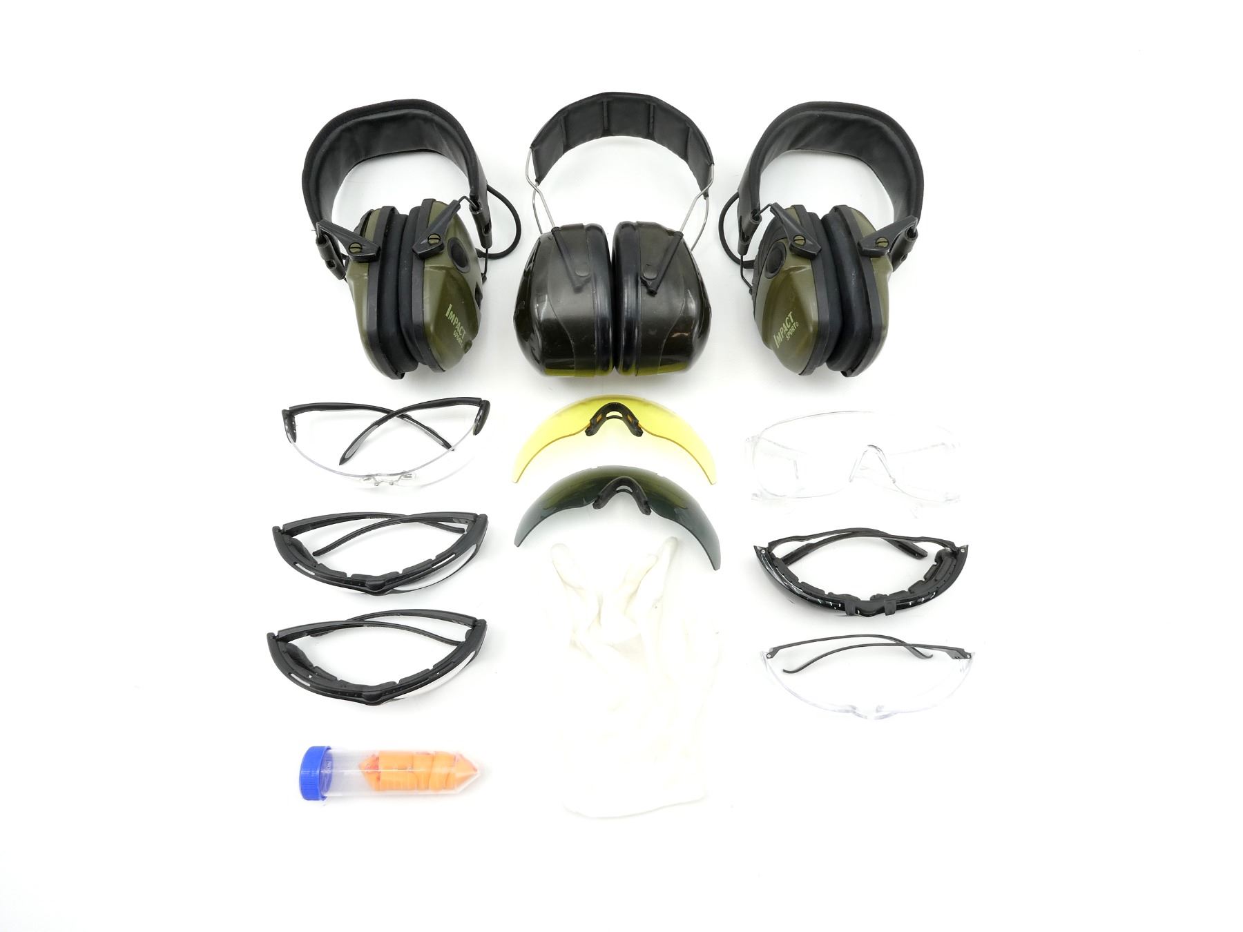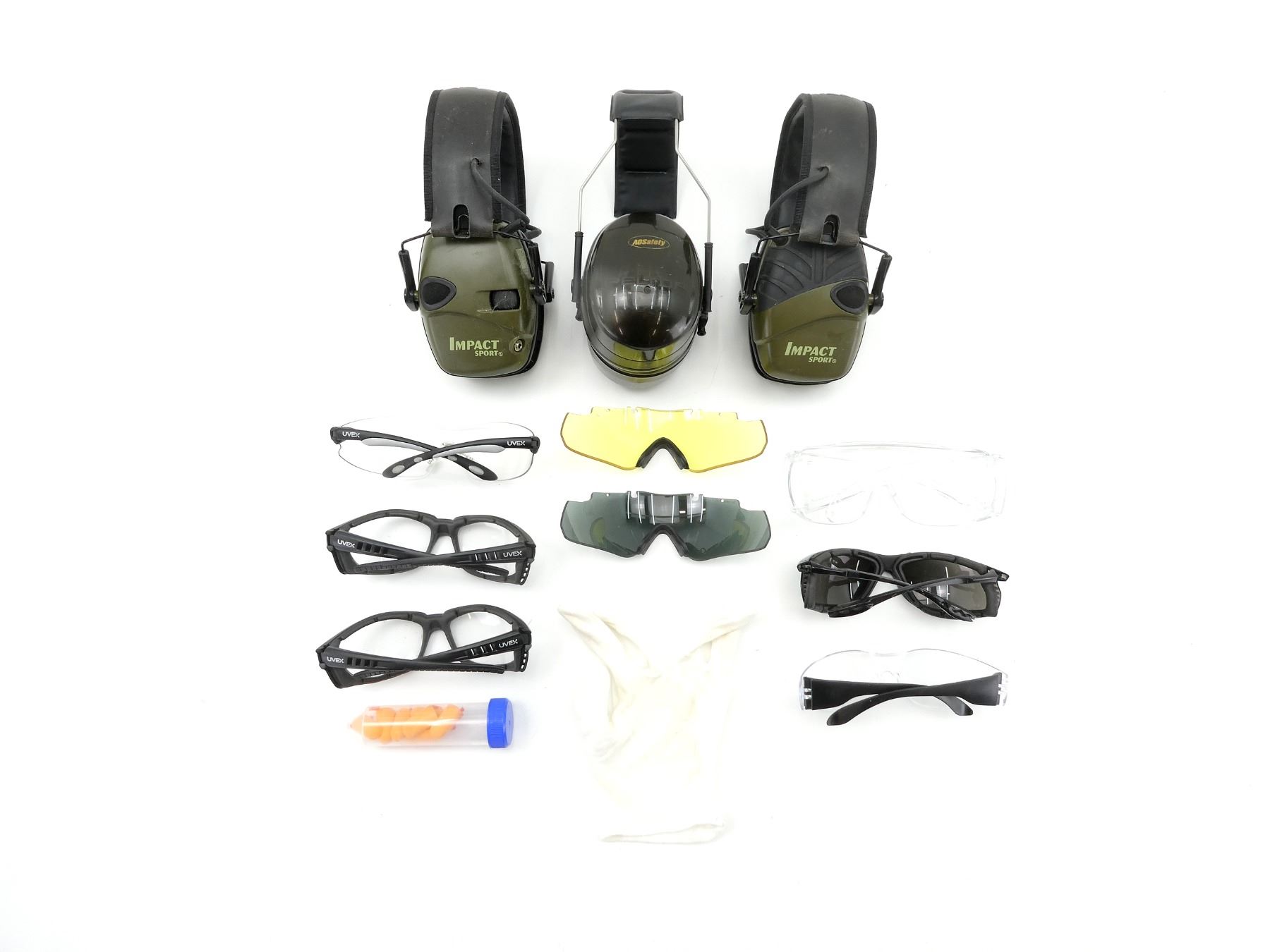 LOT INCLUDES; (6) PAIRS OF SAFETY GLASSES, 1 PAIR TINTED & (2) TINTED SAFETY GLASSES LENSES, (3) PAIRS OF EARMUFFS, 1 PELTOR & 2 SPERIAN, ETC. SEE PHOTOS.