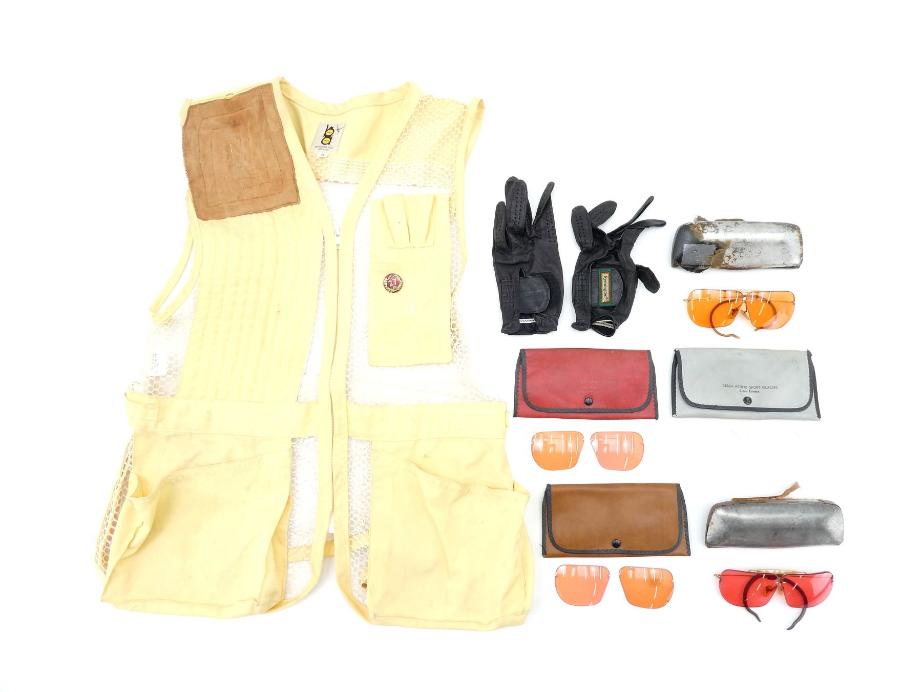 LOT INCLUDES; (1) BOB ALLEN YELLOW MESH HUNTING VEST, SIZE XL, SHOULDER WIDTH APPROX. 17", ZIPPER CLOSURE, (2) LEFT-HANDED REMINGTON LEATHER GLOVES, SIZE S, (2) PAIRS OF DECOT HY-WYD SPORT GLASSES & (3) PAIRS OF DECOT HY-WYD SPORT GLASSES EXTRA LENSES. SEE PHOTOS.