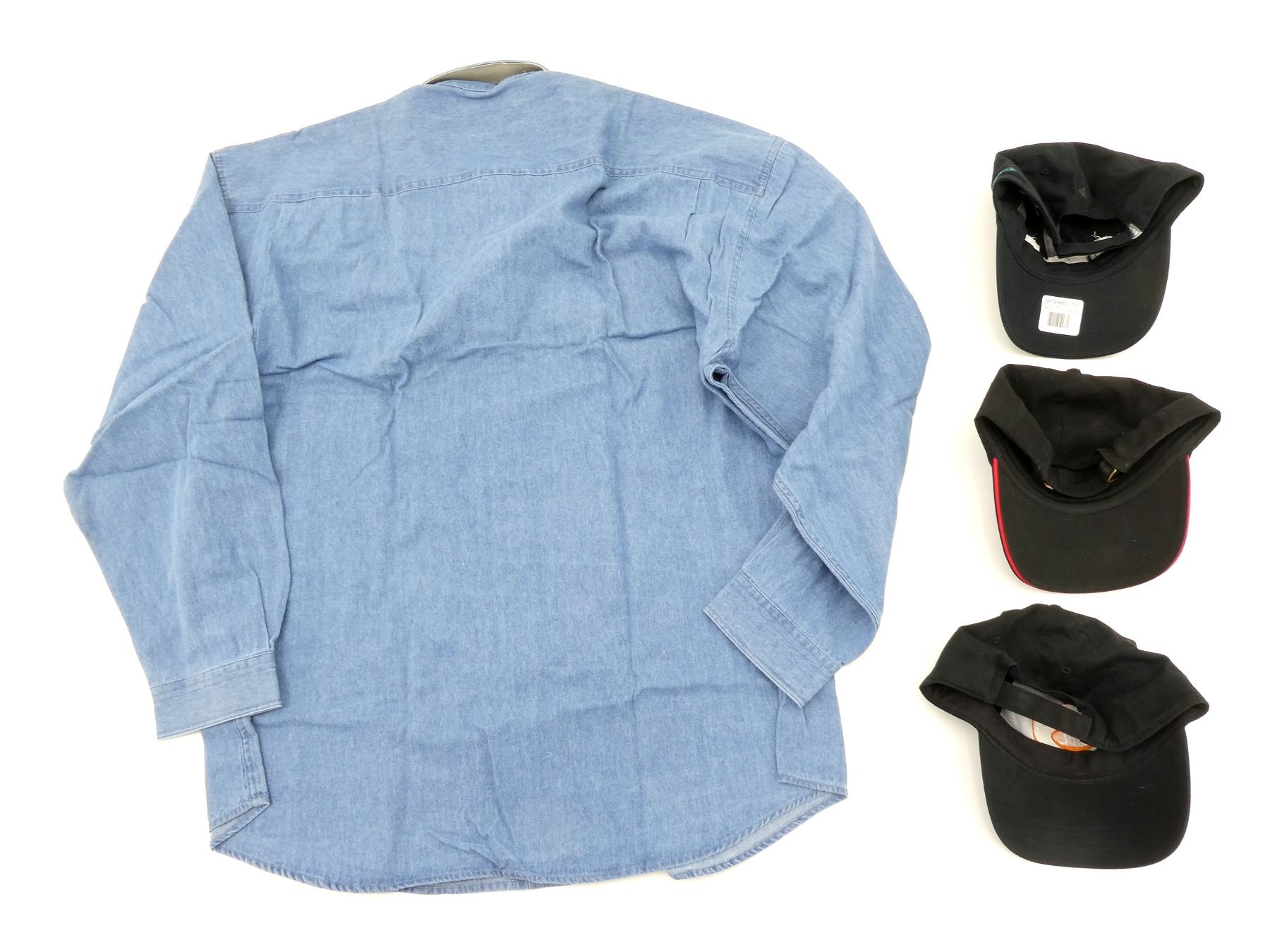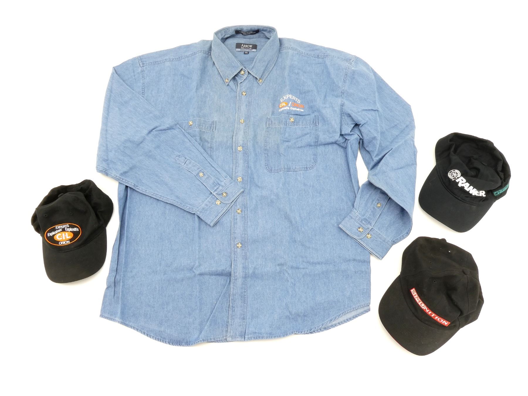 LOT INCLUDES; (1) C-I-L / ORION EXPLOSIVES EXPERTS LONG SLEEVE SHIRT, 100% COTTON, SIZE 2XL, (1) FERSTEN WORLDWIDE SIMUNITION BASEBALL CAP, 100% COTTON, ADJUSTABLE, (1) WINCHESTER RANGER BASEBALL CAP, 100% COTTON, ADJUSTABLE & (1) C-I-L / ORION EXPLOSIVES EXPERTS BASEBALL CAP, 100% COTTON, ADJUSTABLE. SEE PHOTOS.