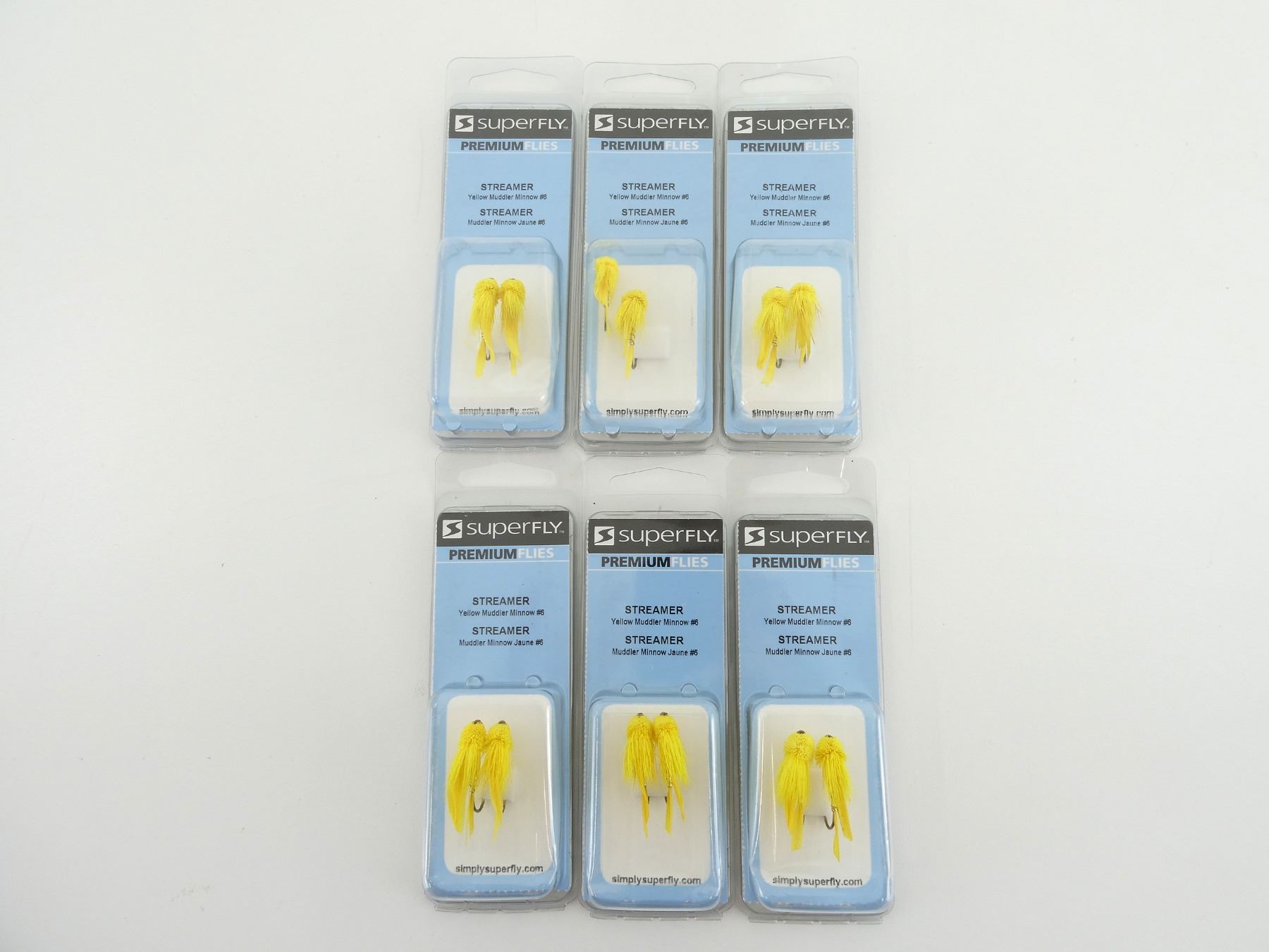 LOT INCLUDES; (6) PACKS OF 2 STREAMERS, YELLOW MUDDLER MINNOW #6, ITEM #: FLY6023-06P, NEW OLD STOCK, IN ORIGINAL PACKAGING. SEE PHOTOS.