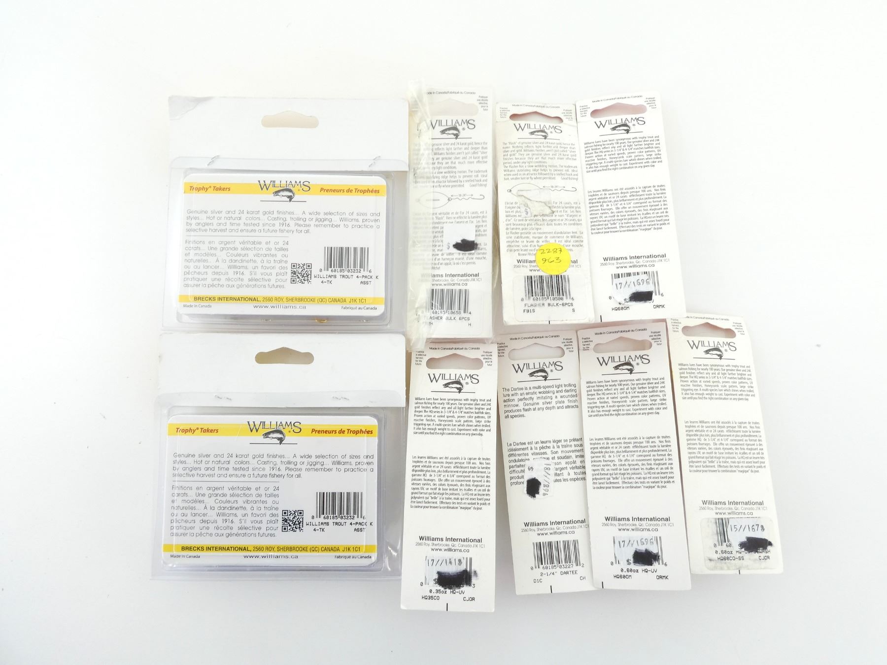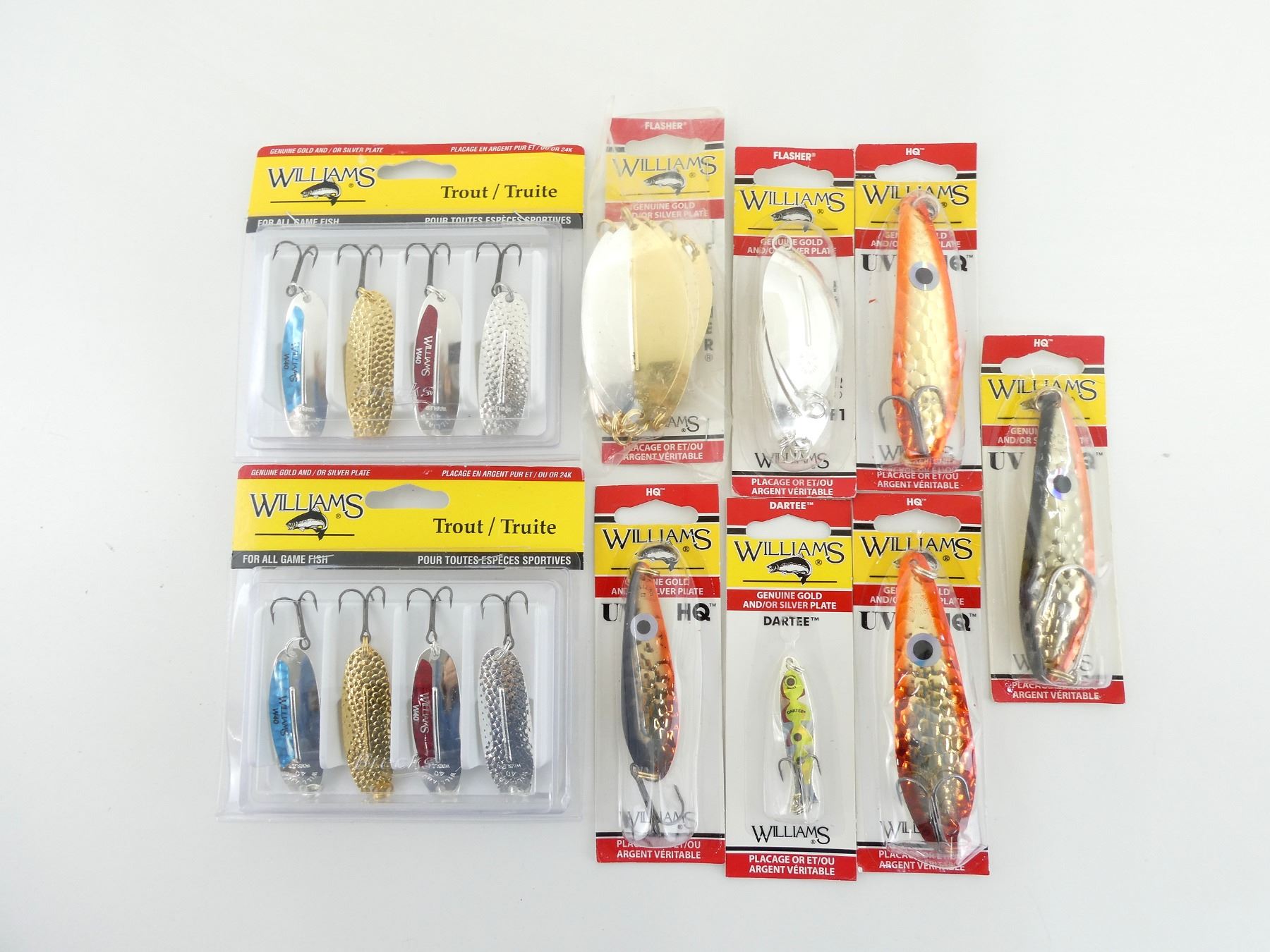 LOT INCLUDES; (2) PACKS OF 4 FISHING LURES FOR TROUT AND ALL GAME FISH, NEW OLD STOCK, SEALED IN ORIGINAL PACKAGING, (1) WILLIAMS DARTEE FISHING LURE, 2 1/4", NEW OLD STOCK, SEALED IN ORIGINAL PACKAGING, (4) WILLIAMS HQ FISHING LURES, 0.60OZ & 0.35OZ, NEW OLD STOCK, SEALED IN ORIGINAL PACKAGING & (2) WILLIAMS FLASHERS, 6 PIECES, NEW OLD STOCK, SEALED IN ORIGINAL PACKAGING. SEE PHOTOS.
