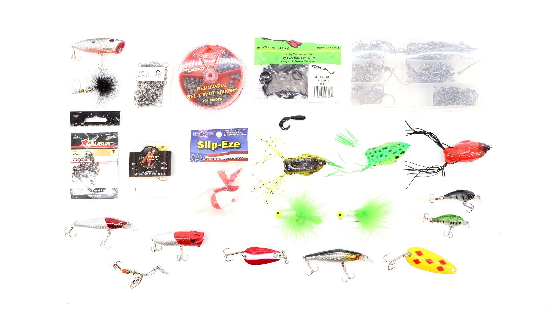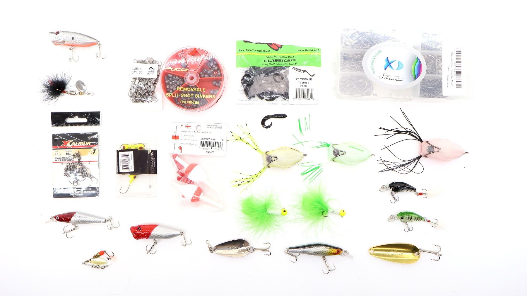 LOT INCLUDES; (1) JSHANMEI 150-PIECE BOX OF CIRCLE HOOKS, SIZE 1-5/0, NEW OLD STOCK, SEALED IN ORIGINAL PACKAGING, (1) BIG WORM FISHING BARREL SWIVELS, 30 PIECES, SIZE 6, NEW OLD STOCK, SEALED IN ORIGINAL PACKAGING, (1) XCALIBUR INTERLOCK BARREL SWIVELS, 8 PIECES, SIZE 7, TEST 35LB, TENSION 16KG, ITEM #: SSBSS-7-X, APPEARS NEW OLD STOCK, IN ORIGINAL PACKAGING, (1) MATZUO JIG HEADS, 1/8OZ, 3.5G, NEW OLD STOCK, SEALED IN ORIGINAL PACKAGING, (1) PACK OF DOUBLE X TACKLE SLIP-EZE BOBBERS, 3", ITEM #: SEA-2R, NEW OLD STOCK, SEALED IN ORIGINAL PACKAGING, (1) PUCCI REMOVABLE SPLIT SHOT SINKERS, 124 PIECES, MAY NOT BE COMPLETE / PIECES MAY BE MISSING, (1) PACK OF BRECKS MISTER TWISTER 2" TEENIE LURES, 20 PACK, ITEM #: TT20M-3, MAY NOT BE COMPLETE / PIECES MAY BE MISSING & (14) ASSORTED FISHING LURES. SEE PHOTOS.