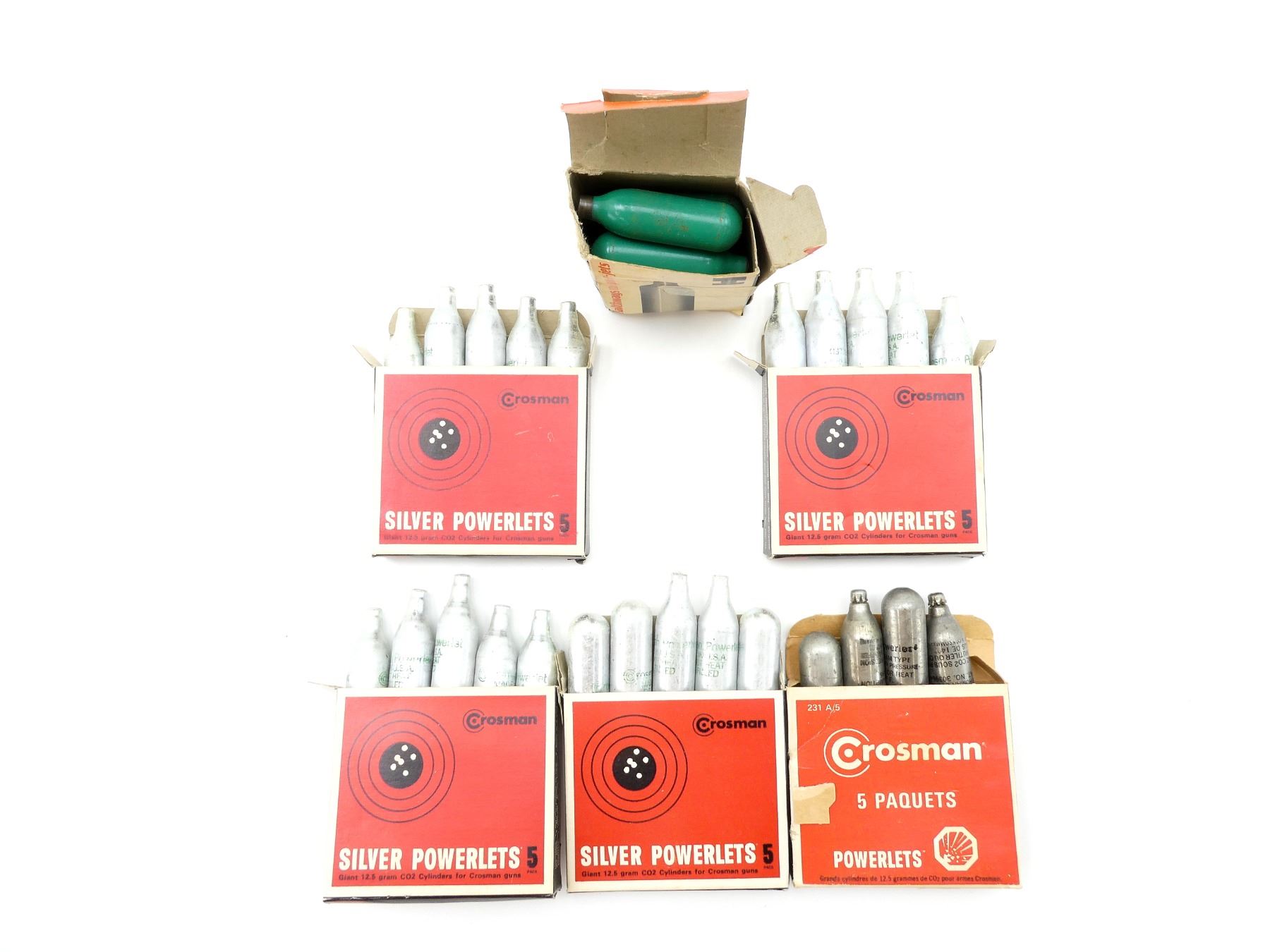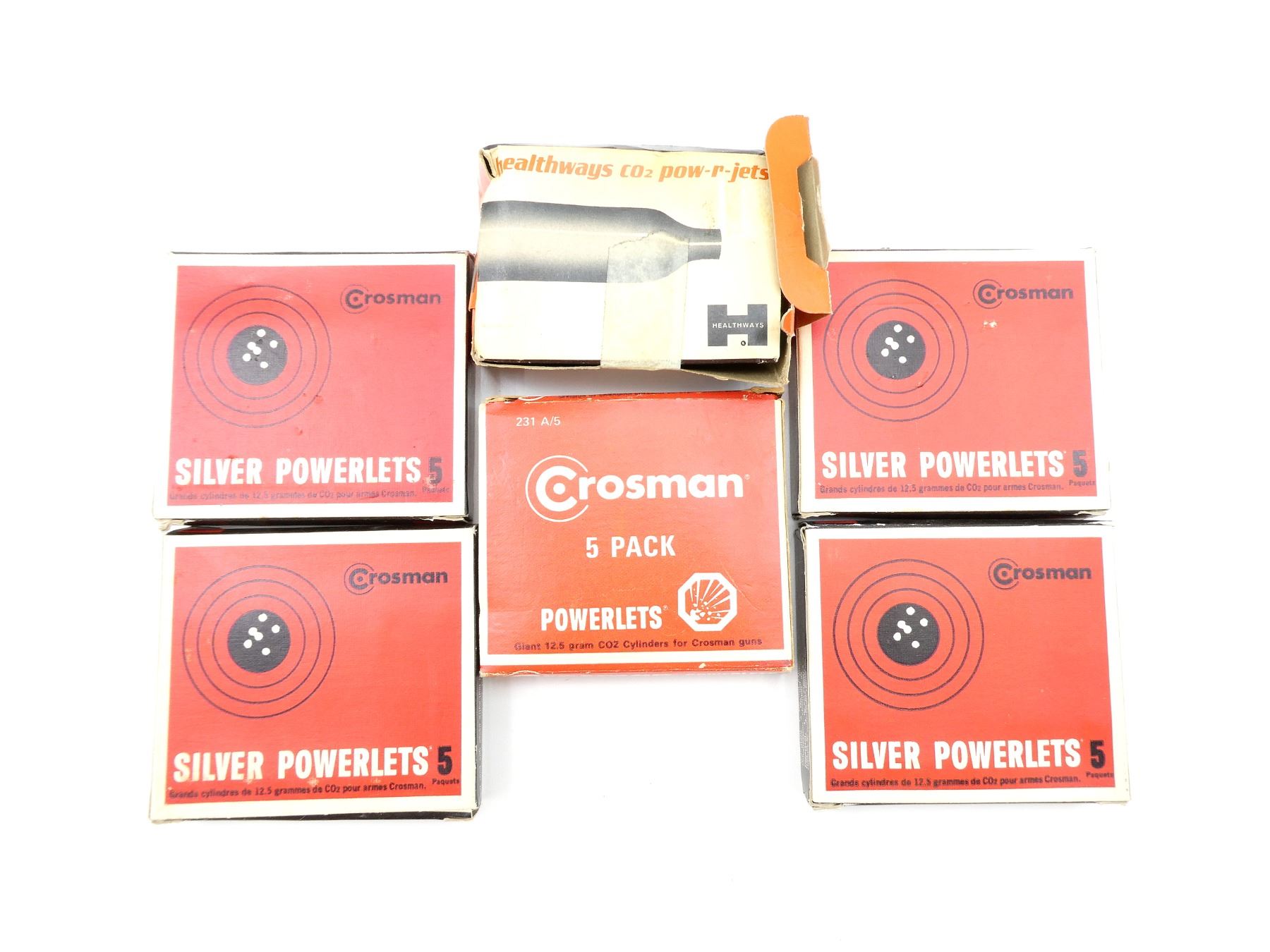 LOT INCLUDES; (5) PACKS OF 5 CROSMAN SILVER CO2 POWERLETS, 12.5 GRAM CYLINDERS, MAY NOT BE COMPLETE / PIECES MAY BE MISSING & (1) PACK OF 10 HEALTHWAYS CO2 "POW-R-JETS", 8.5 GRAM CYLINDERS, MAY NOT BE COMPLETE / PIECES MAY BE MISSING. SEE PHOTOS.