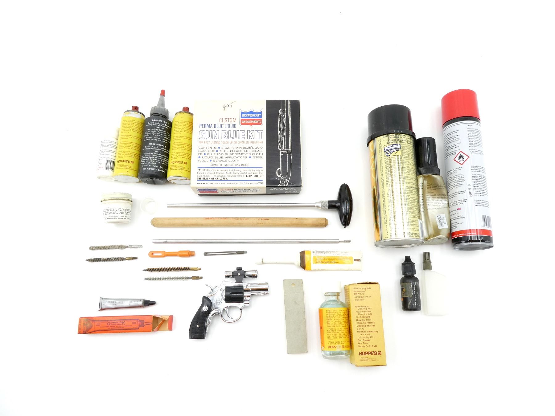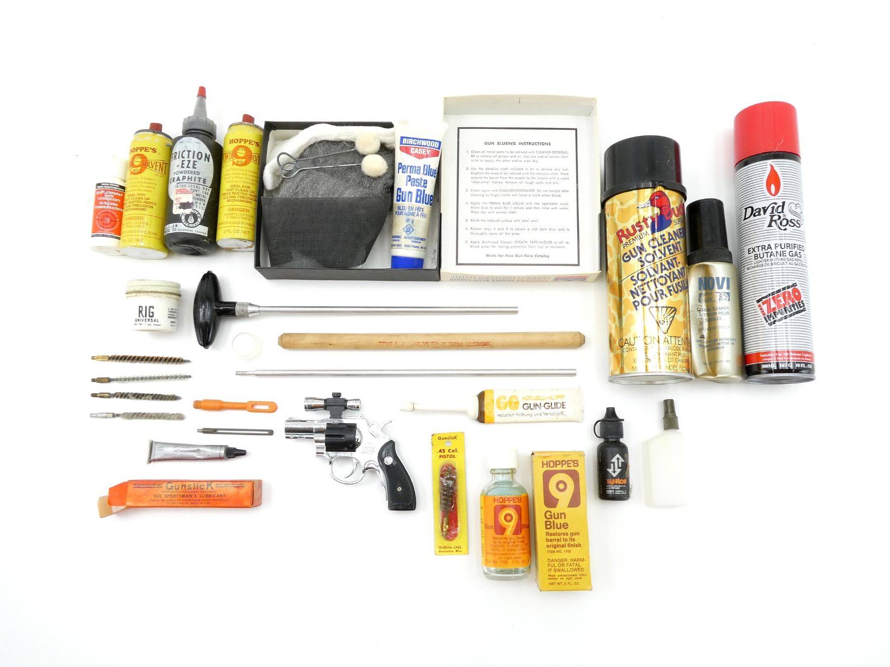 LOT INCLUDES; (1) BIRCHWOOD CASEY CUSTOM GUN BLUE KIT, INCLUDES; APPLICATORS, STEEL WOOL, CLOTH, ETC., MAY NOT BE COMPLETE / PIECES MAY BE MISSING, (1) HOPPE'S GUN BLUE, (2) HOPPE'S POWDER SOLVENT, MAY NOT BE COMPLETE / PIECES MAY BE MISSING, (1) GUNSLICK LUBRICANT, (1) KRIEGHODD GUN-GLIDE, (1) FRICTION-EZE POWDERED GRAPHITE, (1) RUSTY DUCK PREMIUM GUN CLEANER SOLVENT & (1) DAVID ROSS EXTRA PURIFIED BUTANE GAS, ETC. SEE PHOTOS.