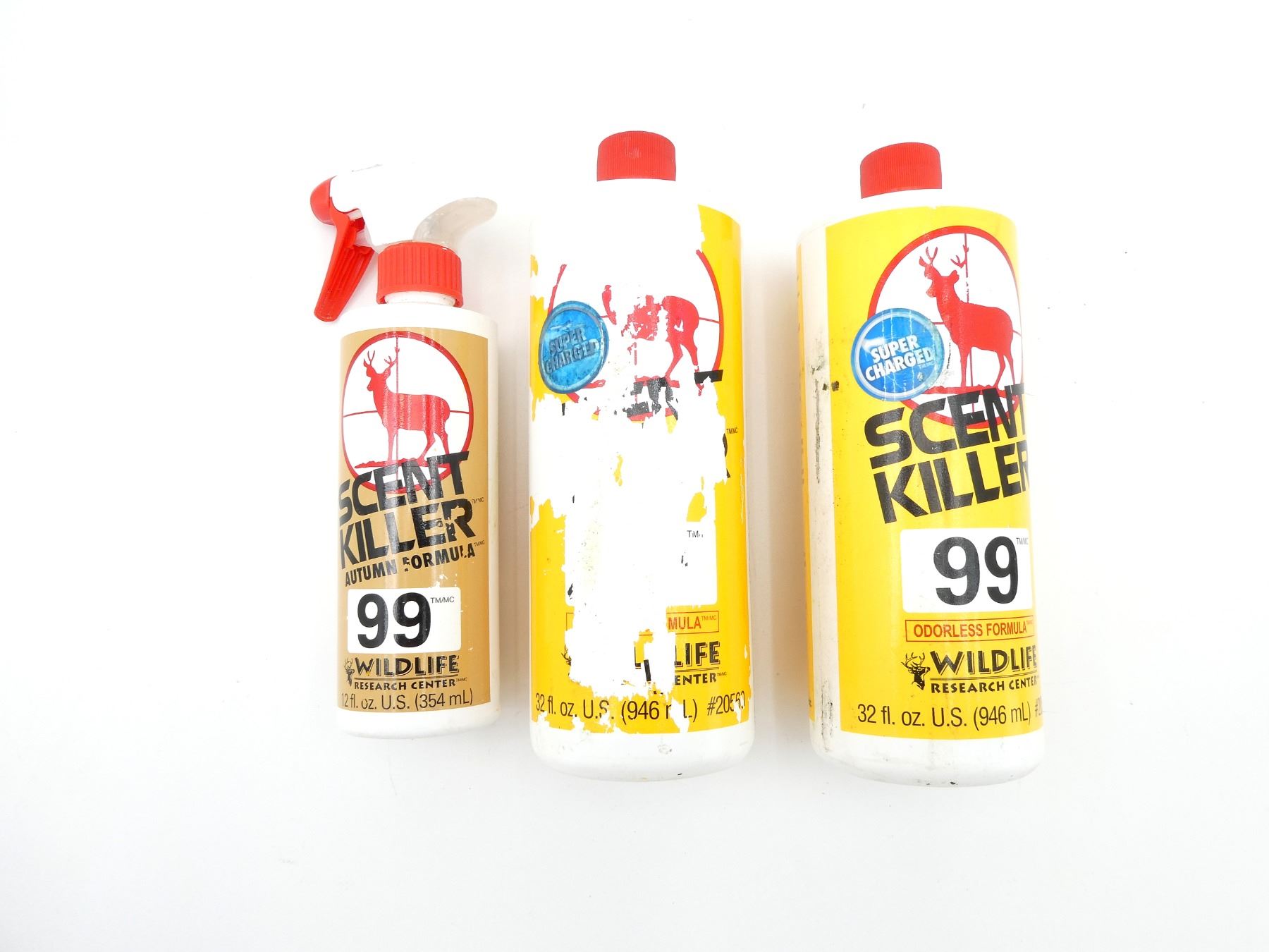 LOT INCLUDES; (2) SUPERCHARGED SCENT KILLER 99, ODORLESS FORMULA, 32FL OZ (946ML), ITEM #: 20560, MAY NOT BE COMPLETE / SOME FLUID MAY BE MISSING & (1) SCENT KILLER 99, AUTUMN FORMULA, 12FL OZ (354ML), SPRAY BOTTLE CONTAINER, MAY NOT BE COMPLETE / SOME FLUID MAY BE MISSING. SEE PHOTOS.