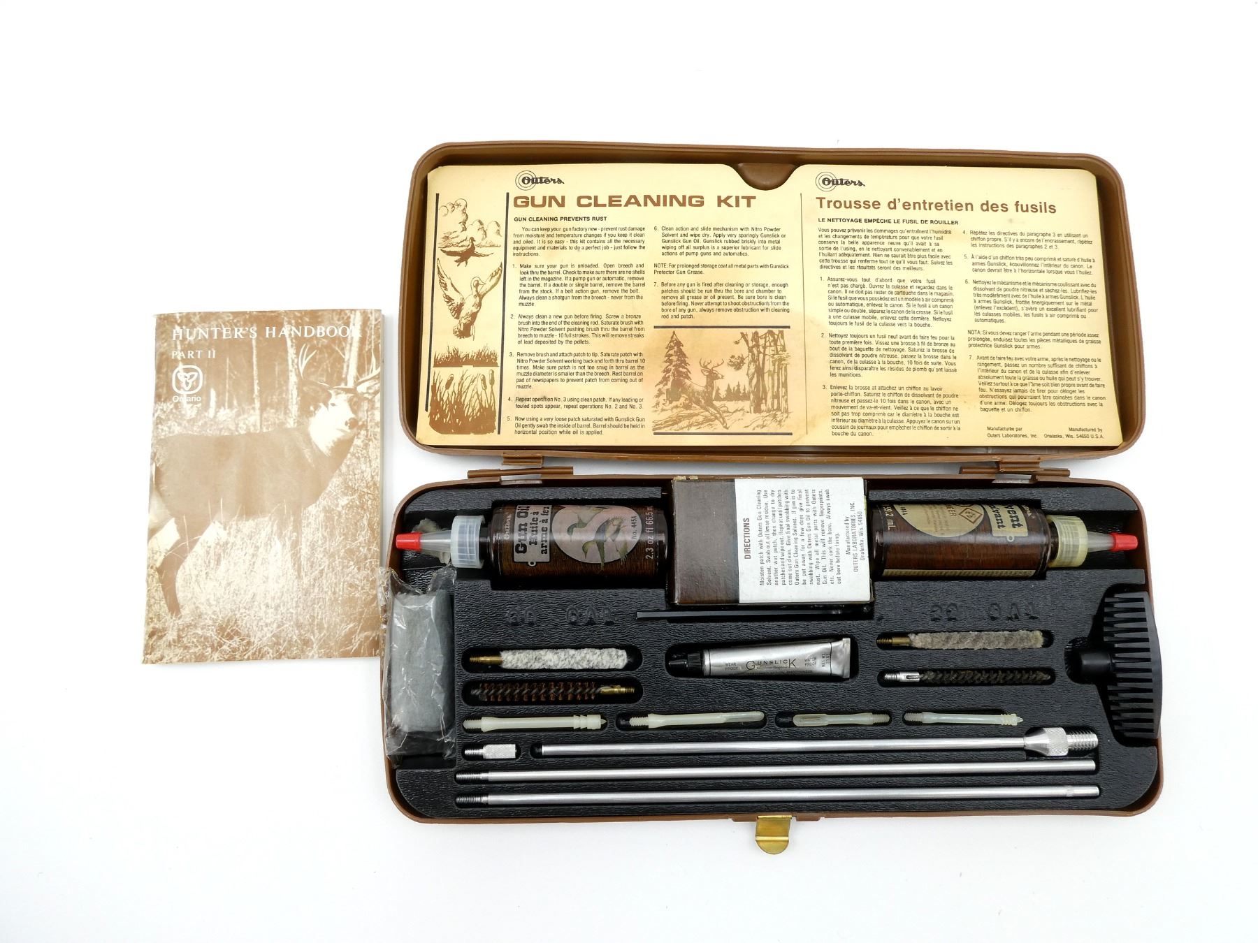 LOT INCLUDES; (1) OUTERS RIFLE CLEANING KIT, INCLUDES; 3-PIECE CLEANING ROD, JAGS, BRUSHES, MOPS, PATCHES, GUN OIL, ETC., MAY NOT BE COMPLETE / SOME PIECES OR FLUID MAY BE MISSING & (1) "HUNTER'S HANDBOOK" PART II, BY ONTARIO MINISTRY OF NATURAL RESOURCES, SOFT COVER, COPYRIGHT 1979. SEE PHOTOS.
