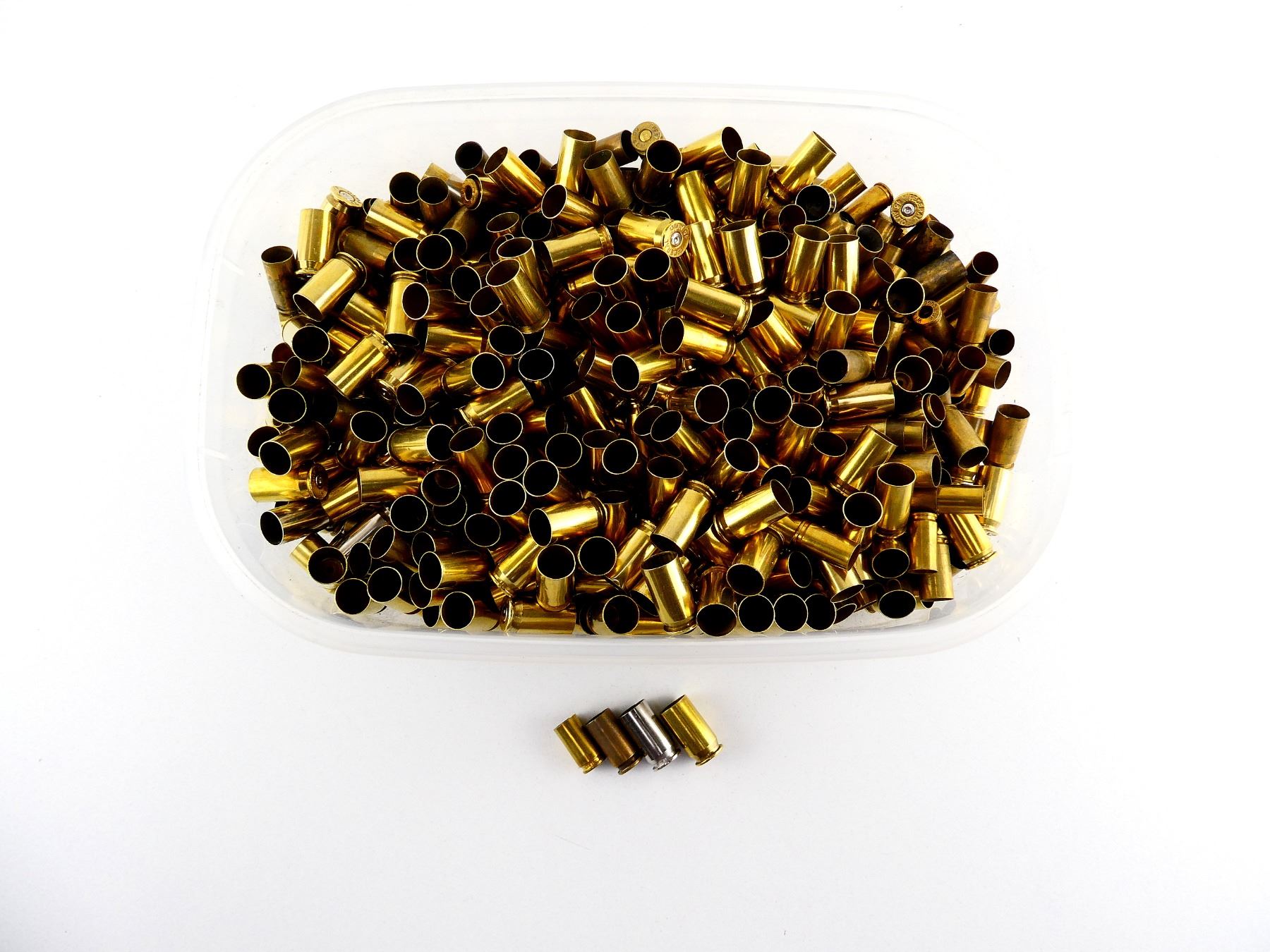 LOT INCLUDES; APPROX. 6 LBS NON-PRIMED CASES, VARIOUS CALIBERS INCLUDING; 9MM LUGER, .40 S&W, .45 ACP, ETC.