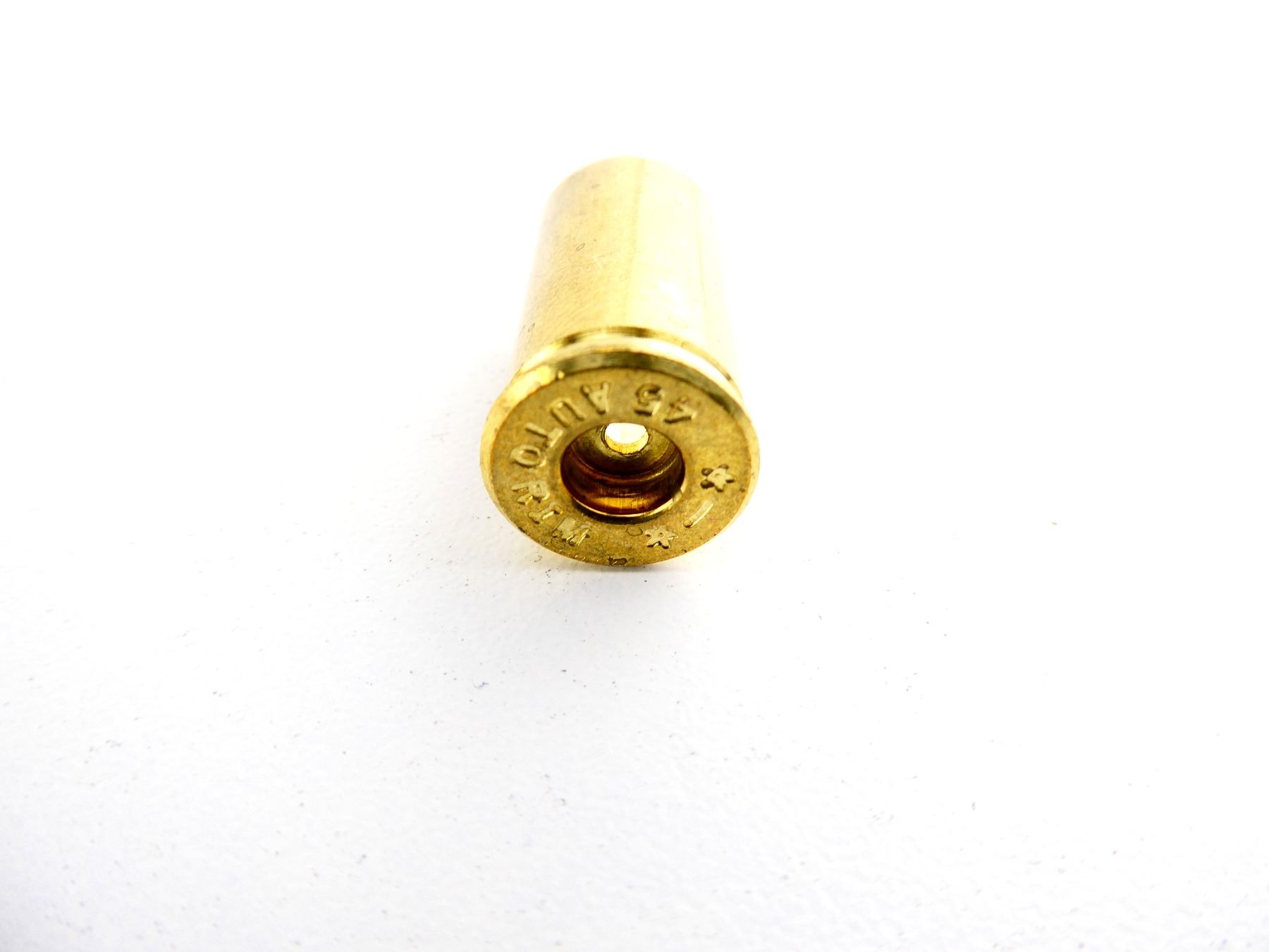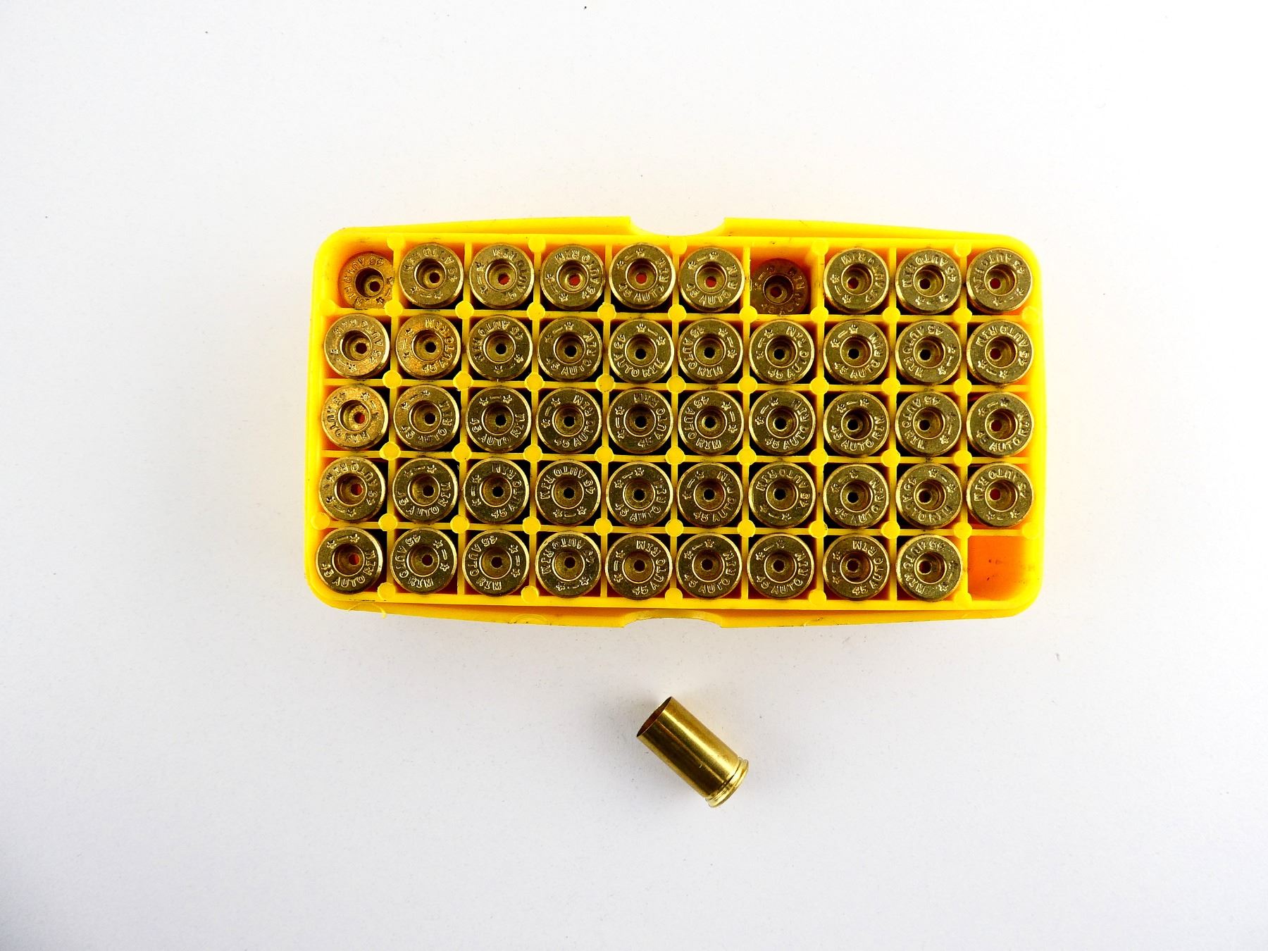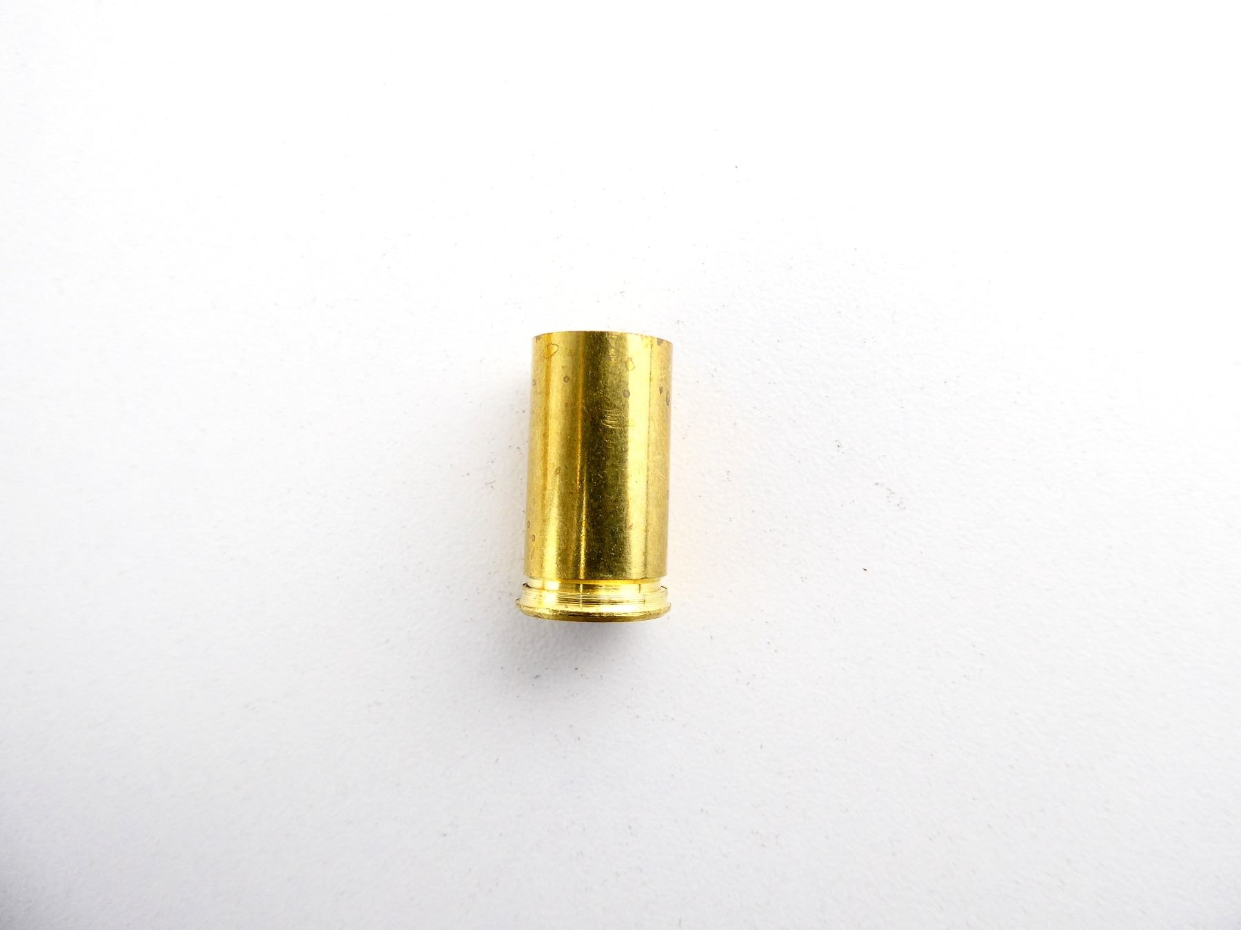 LOT INCLUDES; APPROX. (50) NEW NON-PRIMED BRASS CASES, MADE FROM .45 AUTO RIM BRASS CASES, CONSIGNOR STATES; "APPROX. OVERALL LENGTH IS .887" & APPROX. RIM THICKNESS .040", RIM IS PROPERLY TURNED FROM THE MOUTH DOWN", (1) FLAMBEAU HANDGUN .45 & .44 CAL PLASTIC AMMO BOX.