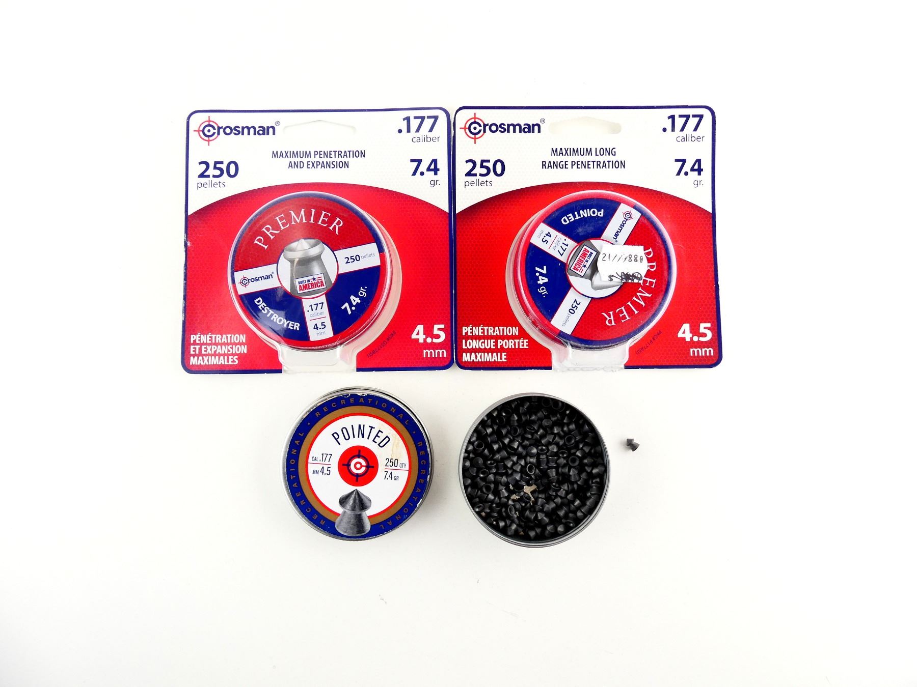 LOT INCLUDES; APPROX. (700) PELLETS, 7.4 GRNS (STATED ON TINS NOT CONFIRMED), POINTED & DESTROYER, (2) UNOPENED.