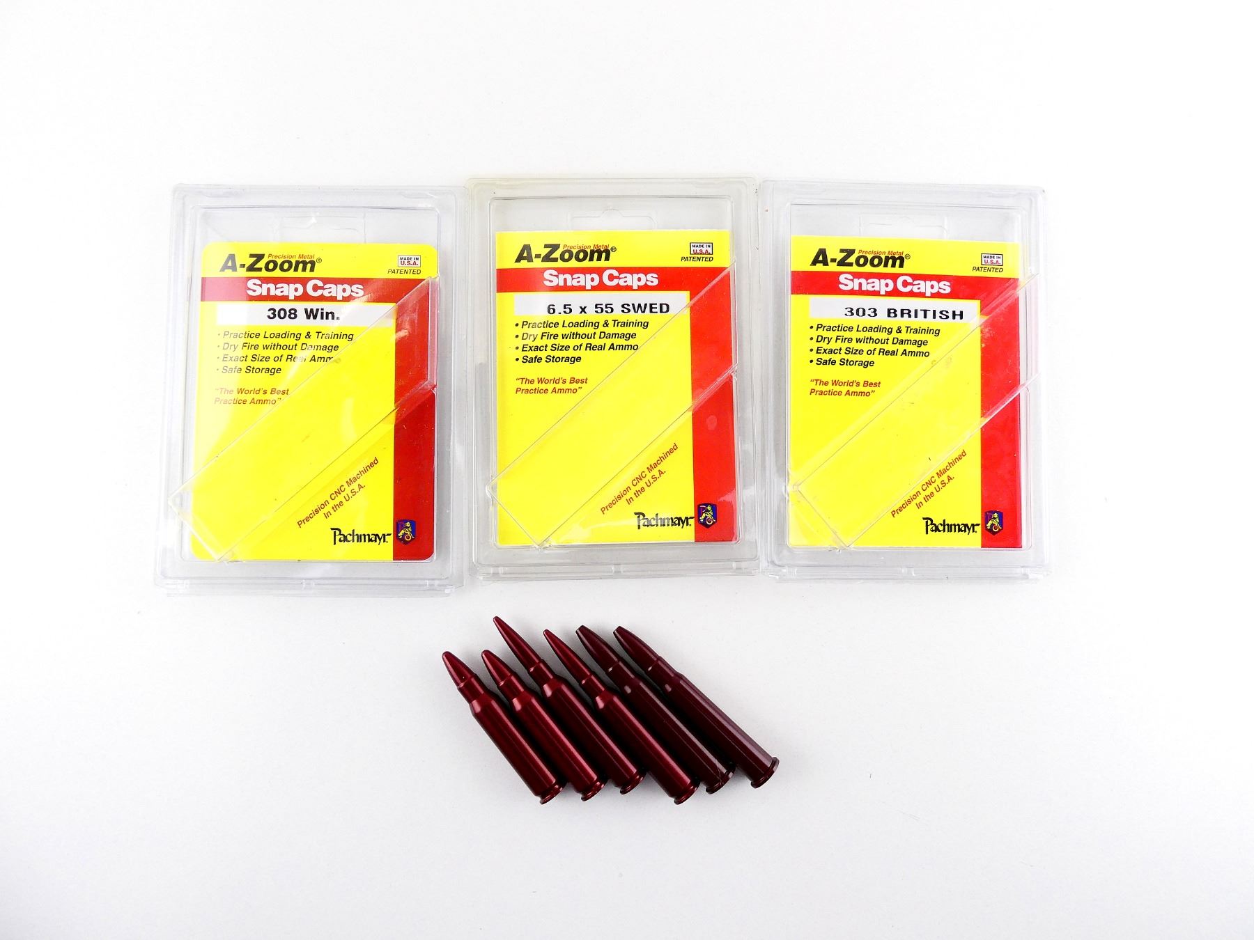 LOT INCLUDES; APPROX. (6) SNAP CAPS, VARIOUS CALIBERS INCLUDING; 6.5X55 SWEDISH, .308 WIN, .303 BR.