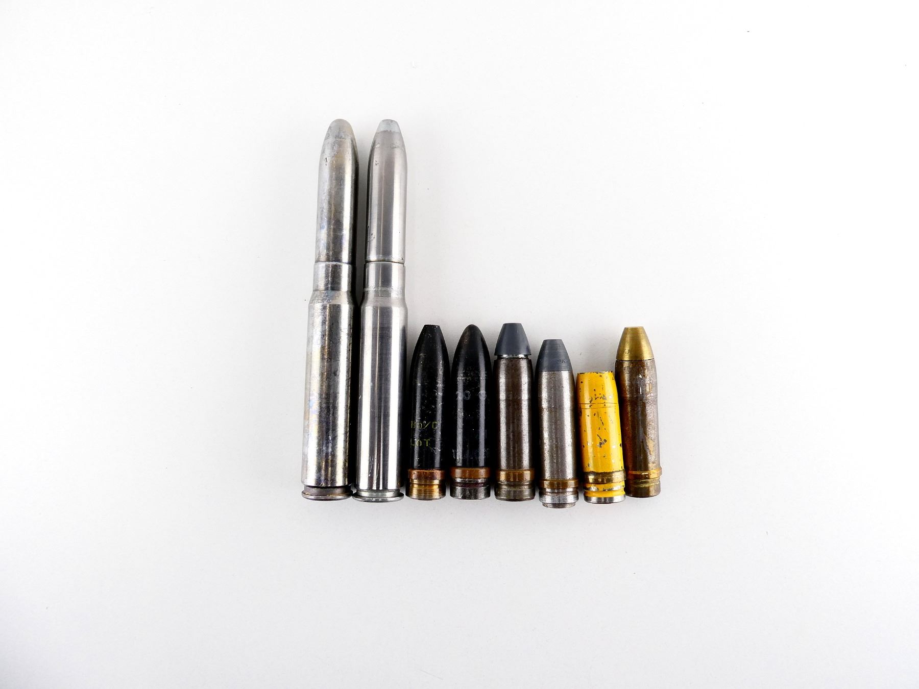 LOT INCLUDES; APPROX. (2) DRILL RNDS, VARIOUS HEADSTAMPS, (6) PROJECTILES, VARIOUS MARKINGS & COLORS, (1) IS A CUT AWAY.