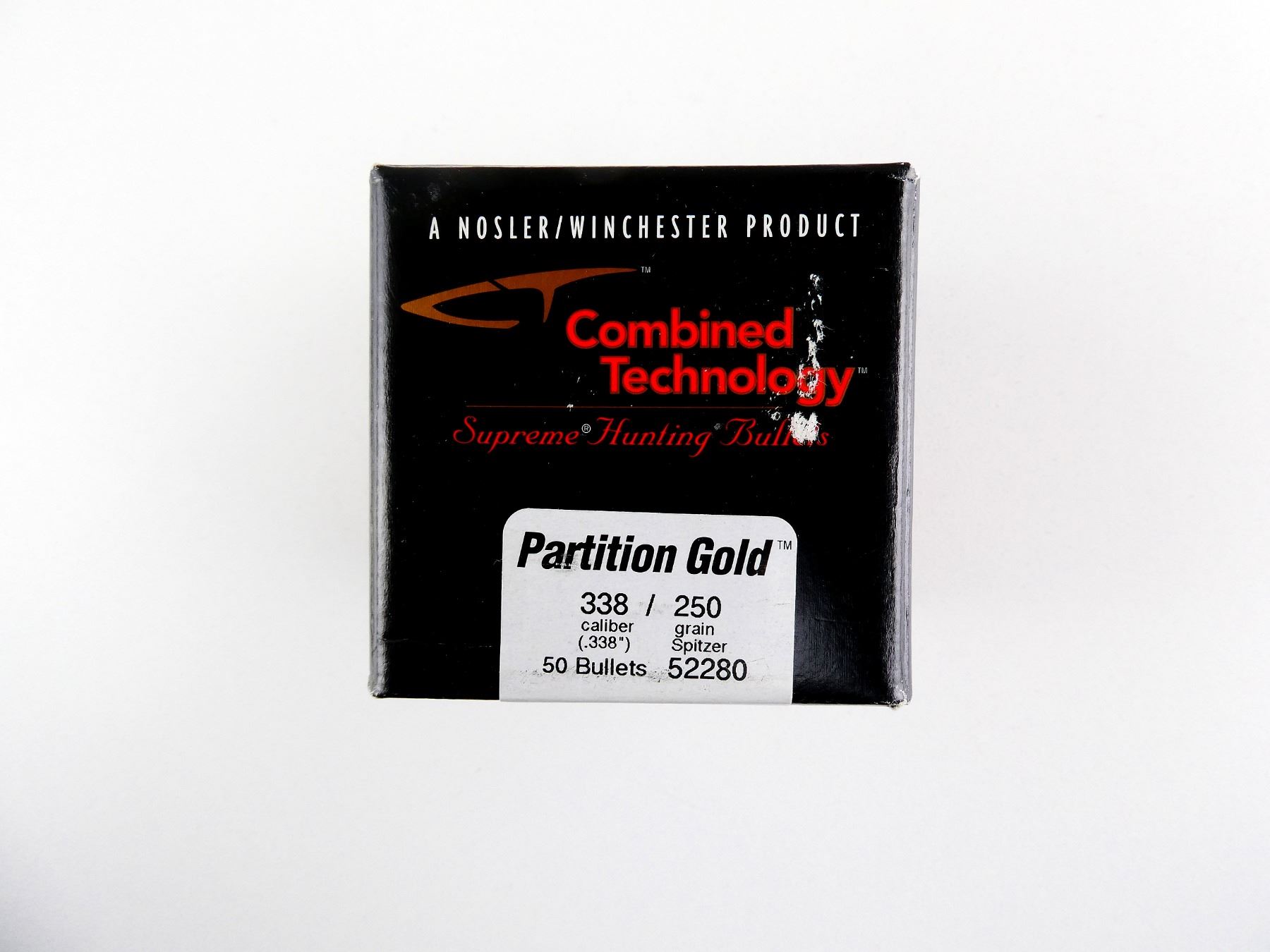 LOT INCLUDES; APPROX. (50) BULLETS. APPROX. DIA .338", 250 GRNS (STATED ON BOX NOT CONFIRMED) SPITZER, PARTITION GOLD, UNOPENED.