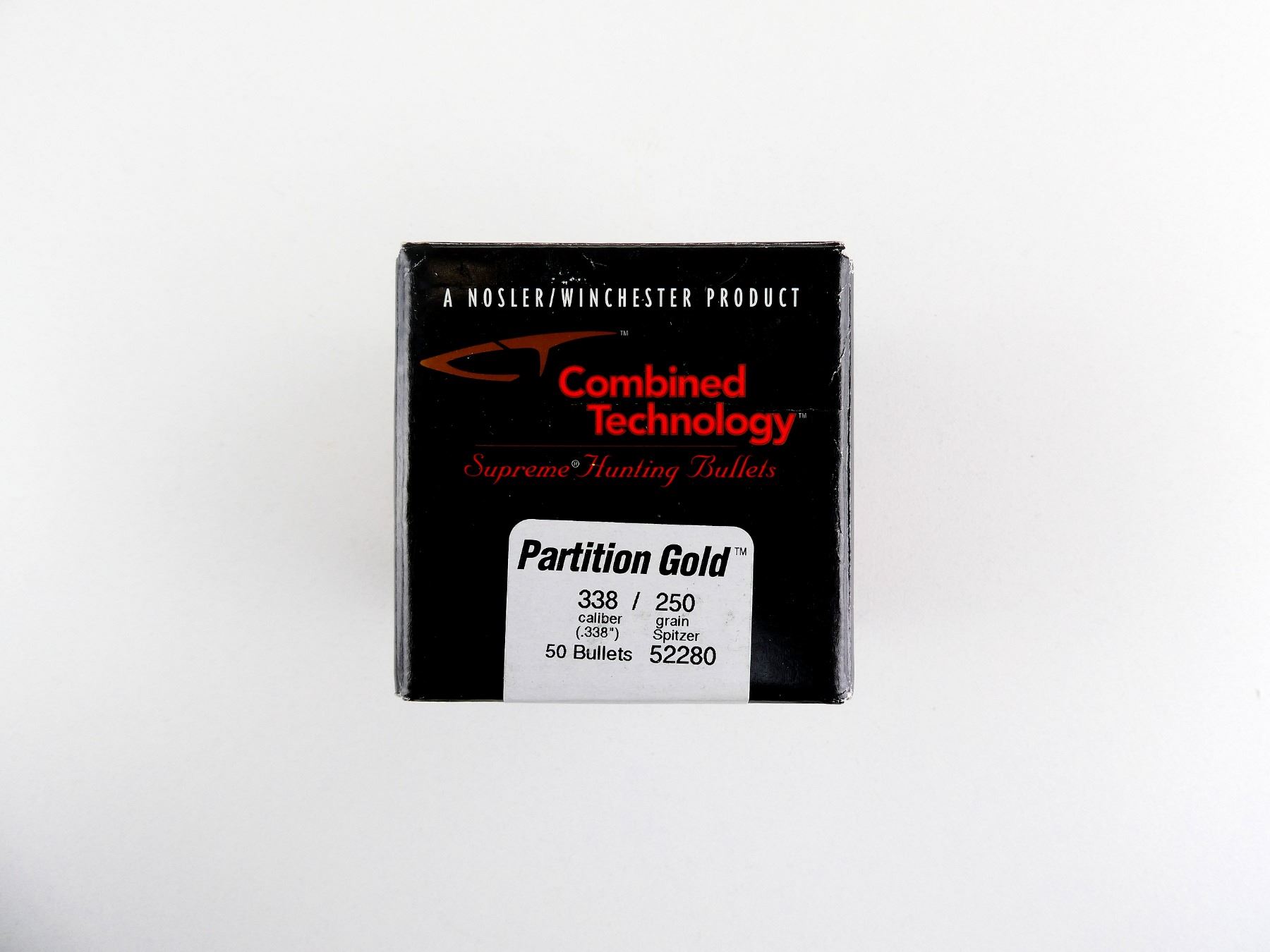 LOT INCLUDES; APPROX. (50) BULLETS. APPROX. DIA .338", 250 GRNS (STATED ON BOX NOT CONFIRMED) SPITZER, PARTITION GOLD, UNOPENED.