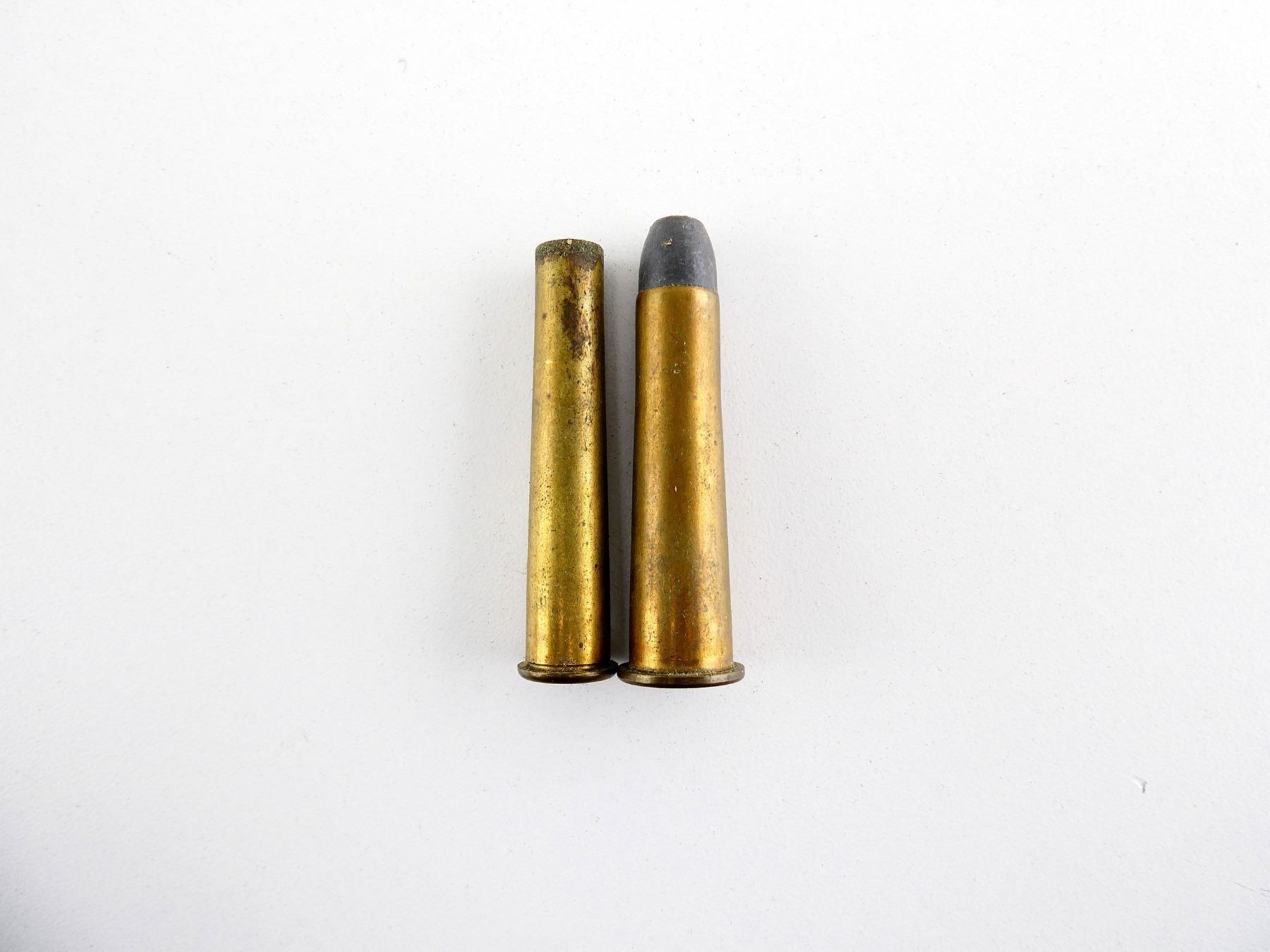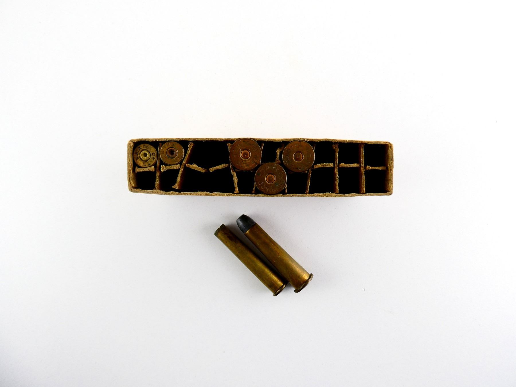 LOT INCLUDES; APPROX. (4) RNDS, (3) NON-PRIMED BRASS CASES, IN COLLECTIBLE BOX, SHOWS SOME WEAR, SEE PHOTOS.