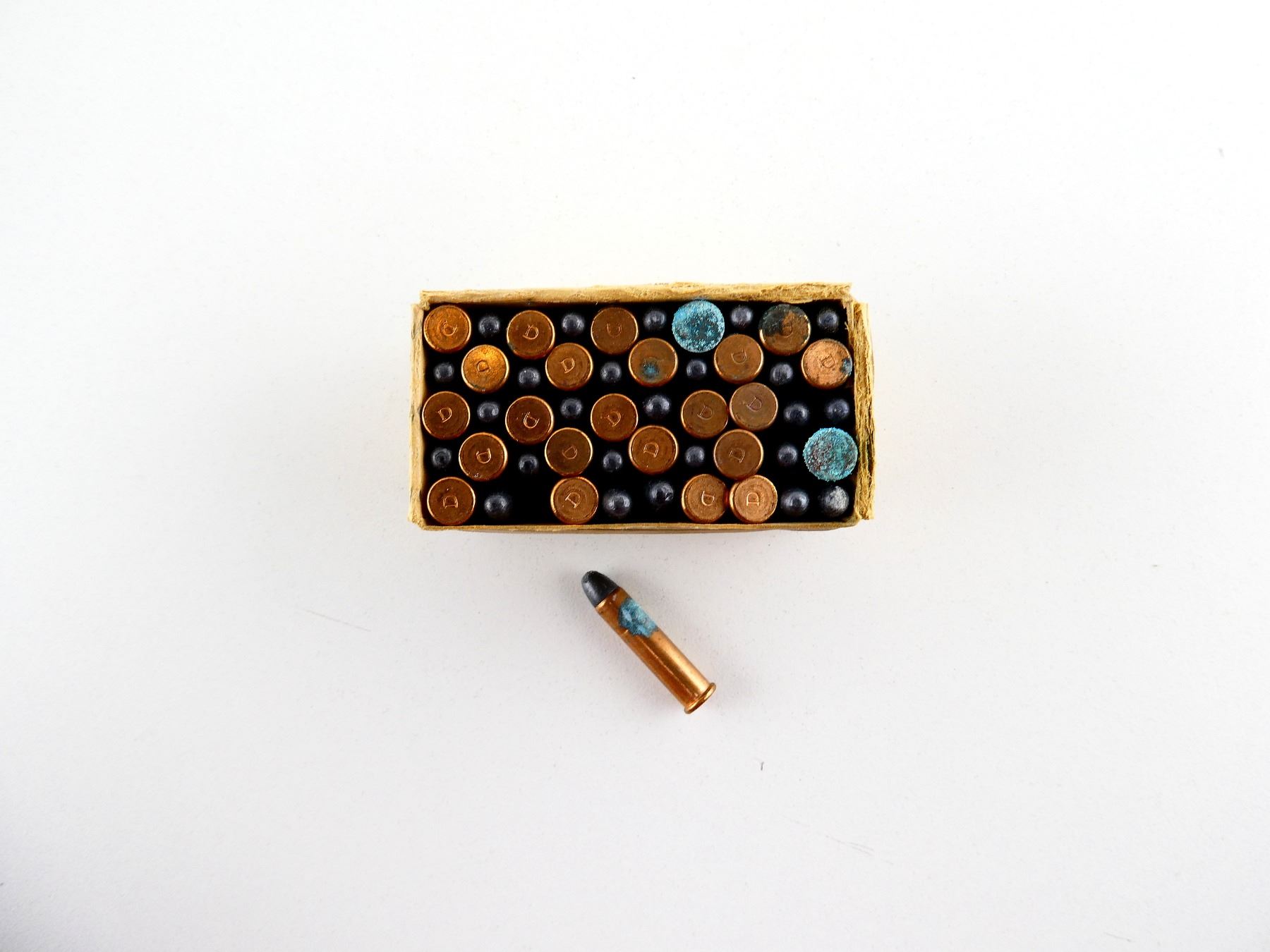 LOT INCLUDES; APPROX. (50) RNDS, 45 GRNS (STATED ON BOX NOT CONFIRMED), LEAD BULLET, SOME CORROSION, IN ORIGINAL COLLECTIBLE BOX, SHOWS SOME WEAR, SEE PHOTOS.