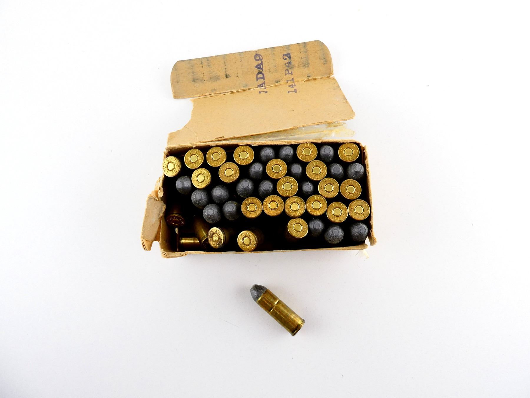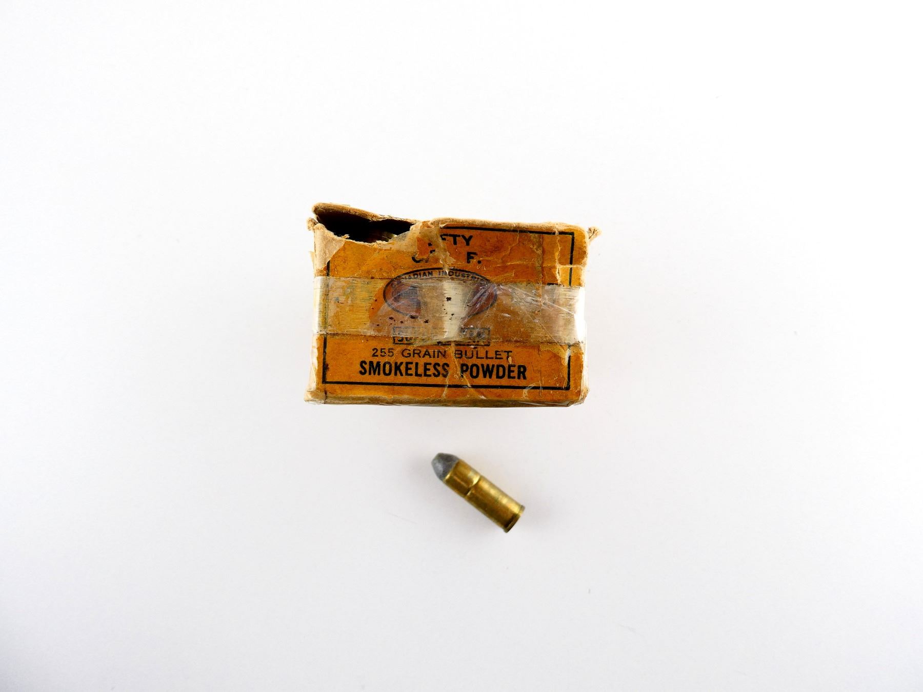 LOT INCLUDES; APPROX. (44) RNDS, 255 GRNS (STATED ON BOX NOT CONFIRMED), LEAD, SMOKELESS POWDER, IN ORIGINAL COLLECTIBLE BOX, IS DAMAGED, SEE PHOTOS.